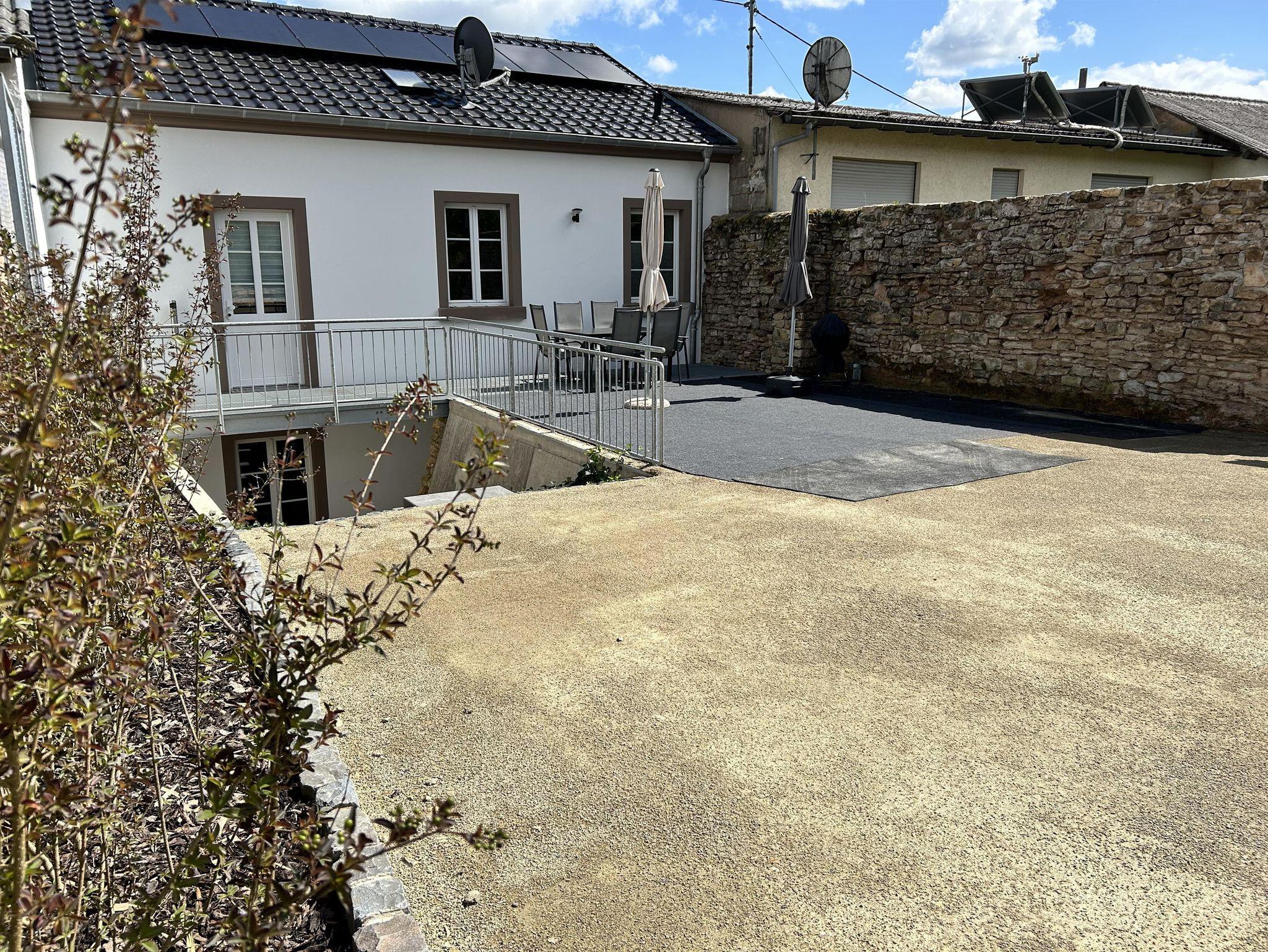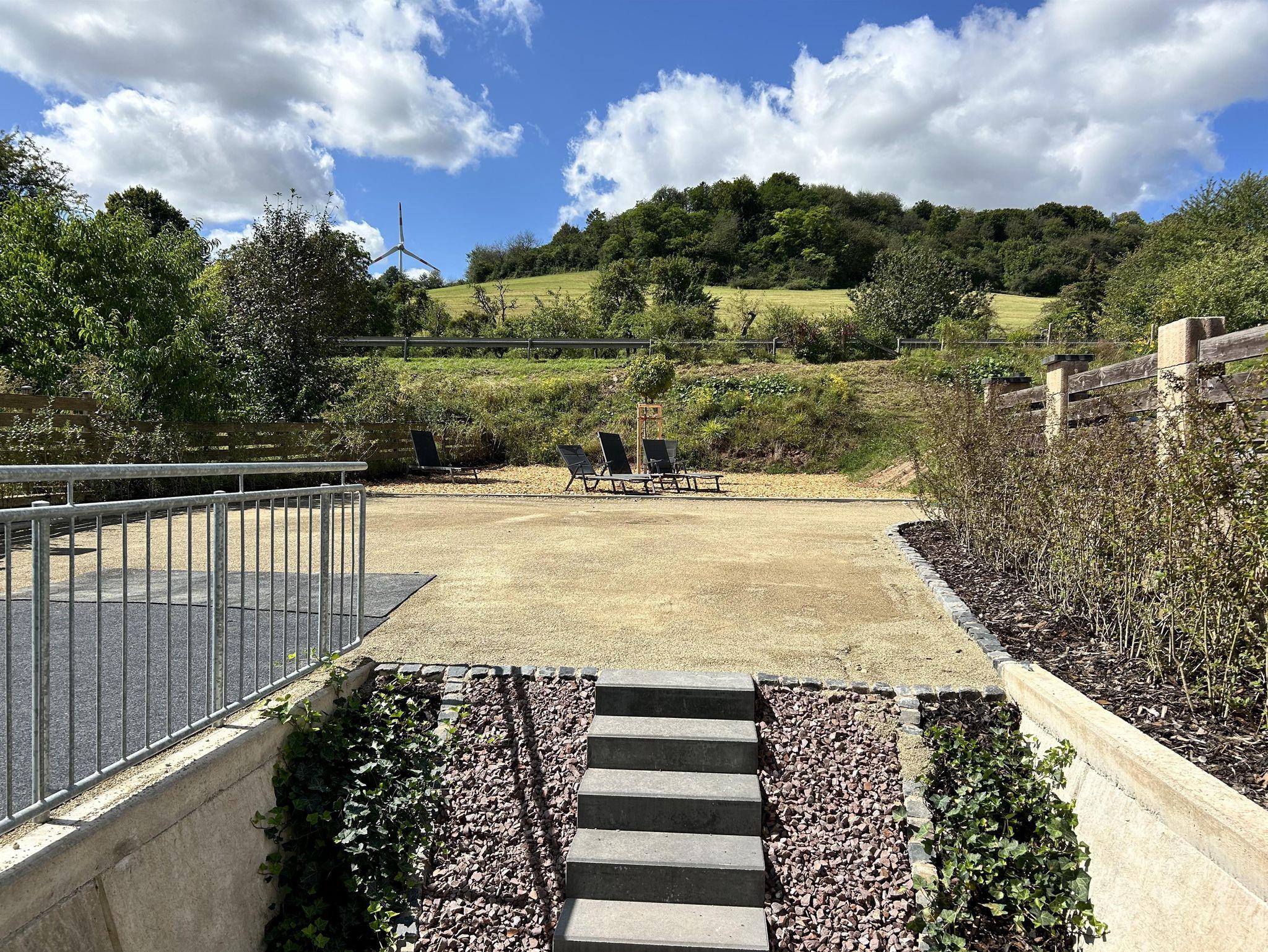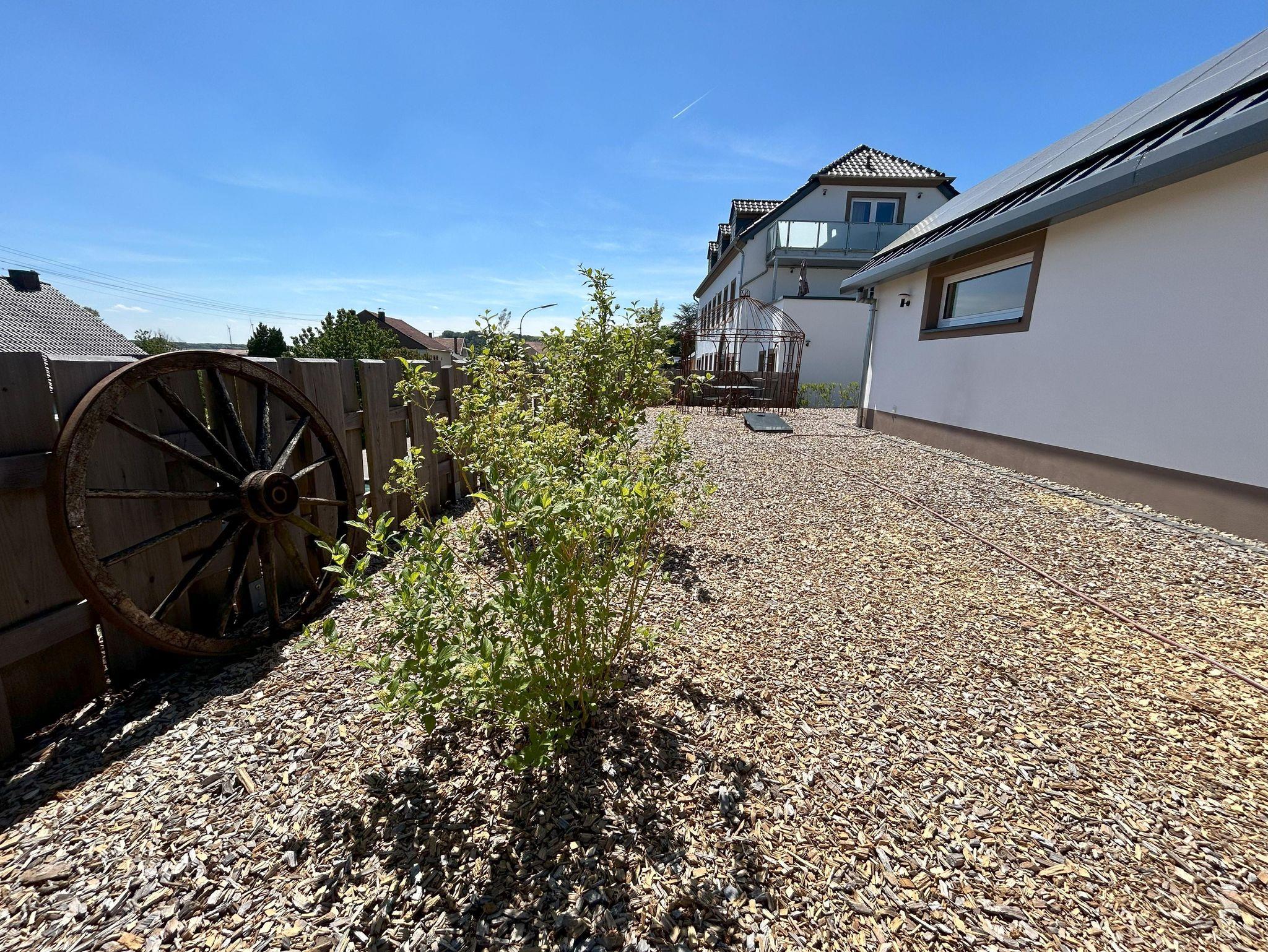 Temporär befindet sich die Außenanlage noch in Bau Allerdings weisen wir darauf hin, dass der Rückseitig-Außenbereich (Terrasse und Garten) zur Zeit noch nicht fertiggestellt ist.
