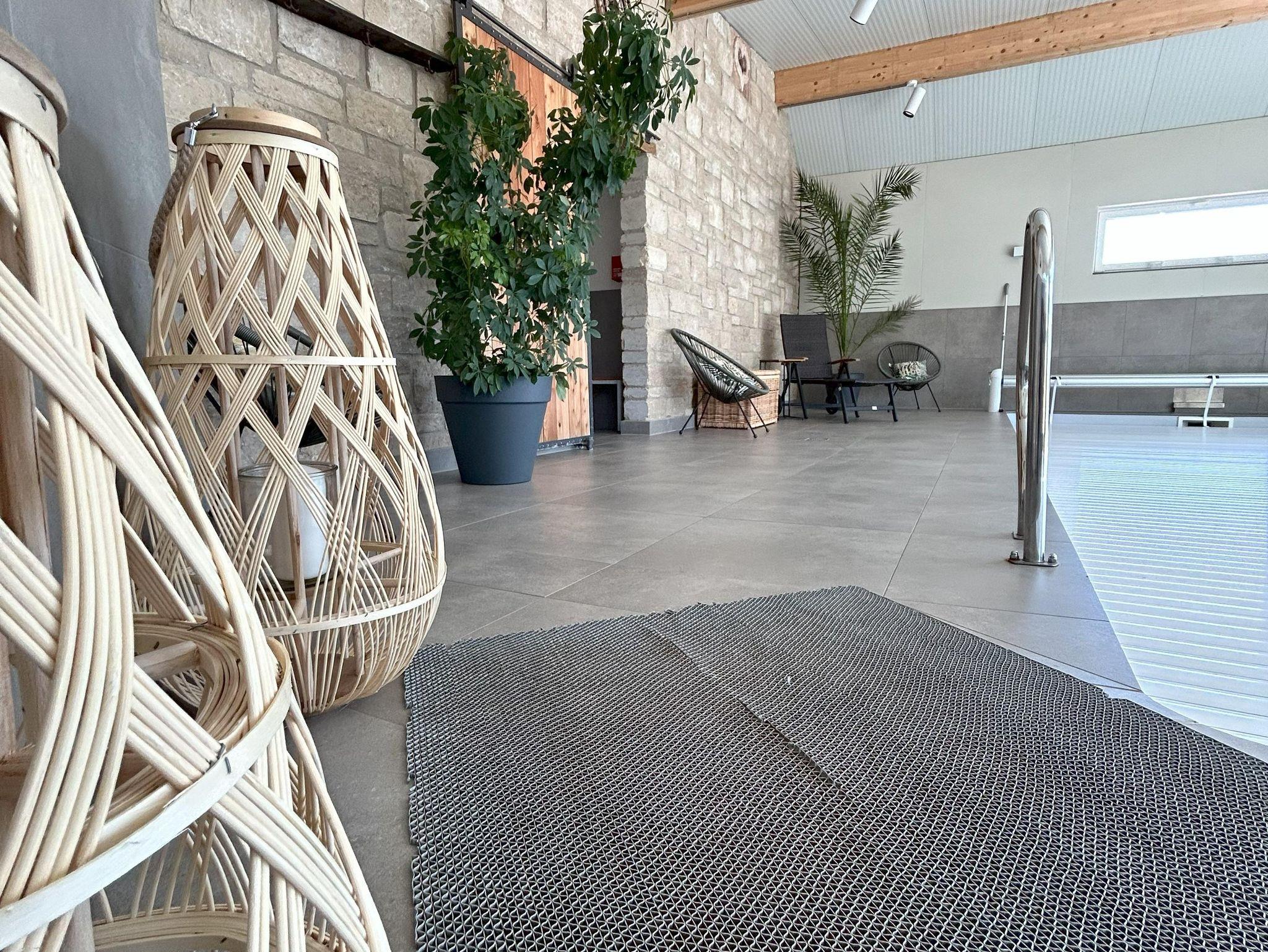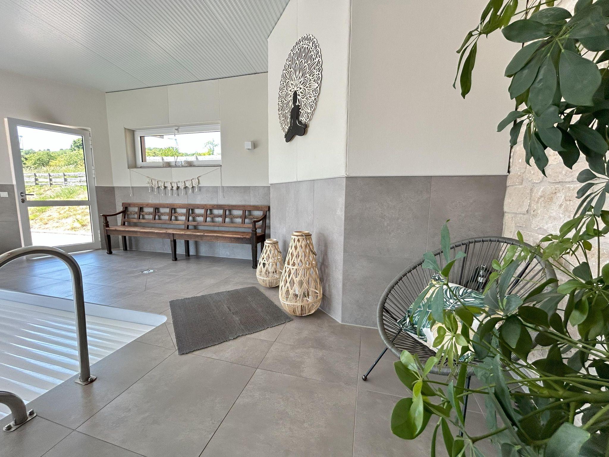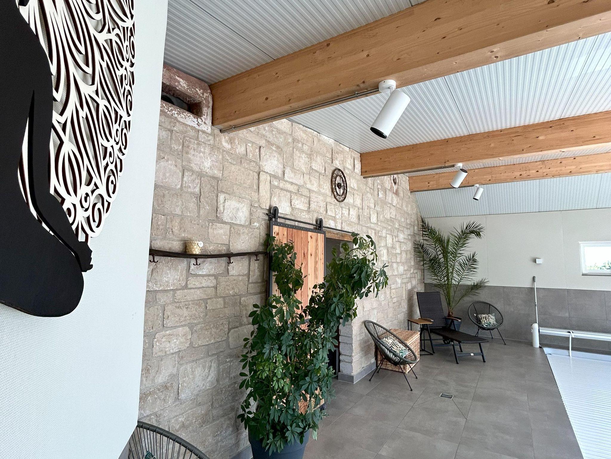 ?Relaxen in der Wellnessscheune Unser Feriendomizil wird durch ein 750 m² großes Spa Resort ergänzt. Dieser hat alles, was ihren Aufenthalt unvergesslich und einzigartig macht. In unserer Wellnessscheune befindet sich ein Salzwasserpool mit den Maßen 8m x 3,75m und einer Tiefe von 1,55m, dieser wird ganzjährig auf 28 Grad beheizt.