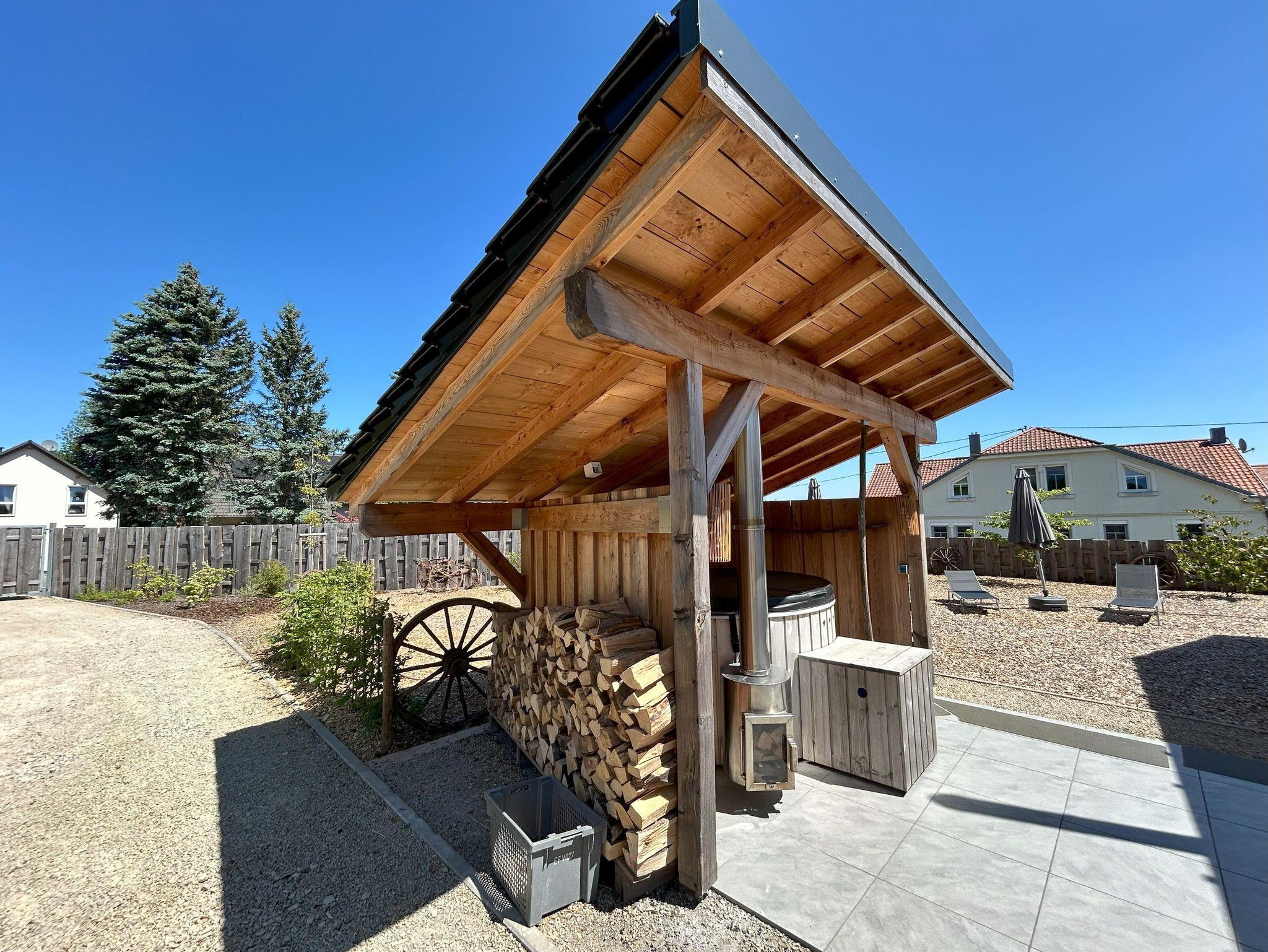 Hot Tub für bis zu 8 Personen Außerhalb der Wellnessscheune ist ein überdachter nach Süden ausgerichteter Hot Tub mit Luft und Massagedüsen für bis zu 8 Personen, umschlossen von einer großen Gartenlounges zum Ruhen und Entspannen.