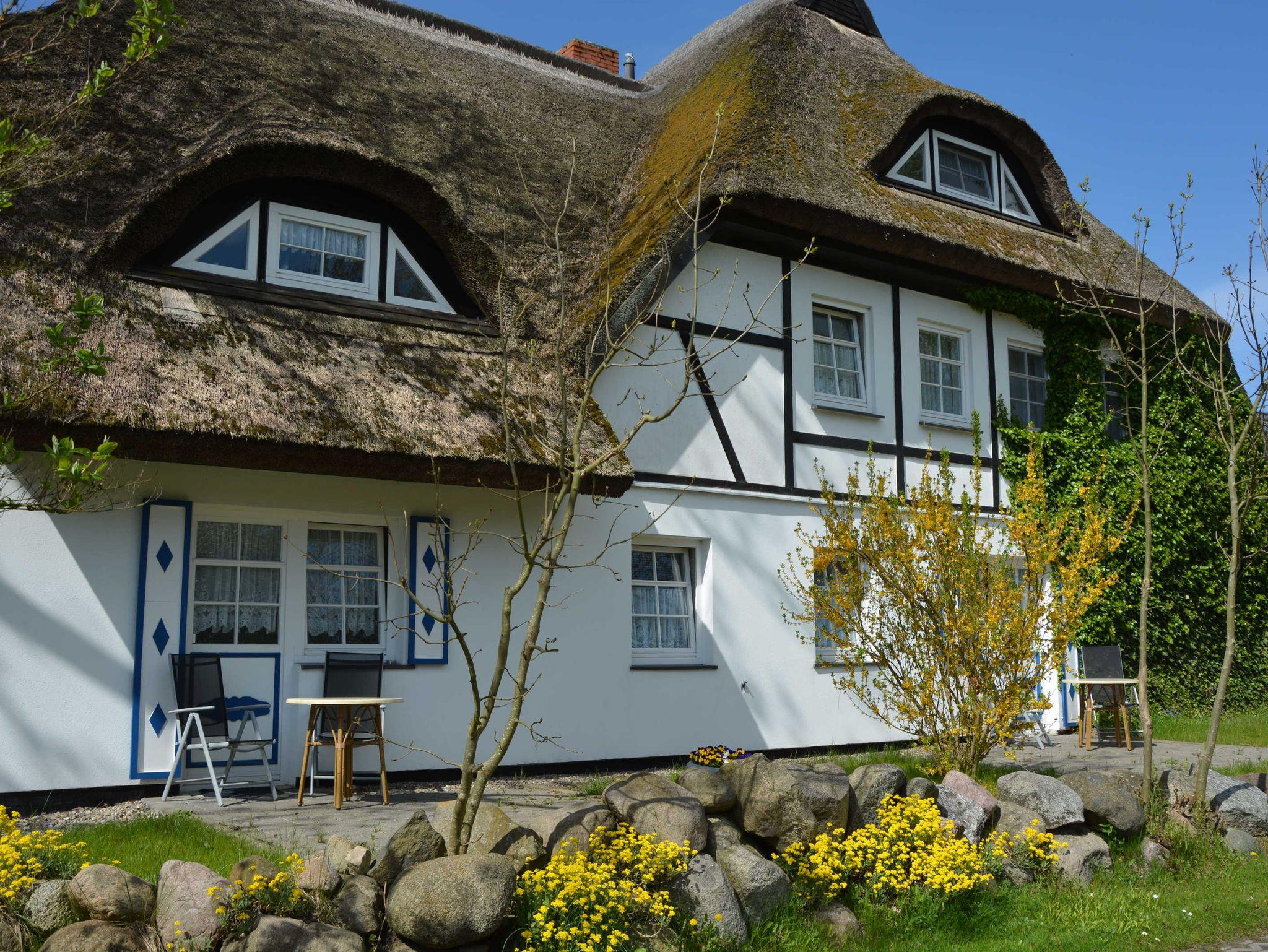 Gemütliche Ferienwohnung im reetgedeckten Rohrdachhus mit Terrasse und Blick auf den Ponygarten in Middelhagen.
