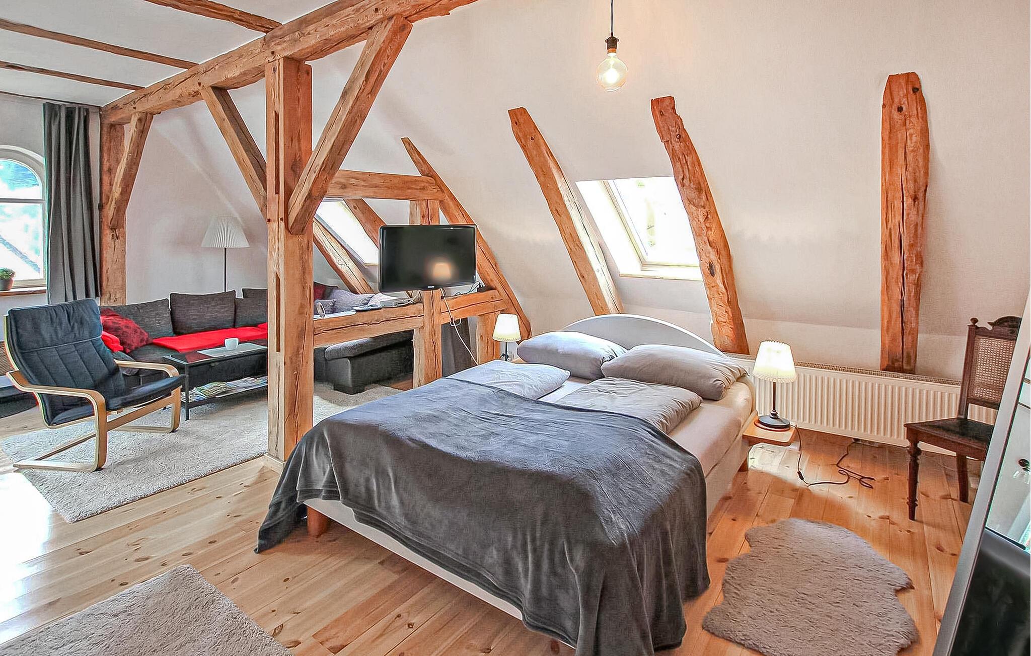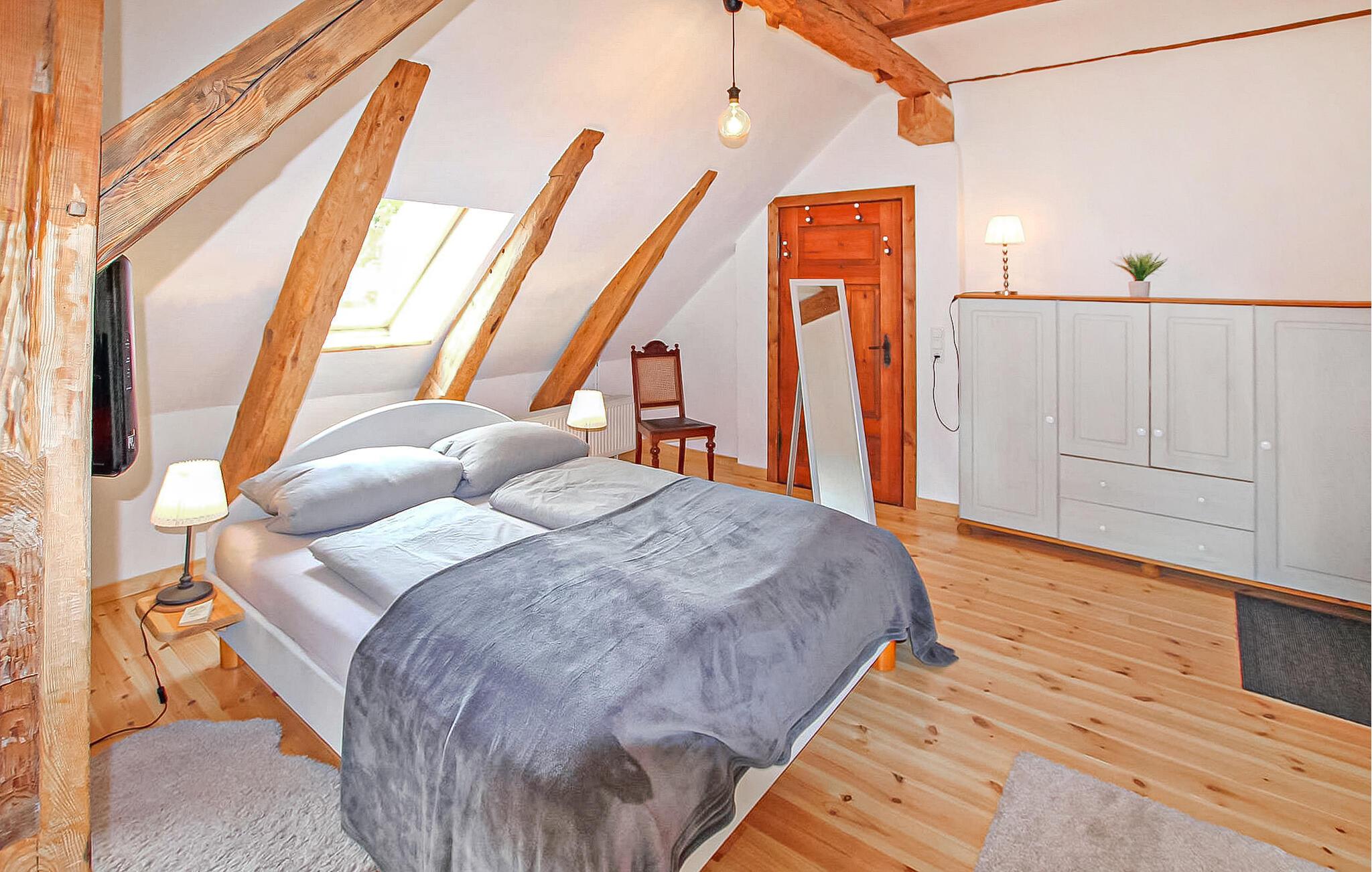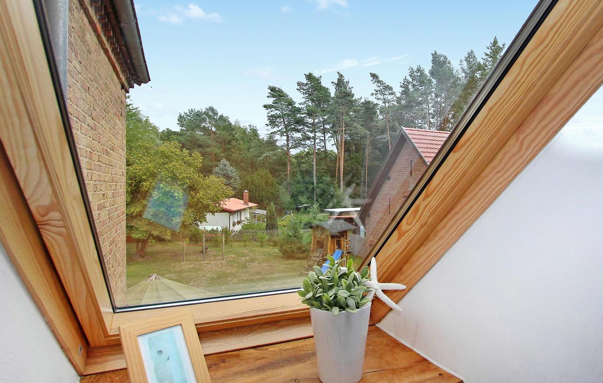Idyllisch mitten im Wald gelegen und nur wenige Schritte vom Zotzensee entfernt, befindet sich auf dem rund 2.600 Quadratmeter großen offenen Wohngrundstück im Obergeschoss des ehemaligen Forsthauses (heute Wohnhaus der Eigentümer) eine Ferienwohnung für zwei Personen. . Ideal für ruhesuchende, aktive und naturverbundene Gäste. Zur Wohnung gehört ein Ruderboot mit Badeleiter, das kostenlos genutzt werden kann, außerdem besteht die Möglichkeit, eigene Tretboote zu nutzen und angeln zu gehen. Die Zufahrt zur Wohnung führt über einen unbefestigten Weg ca. 3 km durch den Wald. Die im Jahr 2017 erweiterte und unter Beibehaltung der Balkenkonstruktion liebevoll eingerichtete Nichtraucherwohnung ist über eine Außentreppe zu erreichen. Es verfügt über einen großen kombinierten Wohn-Schlafraum (Couchecke, Sessel, Flachbild-TV, Radio, Doppelbett; 1,60 m breit) mit einer offenen, voll ausgestatteten Küche (Esstisch, Ceranherd mit Backofen, Kühlschrank mit Gefrierfach, Mikrowelle). , diverse kleine Küchengeräte) und ein großes Badezimmer mit Dusche, WC und Fön. Zusätzlich im Dachgeschoss (Deckenhöhe 1,65 m); erreichbar über offene Raumspartreppe; Ein weiterer Schlafplatz (Bett 1,20 m breit, TV) vorhanden. Die Wohnung wird zentral beheizt und ist mit Insektenschutz und Verdunkelungsrollos/Hitzeschutz an den Dachfenstern ausgestattet. Außerdem stehen Ihnen eine Sitzecke vor der Außentreppe, ein Grill- und Parkplatz sowie ein Fahrradabstellraum bzw. Abstellraum zur Verfügung. Im Gesamtpreis sind Endreinigung, Bettwäsche, Wasser- und Energieverbrauch enthalten. Bitte bringen Sie Ihre eigenen Handtücher mit. Vor Ort zu zahlen: Kurtaxe. Haustiere sind in der Wohnung nicht gestattet.