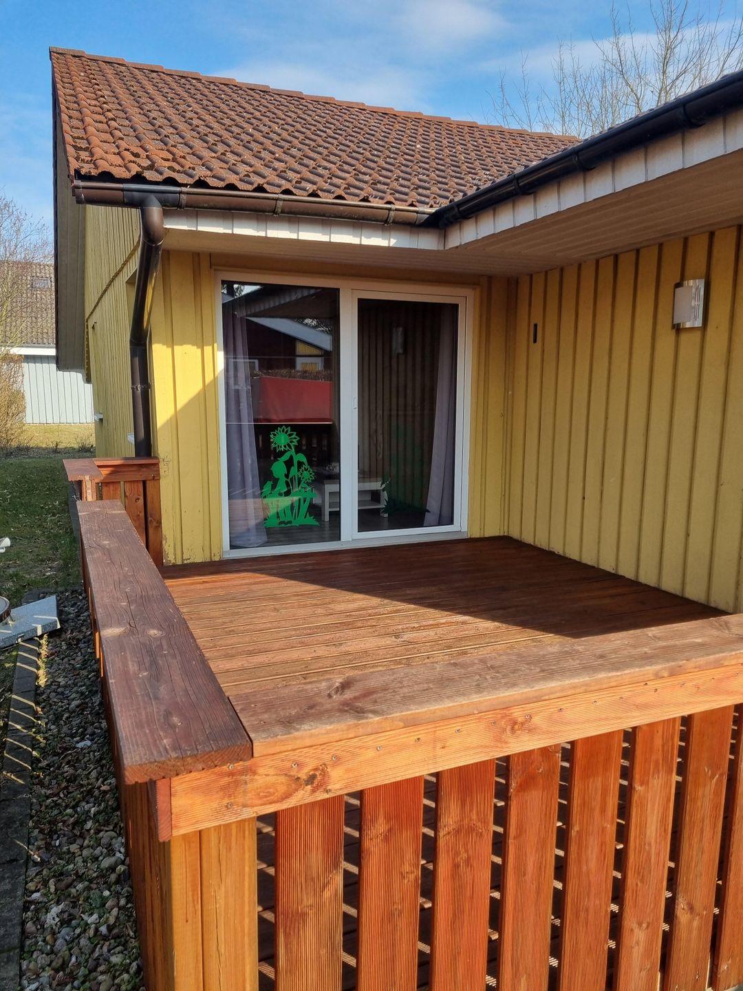 Die Doppelhaushälfte bietet Platz für bis zu 4 Personen auf einer Etage mit 2 Schlafzimmern, offenem Wohn- und Essbereich, Küchenzeile, Terrasse und Abstellraum.