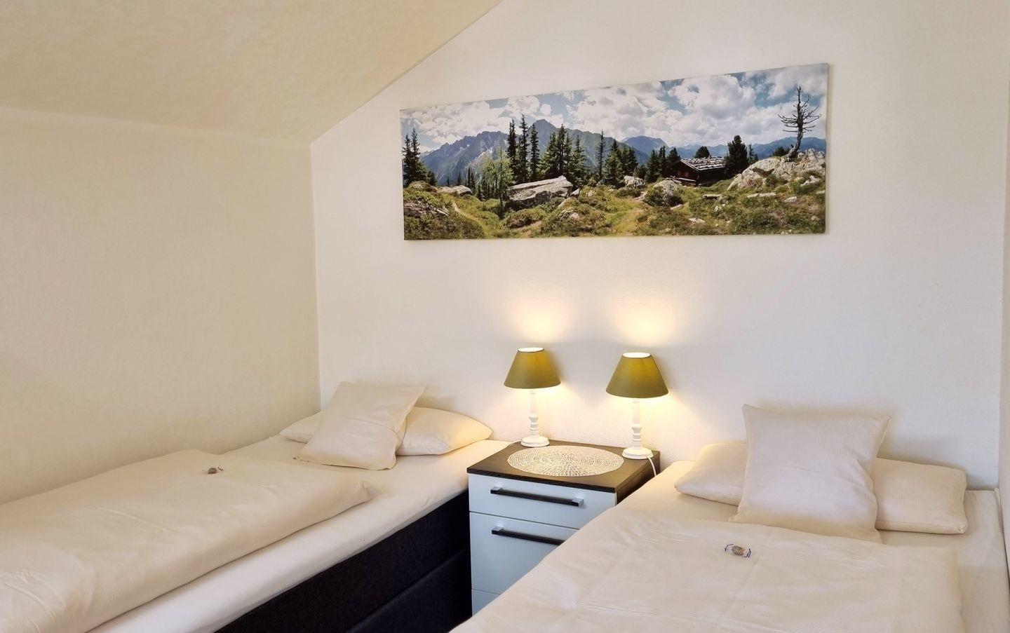einem Wohnschlafraum mit kleiner Sesselgruppe und einer Schlafnische mit 2 Boxspring-Einzelbetten, die sich natürlich auch zusammenstellen lassen.