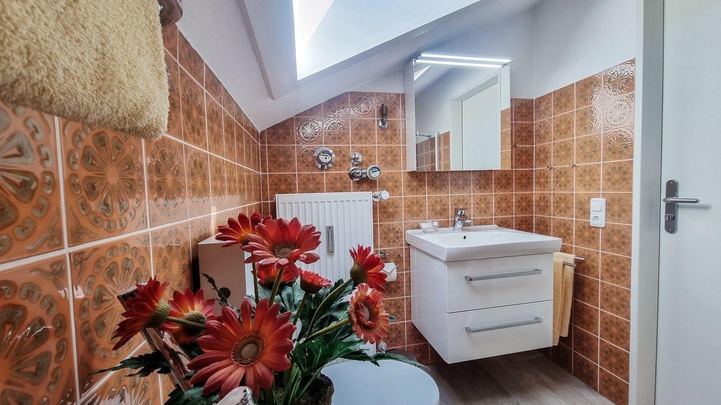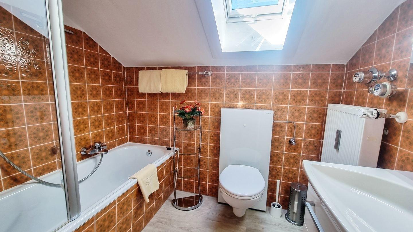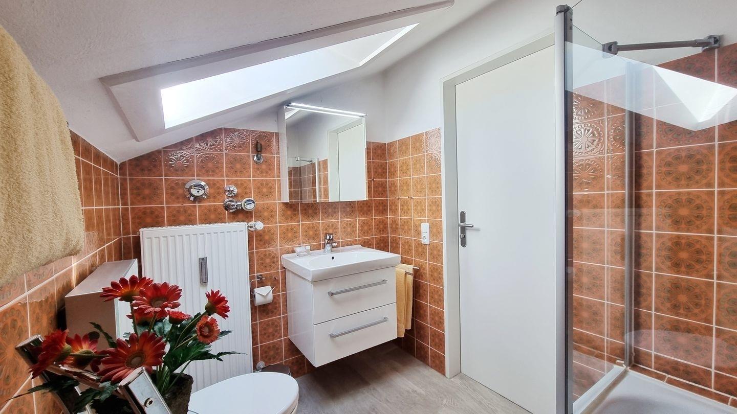 Ein Bad mit Duschwand und WC gehört ebenso dazu wie ein kleiner Speicher, in dem man gut Koffer oder sonstige sperrige Utensilien lagern kann.