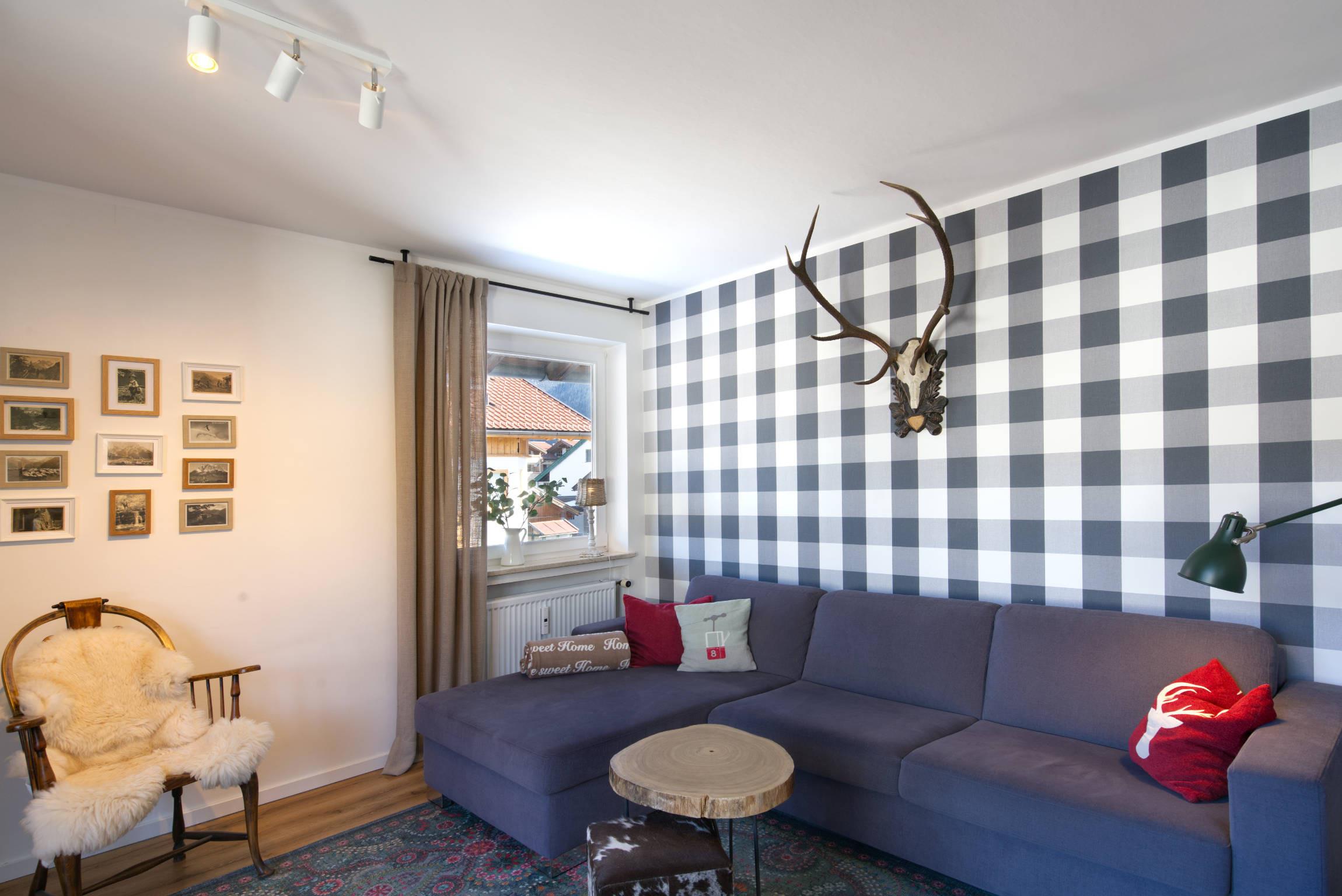 Das Haus liegt in einer ruhigen und gepflegten Wohngegend von Mittenwald. Die Ferienwohnung mit der besonderen farblichen Note hat einen möblierten Westbalkon mit Abendsonne und Blick zum Kranzberg und Wettersteingebirge.