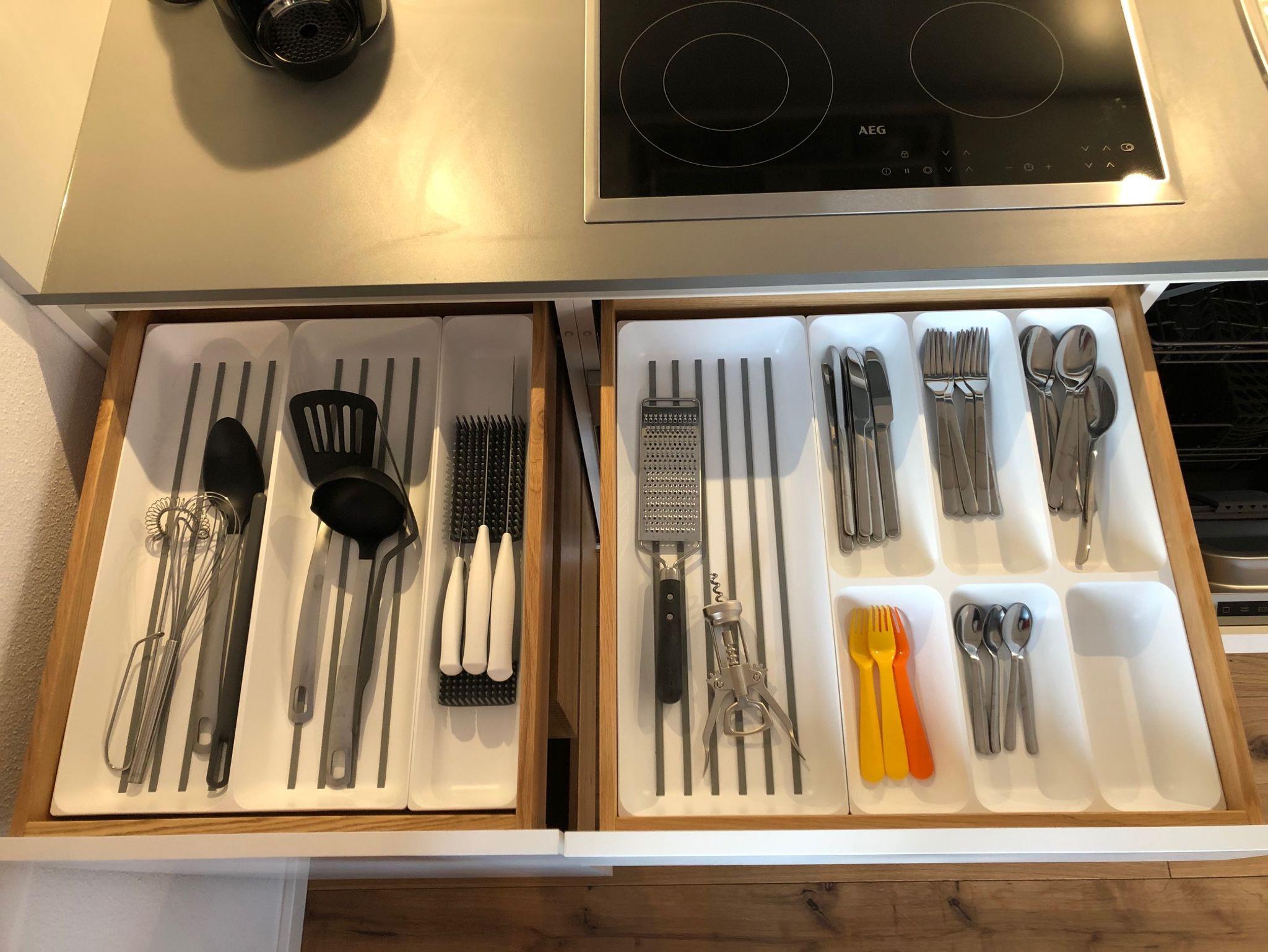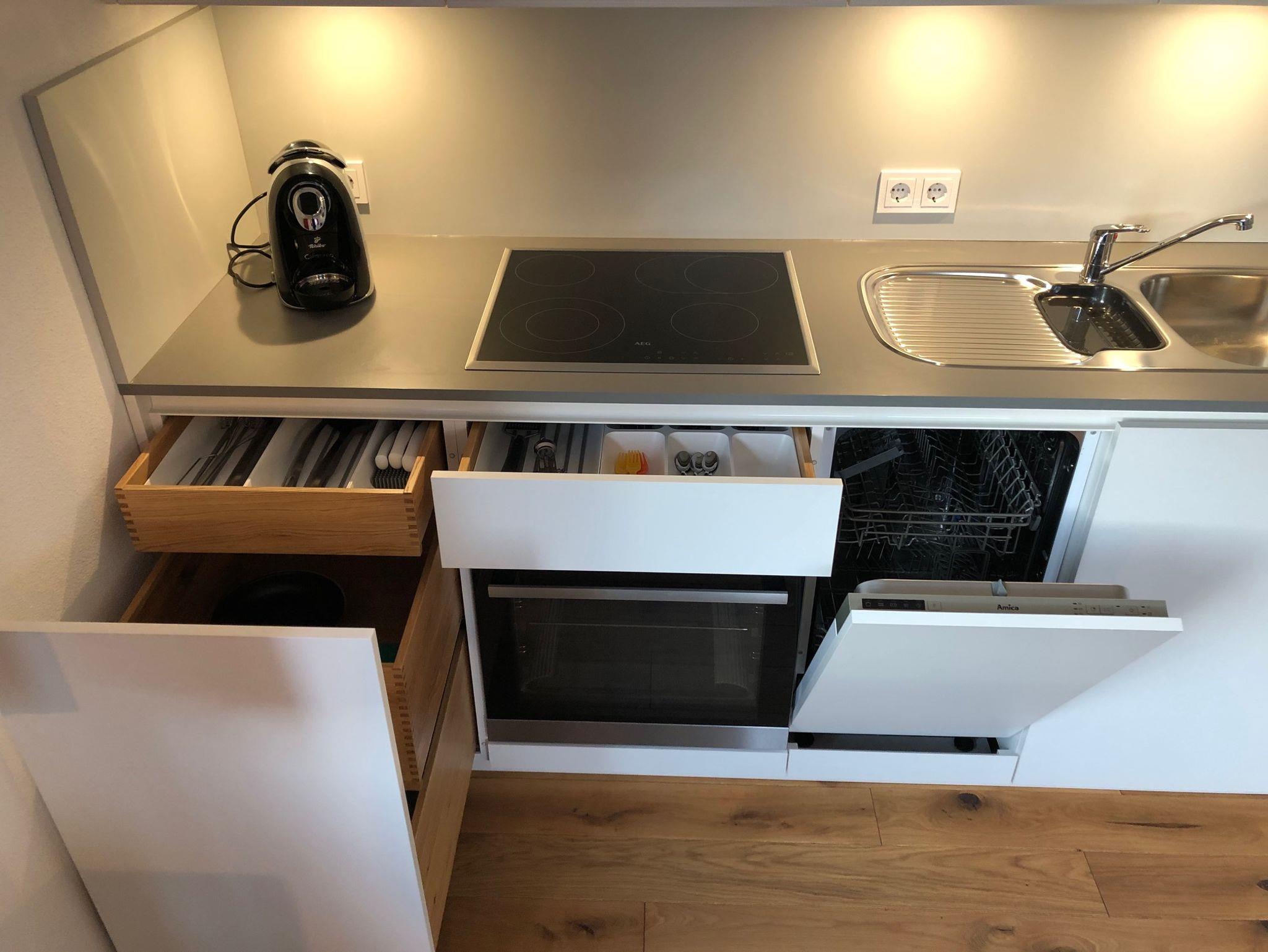 - gut ausgestattete Küchenzeile mit Backofen, Kochfeld, Dunstabzug, Spülmaschine, Kaffeemaschine, Kühlschrank, Geschirr, Töpfe, Besteck