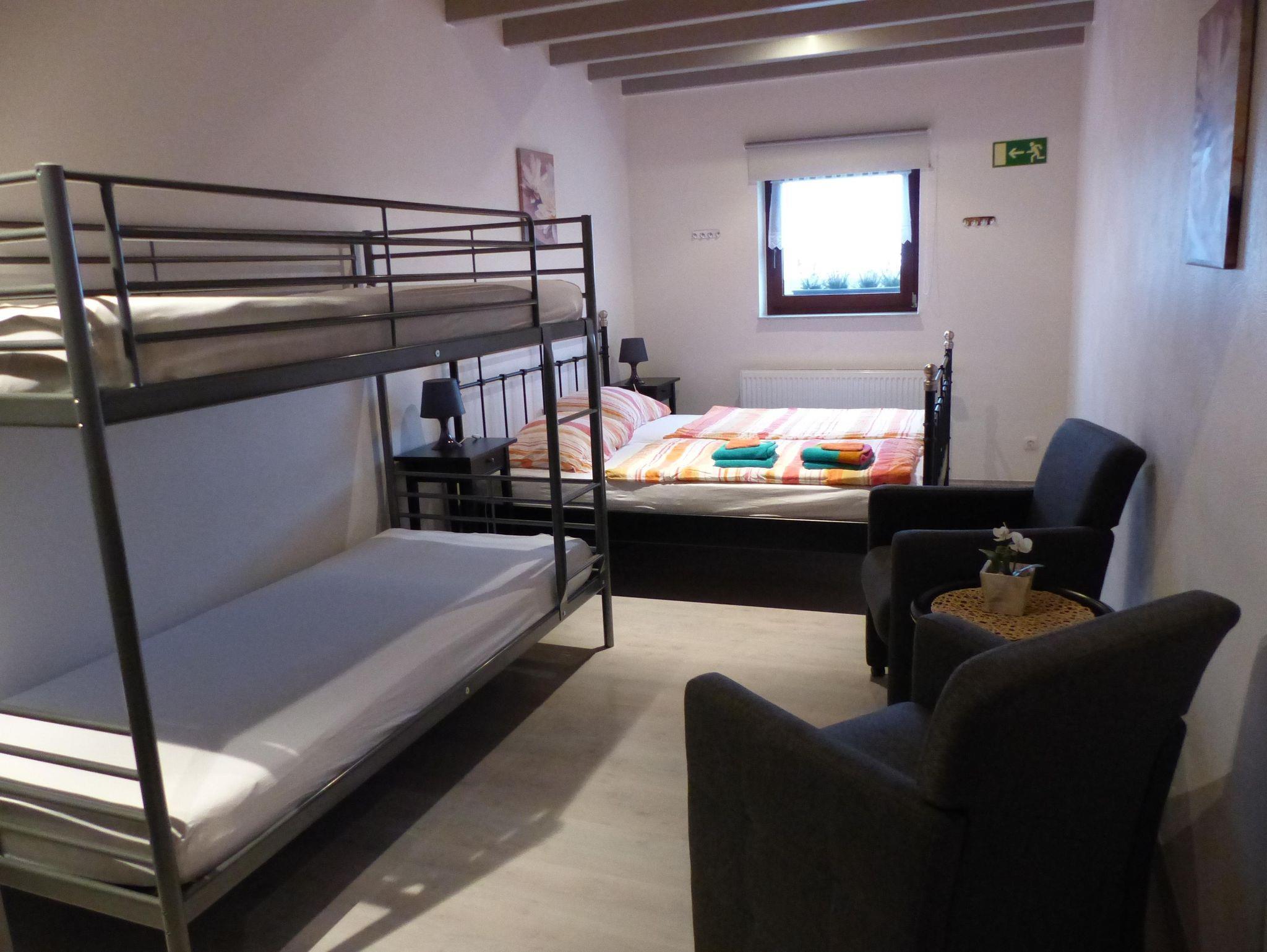 Große Neubauwohnung (2002 gebaut) im ehemaligen Stallgebäude, 110 qm mit 3 Schlafzimmern (1 für max. 2 Personen, 1 für maximal 4 Personen und 1 für maximal 6 Personen), großer Wohnraum, große Küche, 2 Bäder mit Du/WC, 1 sep. WC, komfortabel eingerichtet, für Gruppen und Familien.