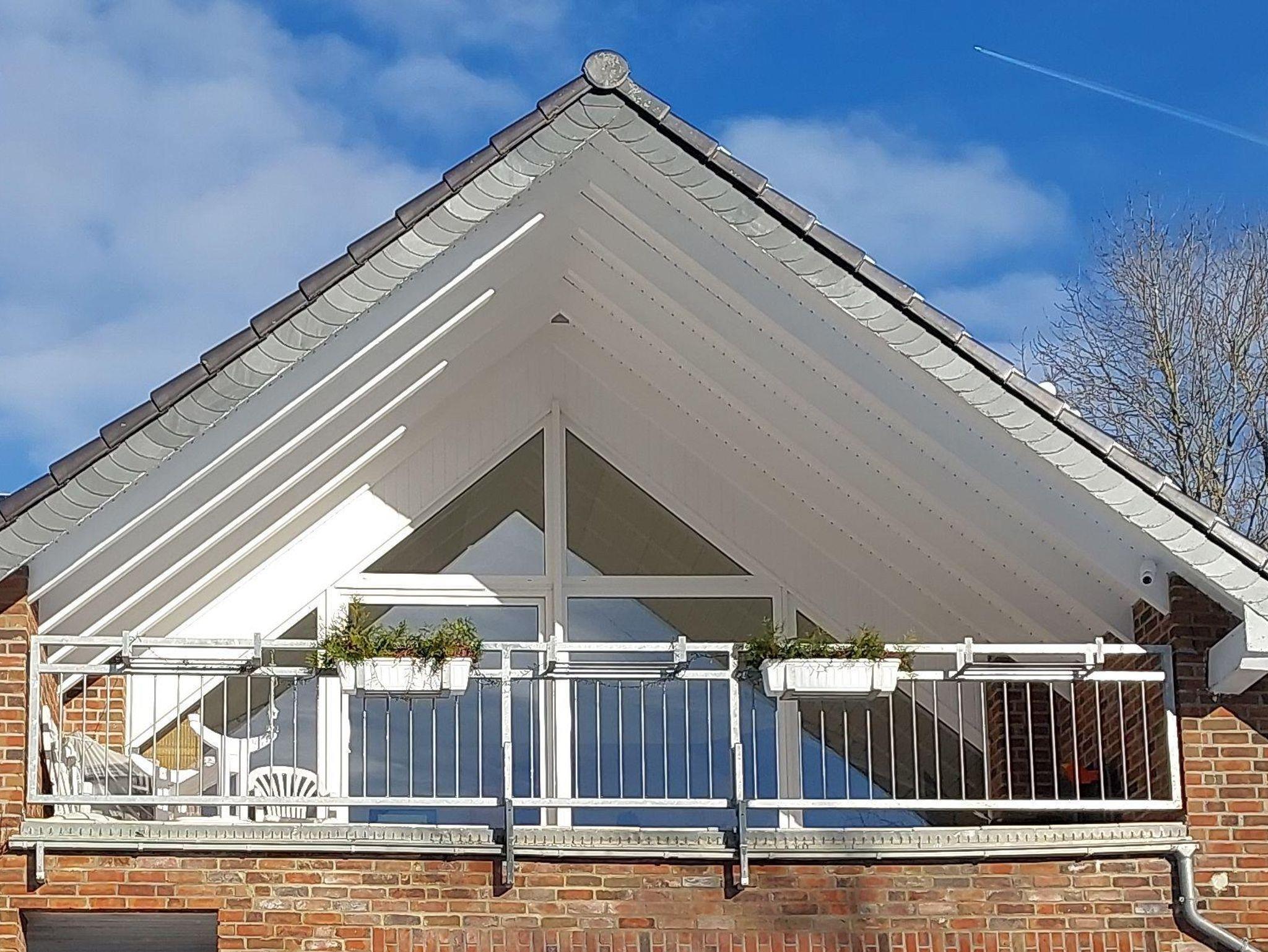 Der großzügige Balkon ist mit Gartenmöbeln und einem Sonnenschirm ausgestattet.