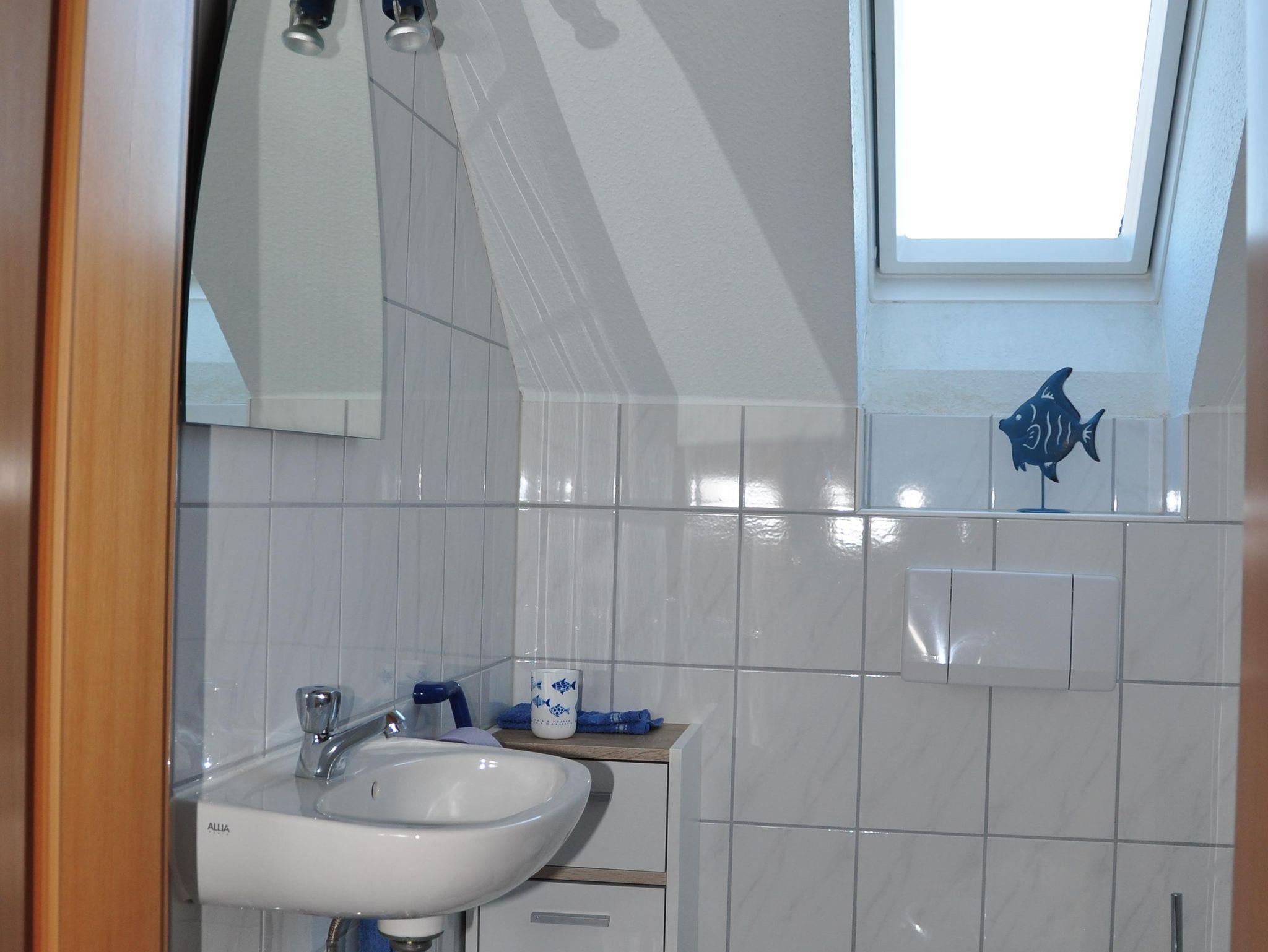 Das Tageslicht-Bad verfügt über eine ebenerdige Dusche, WC und Waschbecken. Weiterhin steht eine separates WC mit Waschbecken zur Verfügung.