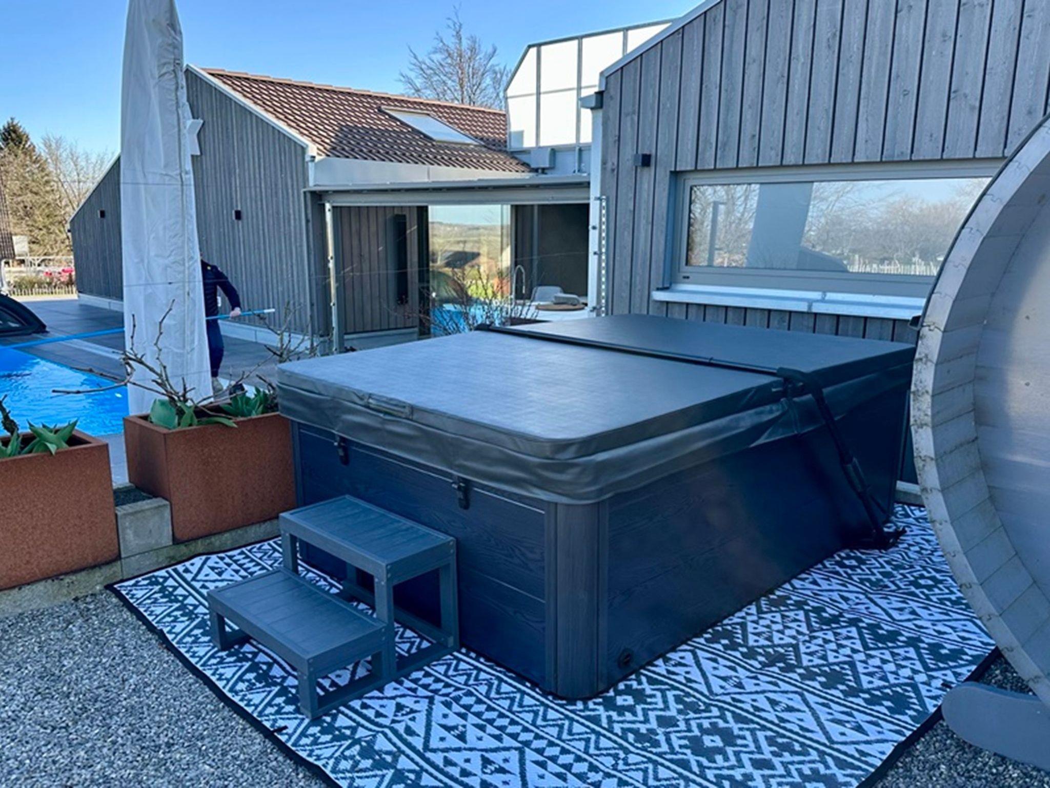 Sauna und Whirlpool im Außenbereich zur Gemeinschaftsnutzung (Whirpool = Mai bis Oktober nutzbar)