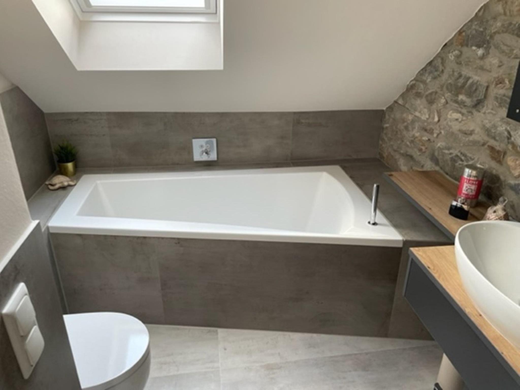 • modernes Bad mit Dusche, Badewanne, WC und Waschbecken (OG)