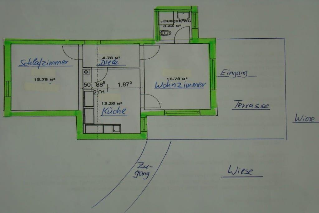 Parterre: (Eingangshalle, Küche(Esstisch, Kochplatte, Wasserkocher, Toaster, Kaffeemaschine, Backofen, Grill, Mikrowelle, Spülmaschine, Kühlschrank, Tiefkühlschrank, Hochstuhl), Wohn-/Schlafzimmer(Schlafcouch 1 Pers., TV, DVD-Spieler, Radio), Schlafzimmer(Doppelbett, Kinderbett), Badezimmer(Dusche, Waschbecken, Toilette, Föhn, Handtücher inklusive, )) Grill, Terrasse, Garten, Gartenmöbel, Parkplatz, Sonnenschirm