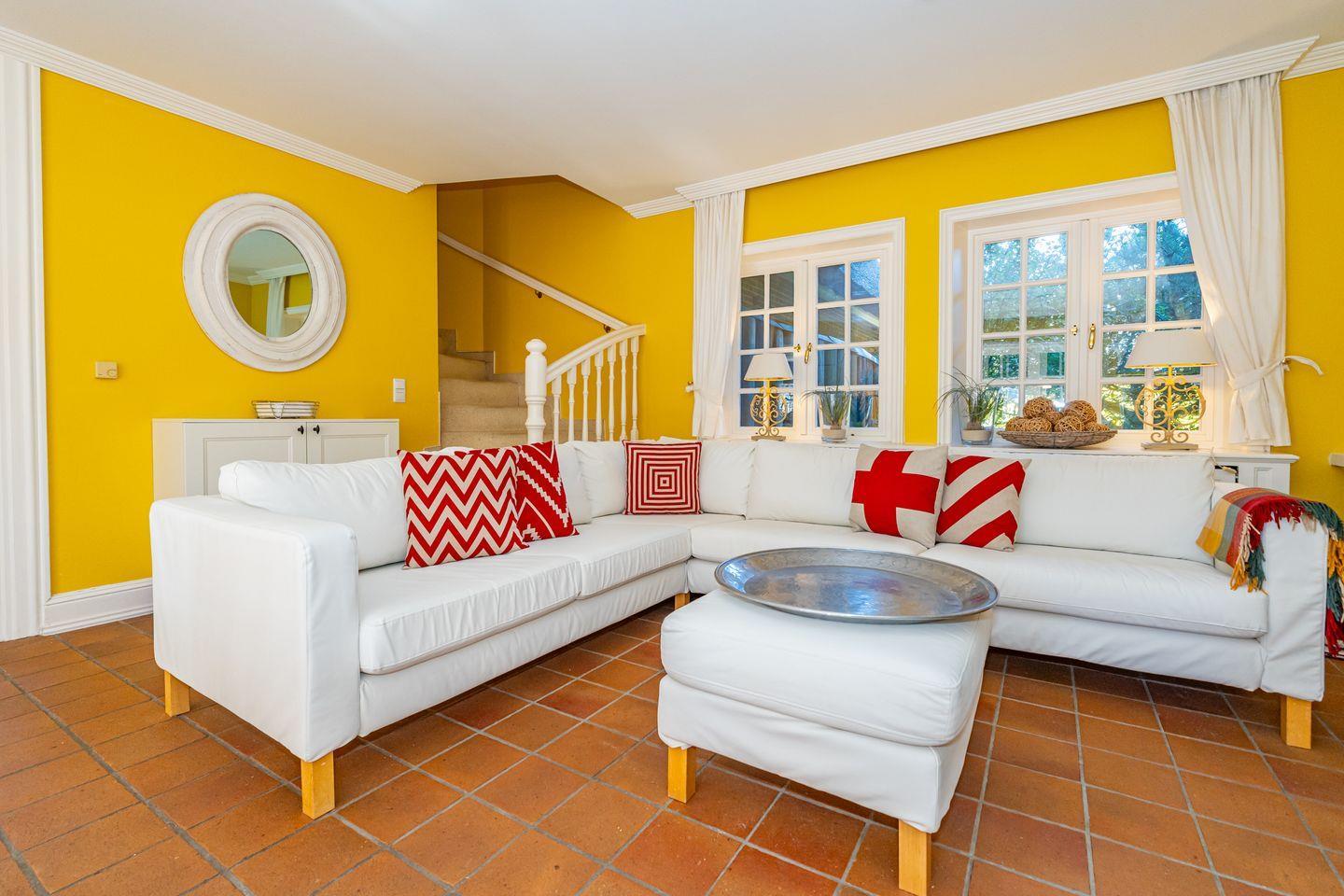 Großes gemütliches Wohnzimmer mit Blick in den großen Garten, 3 Schlafzimmer, 2 Bäder, dieses Ferienhaus ist ideal für bis zu 6 Personen