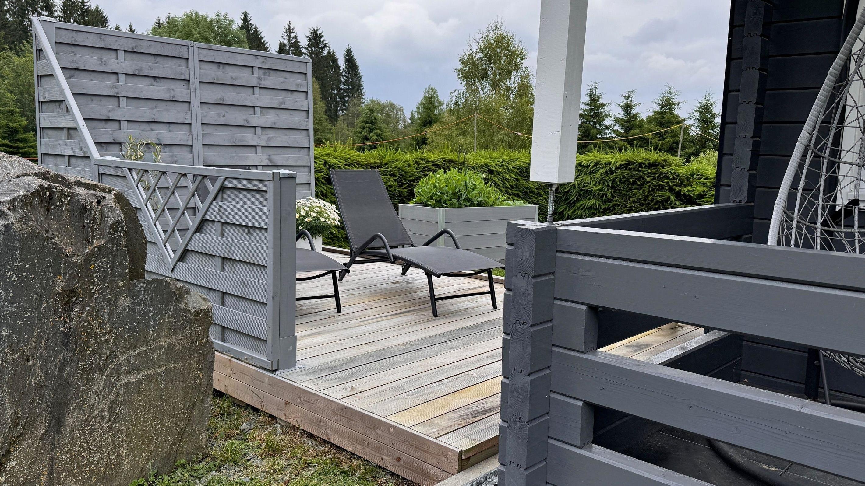 2023 NEUE ZUSÄTZLICHE TERRASSE seitlich am Haus mit 2 Liegestühlen ausgestattet.