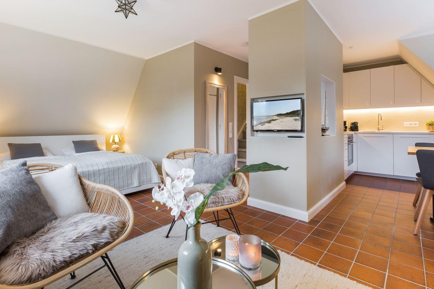 Die Feriewnohnung Sönshörn Suite liegt im Süden von Munkmarsch in einer ruhigen Sackgasse, nur 300 m vom Naturwelterbe Wattenmeer entfernt. Die Ferienwohnung befindet sich im 1OG. und erstreckt sich über zwei Etagen. Im 1 OG. befindet sich der Wohn- und Schlafbereich, wo Ihnen ein Doppelbett und ein gemütliches Sofa zur Verfügung stehen. Die offene Küche mit angrenzenden Esstisch ist ausgestattet mit einem Geschirrspüler, Backofen, Toaster und einer Kaffeemaschine. Auf der selben Ebene befindet sich das Badezimmer mit Regendusche und WC. Über eine schmale Treppe gelangen Sie ins Dachgeschoss der Wohnung wo sich das separate Schlafzimmer mit zwei Einzelbetten befindet. Zur Ferienwohnung gehört im Gemeinschaftsgarten eine private, kleine Terrasse, saisonal mit Sylter Strandkorb und Gartenmöbeln. Im Garten befindet sich eine ebenfalls eine Gartenhütte zur gemeinschaftlichen Nutzung um Fahrräder unterzustellen. Auf Rücksicht auf die nachfolgenden Gäste ist das Rauchen in dieser Ferienwohnung nicht gestattet. Hunde sind auf Anfrage gestattet (10,- € pro Tier/Tag).