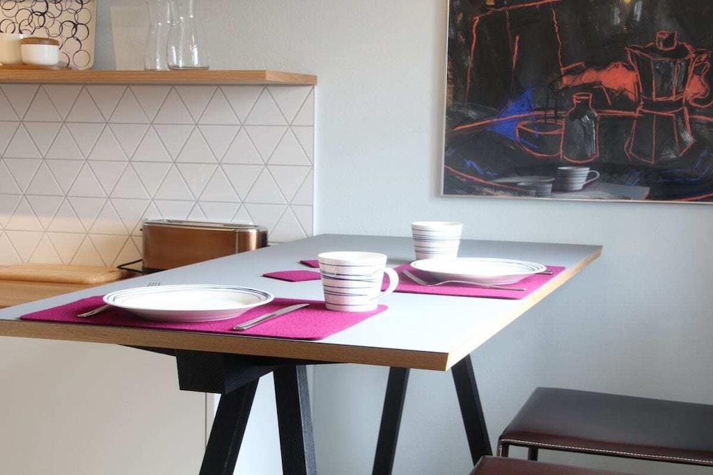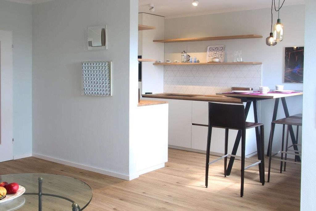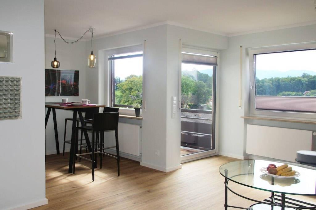 Modernes Zuhause auf 55 qm im 3.Stock mit Südbalkon. Das helle, lichtdurchflutete Wohnzimmer ist mit Sofa, Sessel, Tisch und TV perfekt eingerichtet um den Aufenthalt zu genießen. Die Küche ist hochwertig und sehr gut ausgestattet. Im Schlafzimmer erwartet Sie ein für die Ferienwohnung gebautes Doppelbett aus massiver Eiche und ein geräumiger Einbauschrank. Das Bad ist mit italienischen Fliesen, einer großen Dusche und hochwertigen Sanitärelementen ausgestattet. Das Zentrum Murnaus ist in 5 Gehminuten zu erreichen.