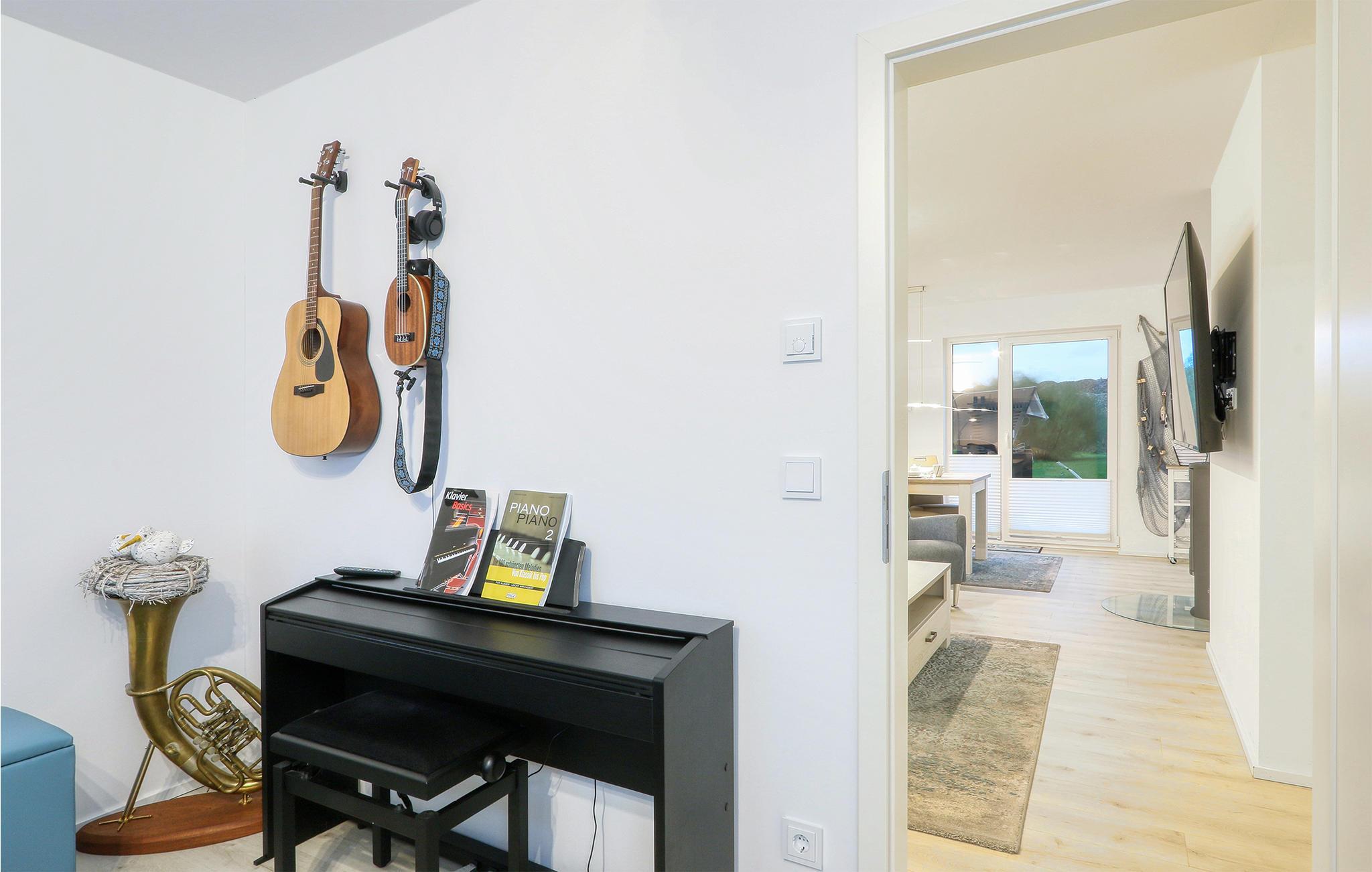 Sie betreten Ihr Ferienhaus über Ihre kleine, überdachte Terrasse. Die große Sonnenterrasse befindet sich auf der anderen Seite des Hauses. Hier können Sie am Morgen den Tag mit einem Frühstück starten oder bei einem Glas Wein im Sonnenuntergang ausklingen lassen. Als kleines Highlight werden sich Musikliebhaber über das E-Piano und weitere Instrumente freuen.