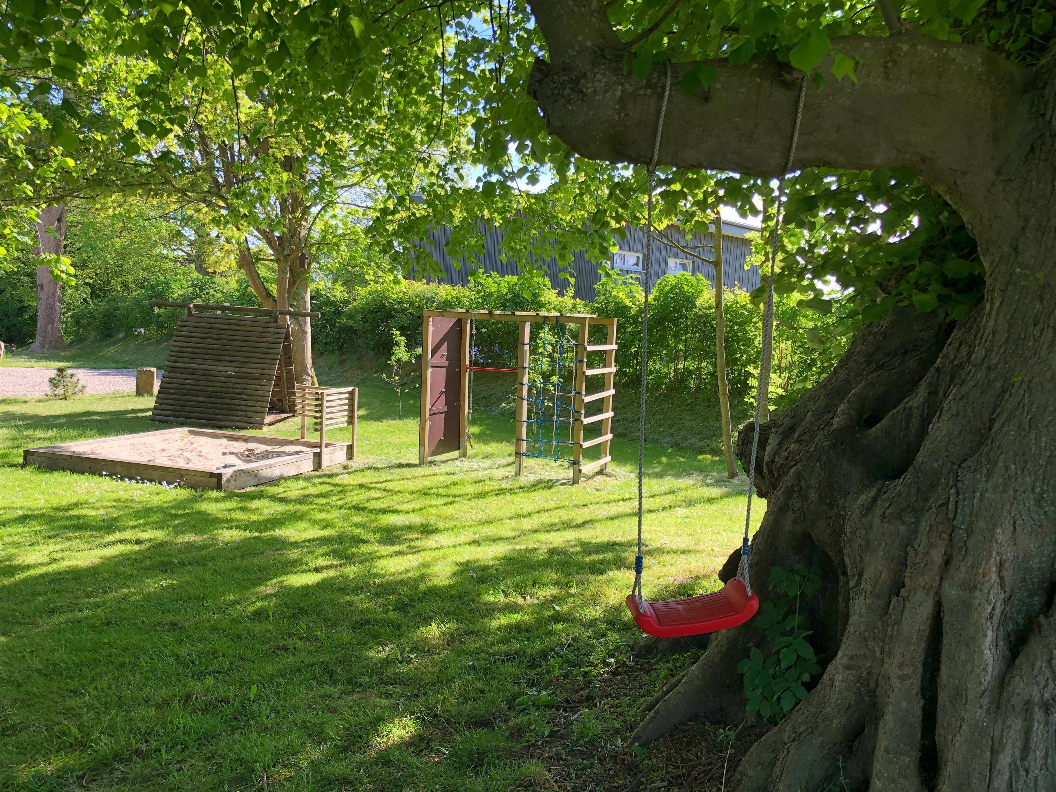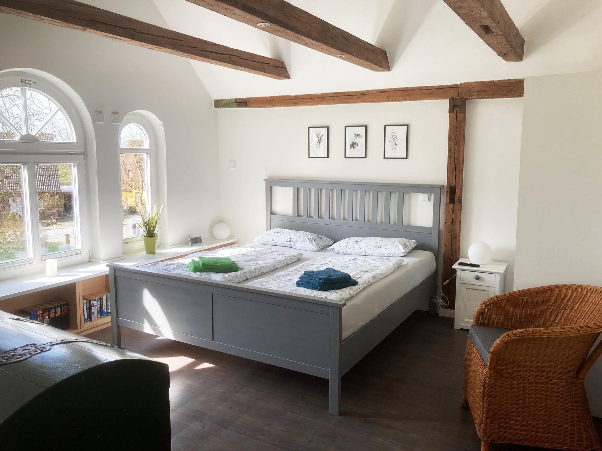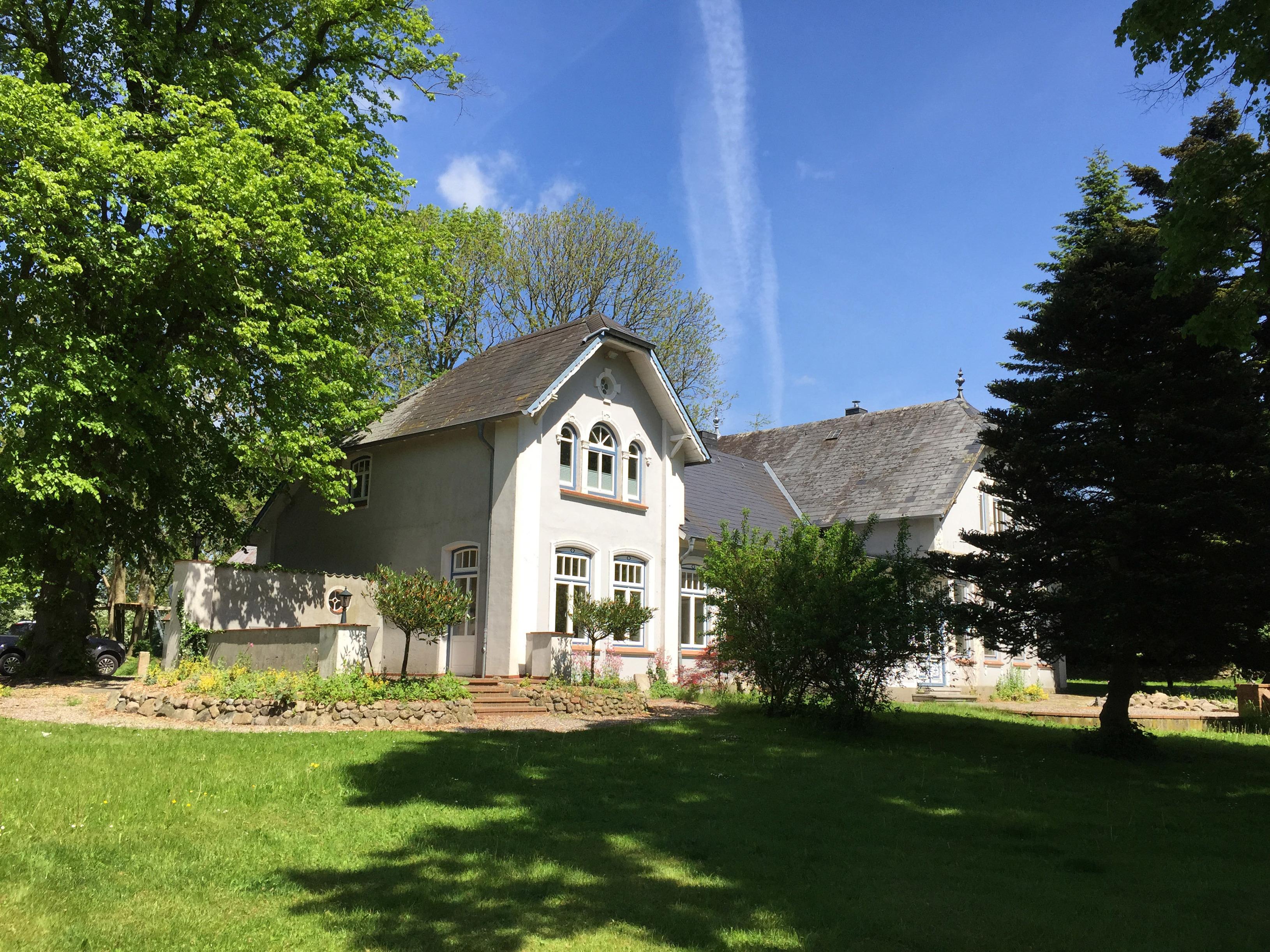 Die "Parkwohnung" ist eine eigenständige Ferienwohnung im Landhaus. Die Wohnung erstreckt sich über das Erd- und Dachgeschoss. Die Wohnung besteht im Erdgeschoss aus einem offenen Wohn- und Esszimmer mit antikem Kachelofen, einer voll ausgestatteten Küche, einem Duschbad und einer Diele. Die Küche verfügt über einen Backofen mit Kochfeld, einen Geschirrspüler und einen Kühl- und Gefrierschrank. Angrenzend an das Wohnzimmer ist eine großzügige Süd-Westterrasse mit Sitzecke und Grill. Im Dachgeschoss befinden sich zwei Schlafräume. Der eine mit Doppelbett der andere mit zwei freistehenden Einzelbetten. Beide Schlafzimmer sind mit einem TV Gerät ausgestattet. Das Schlafzimmer mit Doppelbett hat ein angeschlossenes Ensuite Bad mit Badewanne. Des Weiteren befindet sich im Dachgeschoss ein Durchgangsraum mit Schreibtisch und Spielecke. Aus der Ferienwohnung blickt man in den großen grünen parkähnlichen Garten. Die Fußböden sind aus geölten Holzdielen oder rustikalen Fliesen in warmen Farben. Große Fenster lassen viel Tageslicht in die helle Wohnung. Genießen Sie von der großzügigen Terrasse das Rauschen der Blätter, das vielstimmige Vogelkonzert, das Spiel von Licht und Schatten und den Blick in die Bäume und den schleswig-holsteinischen Himmel. Zu der Wohnung gehört eine sehr große voll möblierte Terrasse mit Sonnenliege, Tisch und Stühlen, sowie Grill und Sonnenschirm. Das gesamte Grundstück mit Grillplatz und Spielplatz steht zur Verfügung. Fahrräder und Angelausrüstung können unter Dach (verschließbar) abgestellt werden.