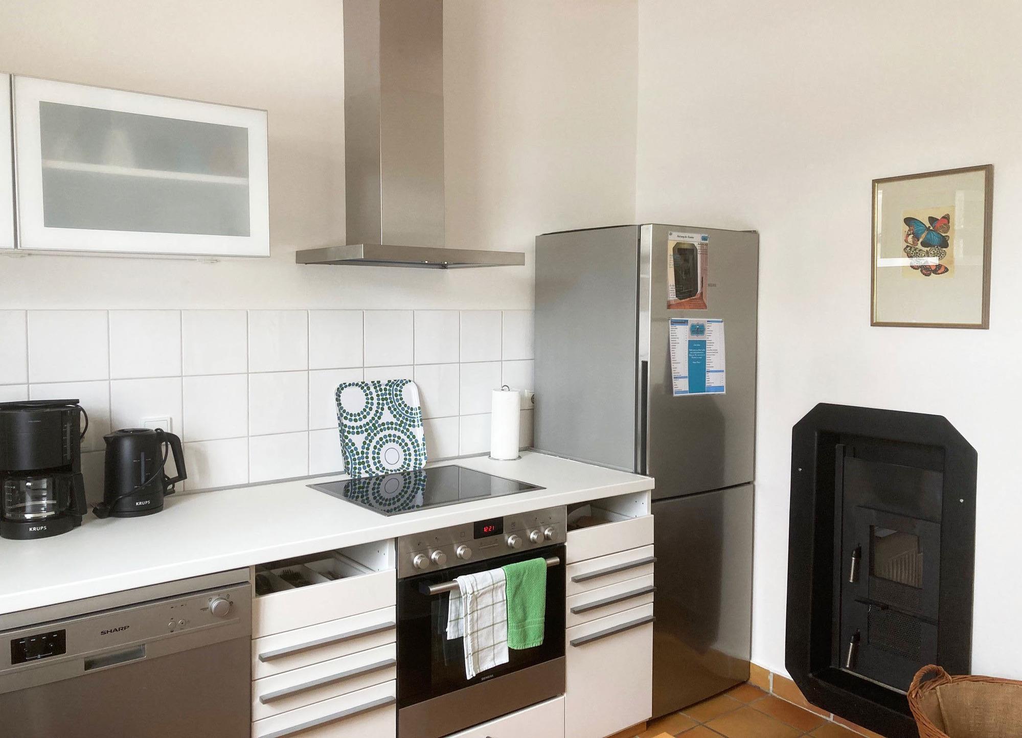 Stilvolle Ferienwohnung in Nübel mit großer Terrasse, Kachelofen, Garten und Fahrradnutzung, ideal für Familienurlaub mit Hund.