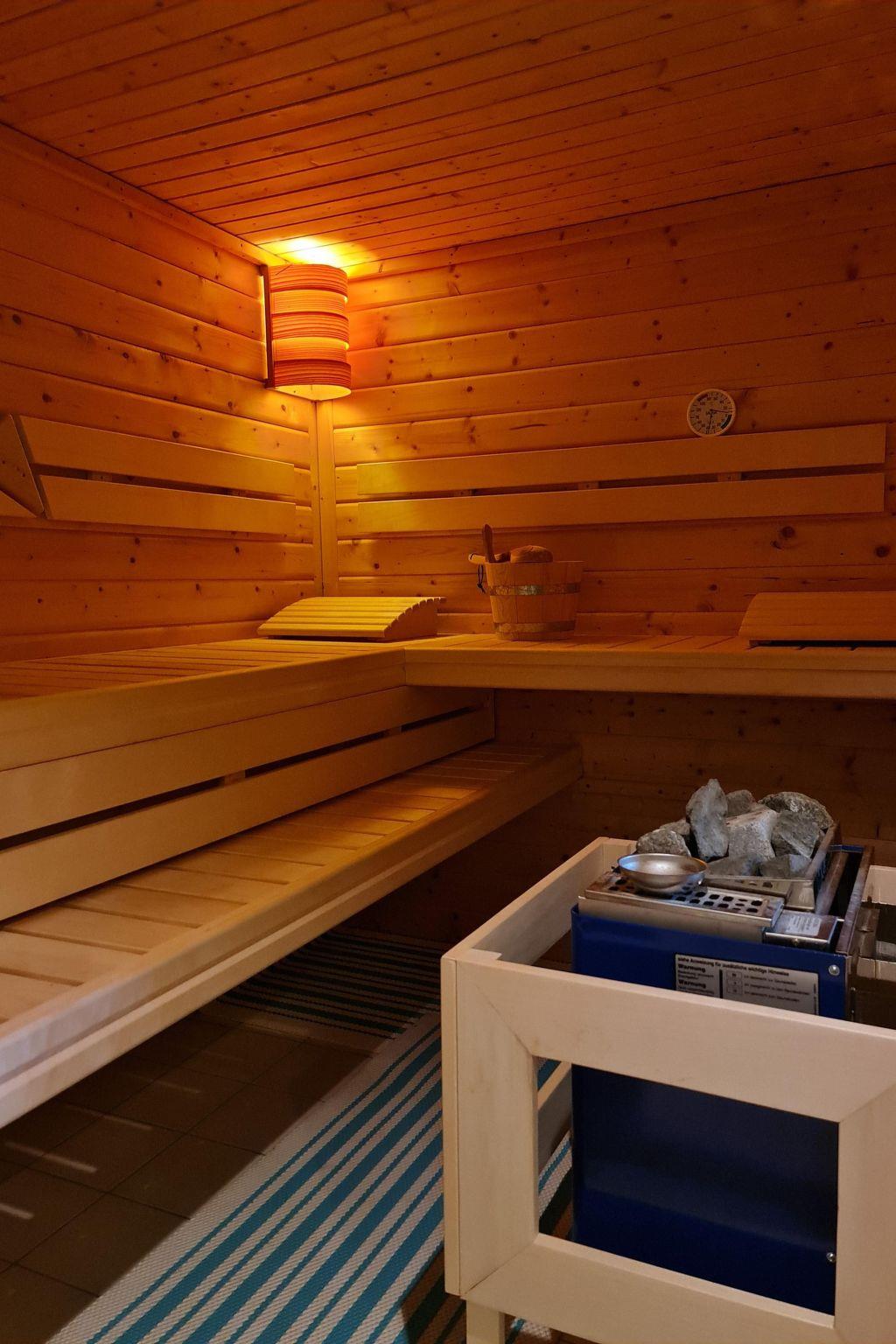 Im Außenbereich bietet der Garten eine persönliche Oase mit einer privaten Nutzung auf der obersten Ebene und einem überdachten Bar-Sitzbereich, perfekt für gemütliche Abende. Ein außergewöhnlicher täglicher privater Zugang zur Sauna für bis zu vier Gäste ist inbegriffen. In der Deluxe-Sauna können sich die Gäste entspannen und Bademäntel, Mineralwasser, Wellness-Drinks und Säfte nutzen.
