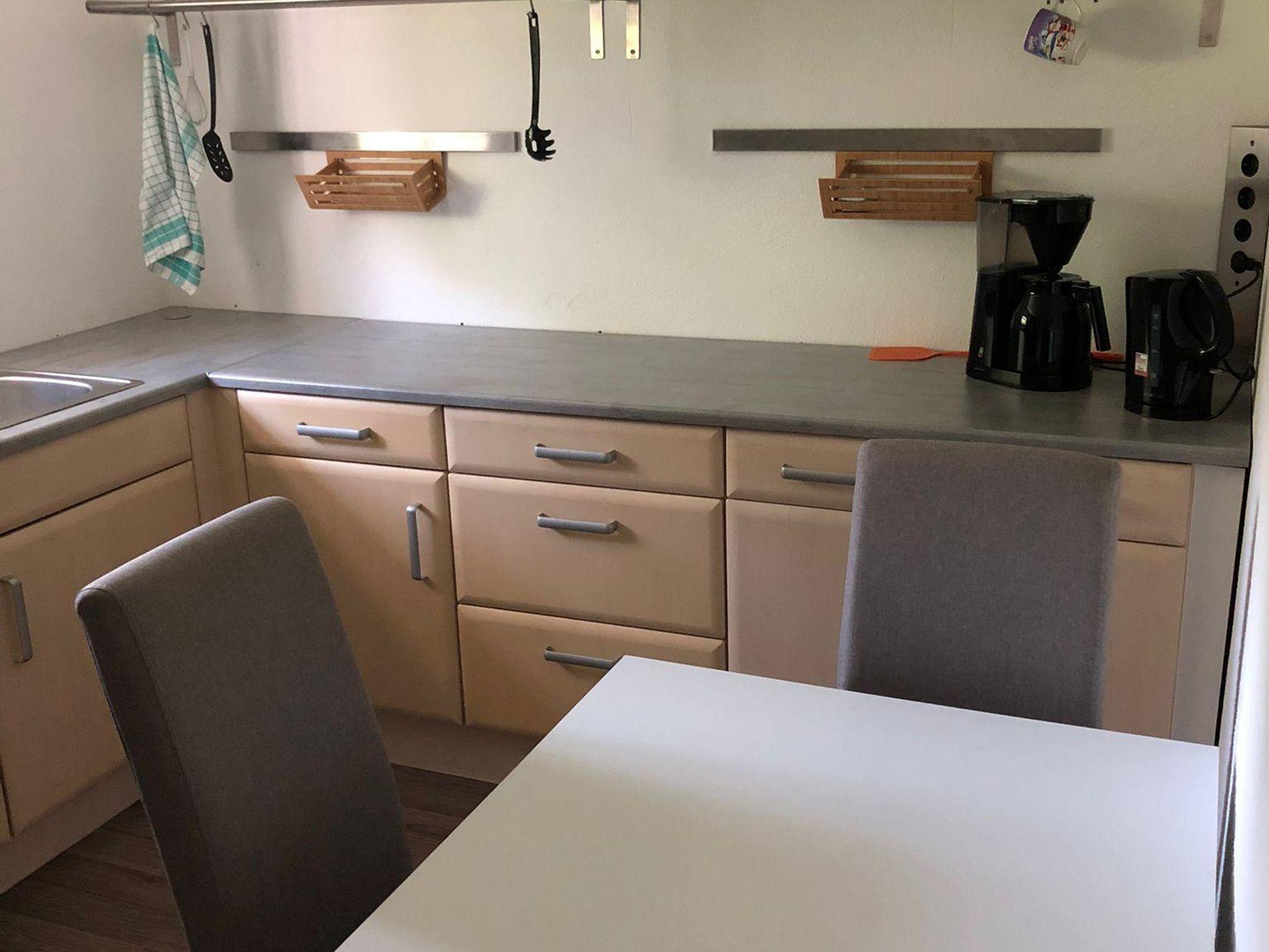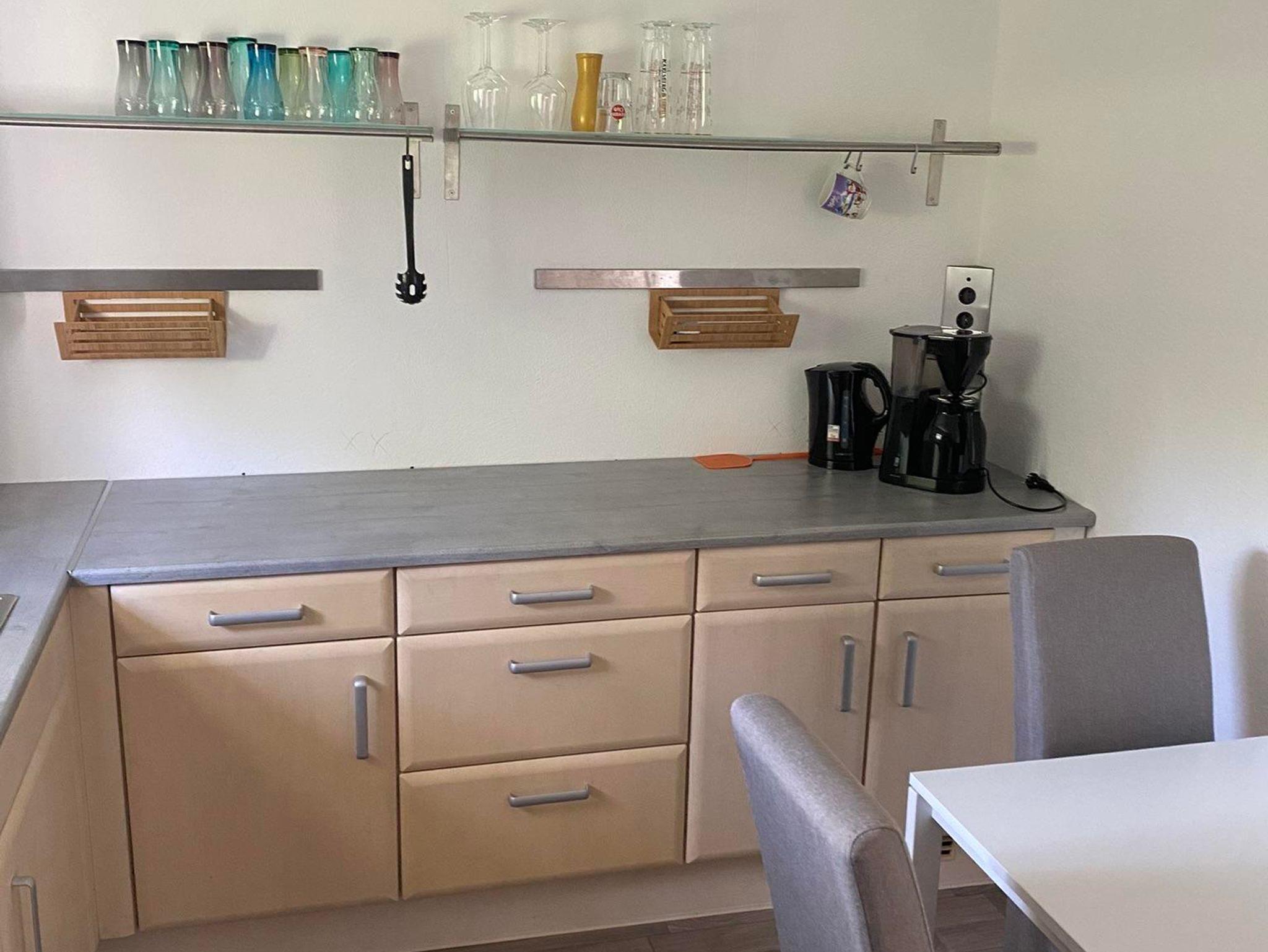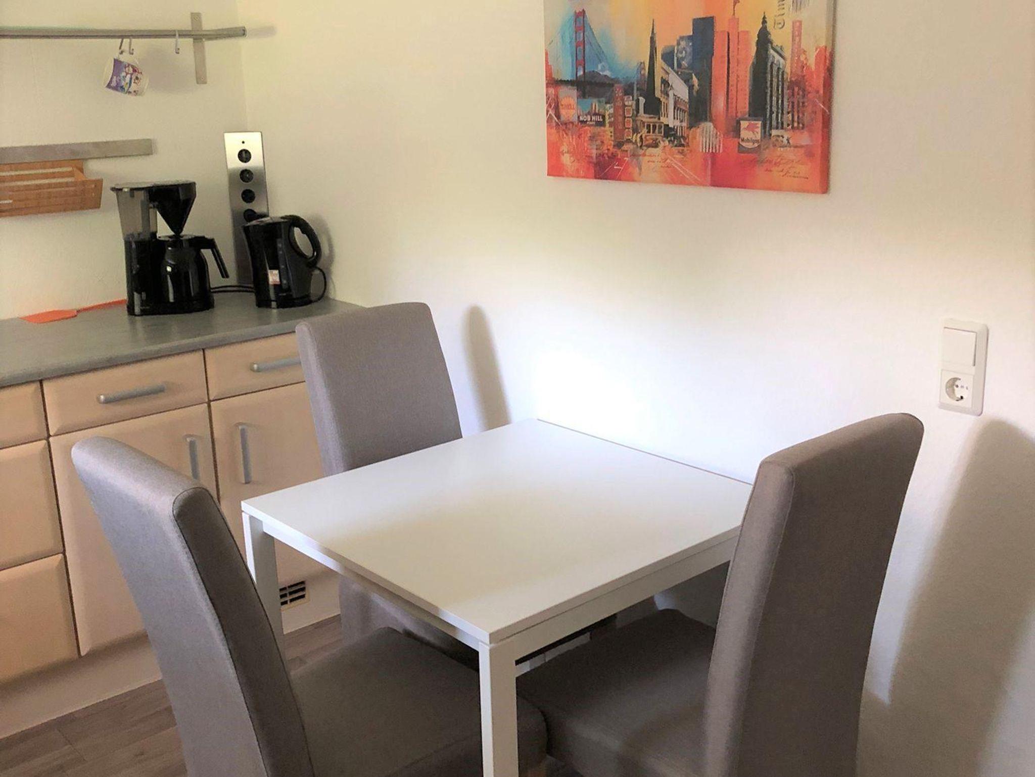 Die Ferienwohnung verfügt über einen Wohn-Schlafraum, eine voll ausgestattete Küche und ein Bad mit einer bodengleichen Dusche und einem WC. Im Wohn- Schlafraum befindet sich ein Doppelbett und ein Schlafsofa. Ein Eckschrank bietet genug Stauraum für Ihre Kleidung. Die gemütliche Sitzgruppe in der Küche bietet Platz für bis zu drei Personen. Zudem finden Sie eine Kühl-Gefrierkombination, ein Cerankochfeld mit Backofen, eine Spülmaschine, eine Kaffeemaschine sowie einen Wasserkocher.
