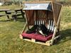 Als weitere Attraktion finden Sie im Garten den „Hasenbaudraufschaubau“: Eine großzügige, überdachte Sitzmöglichkeit mit Hängeschaukel, Stromanschluss und funktionierendem Ofen.