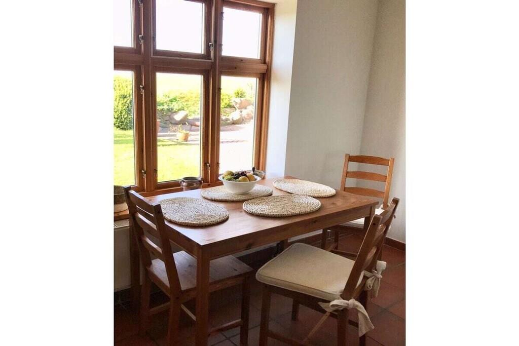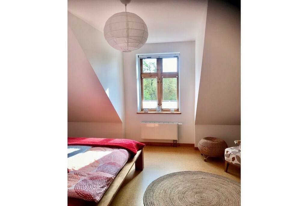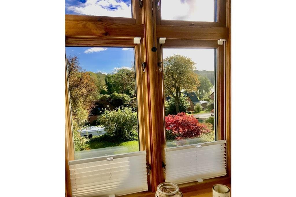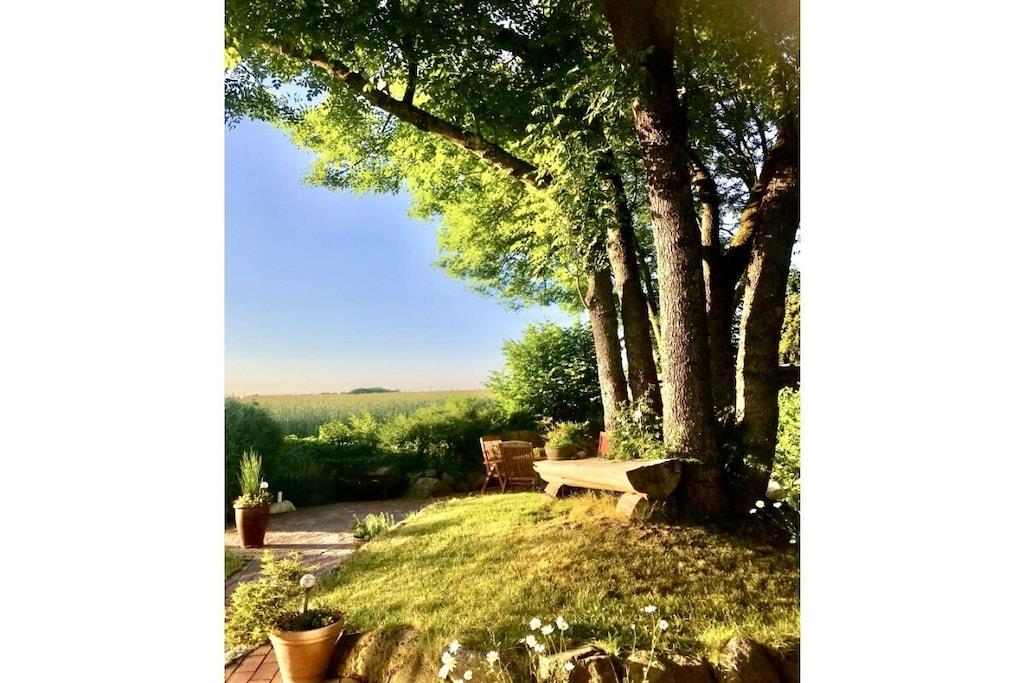 Die gemütliche Licht durchflutete 90 m2 Wohnung mit separatem Eingang ist der rechte Teil des skandinavischen Holzhauses. Sie erstreckt sich mit geräumiger Küche, Gäste WC, dem offenen Wohn- Essbereich im Erdgeschoss , 2 Schlafzimmern & Vollbad ( Dusche und Badewanne sowie 2. WC ) im Obergeschoss über 2 Ebenen und verfügt zusätzlich über eine offene Galerie / Hems unter dem Dach mit Weitblick. Durch die offene Hanglage, teilweise Blick auf Gut & See von Muggesfelde, den offenen Holztreppen nicht barrierefrei! Die eigene Terrasse mit Teak Gartenmöbeln, Relaxliegen, & Webergrill befindet sich in direkter Feldrandlage; der Freisitz unter den Eschen lädt zum Sonnenuntergang ein. WLAN zum Streamen mit eigenem Endgerät.
