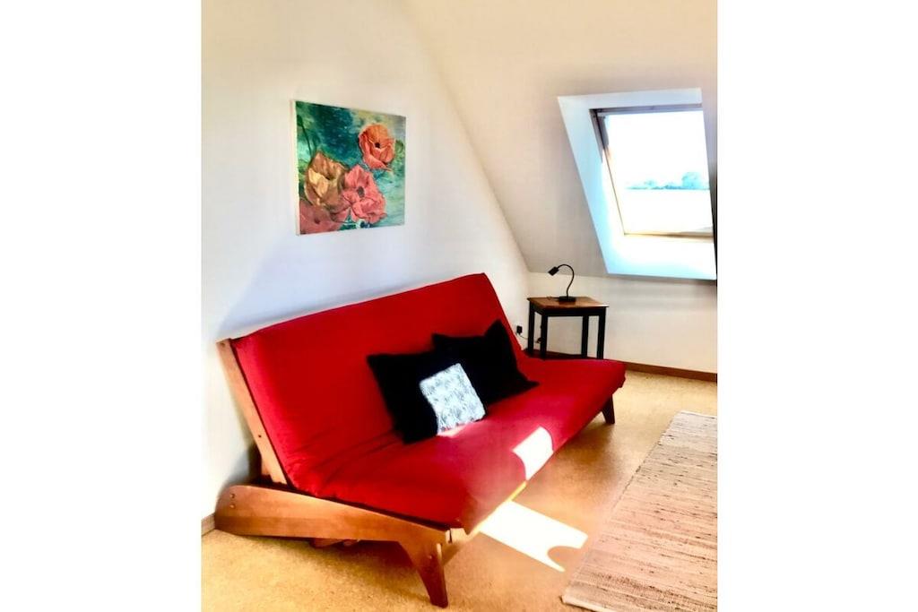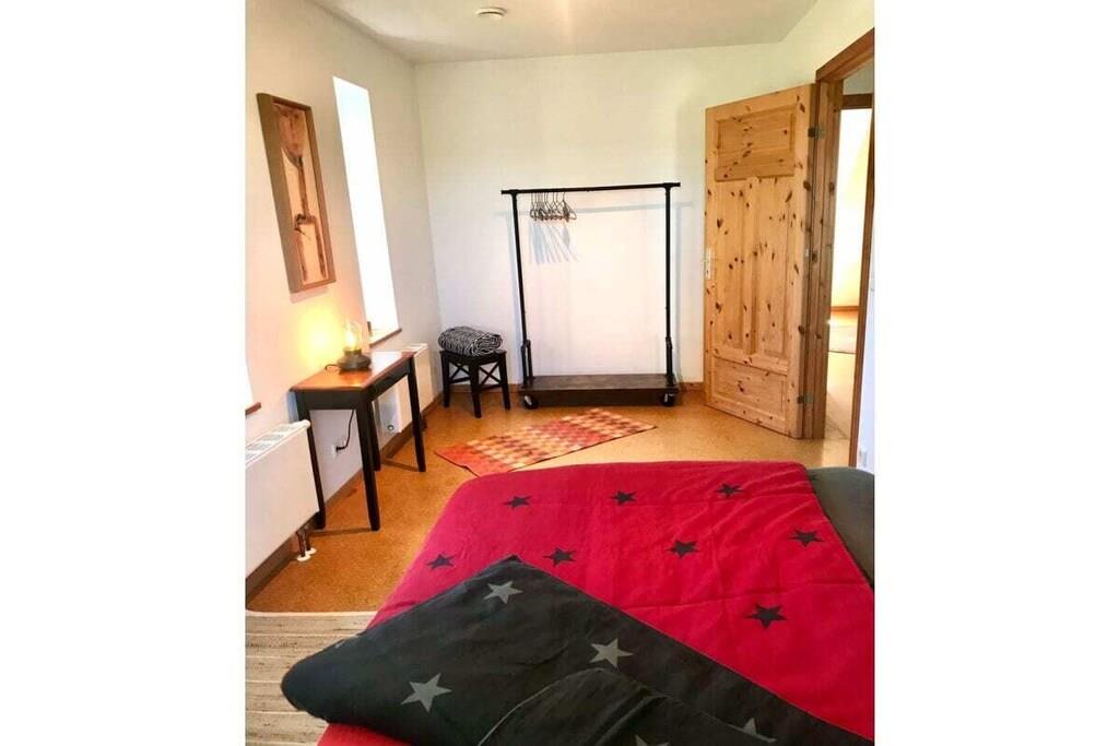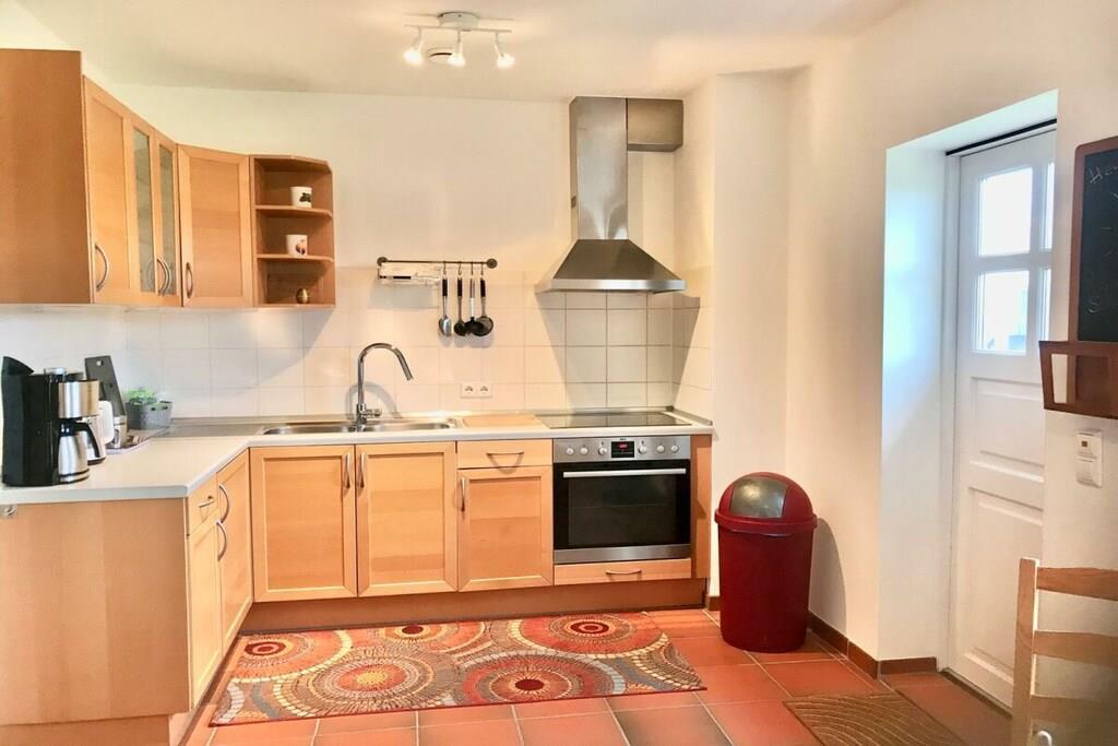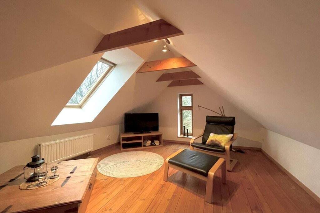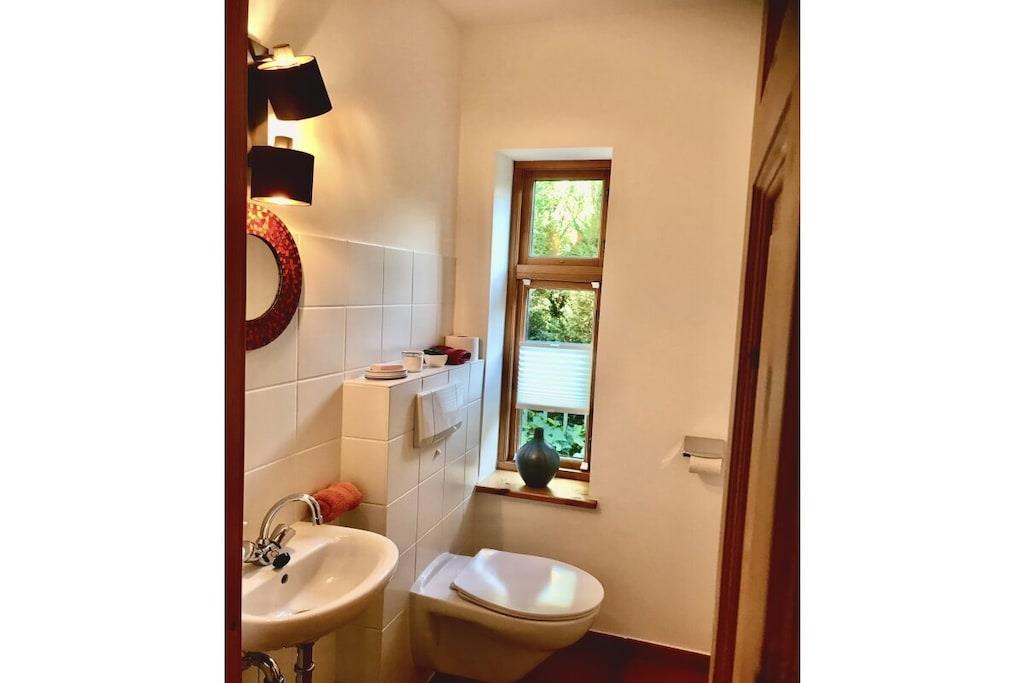 Die gemütliche Licht durchflutete 90 m2 Wohnung mit separatem Eingang ist der rechte Teil des skandinavischen Holzhauses. Sie erstreckt sich mit geräumiger Küche, Gäste WC, dem offenen Wohn- Essbereich im Erdgeschoss , 2 Schlafzimmern & Vollbad ( Dusche und Badewanne sowie 2. WC ) im Obergeschoss über 2 Ebenen und verfügt zusätzlich über eine offene Galerie / Hems unter dem Dach mit Weitblick. Durch die offene Hanglage, teilweise Blick auf Gut & See von Muggesfelde, den offenen Holztreppen nicht barrierefrei! Die eigene Terrasse mit Teak Gartenmöbeln, Relaxliegen, & Webergrill befindet sich in direkter Feldrandlage; der Freisitz unter den Eschen lädt zum Sonnenuntergang ein. WLAN zum Streamen mit eigenem Endgerät.
