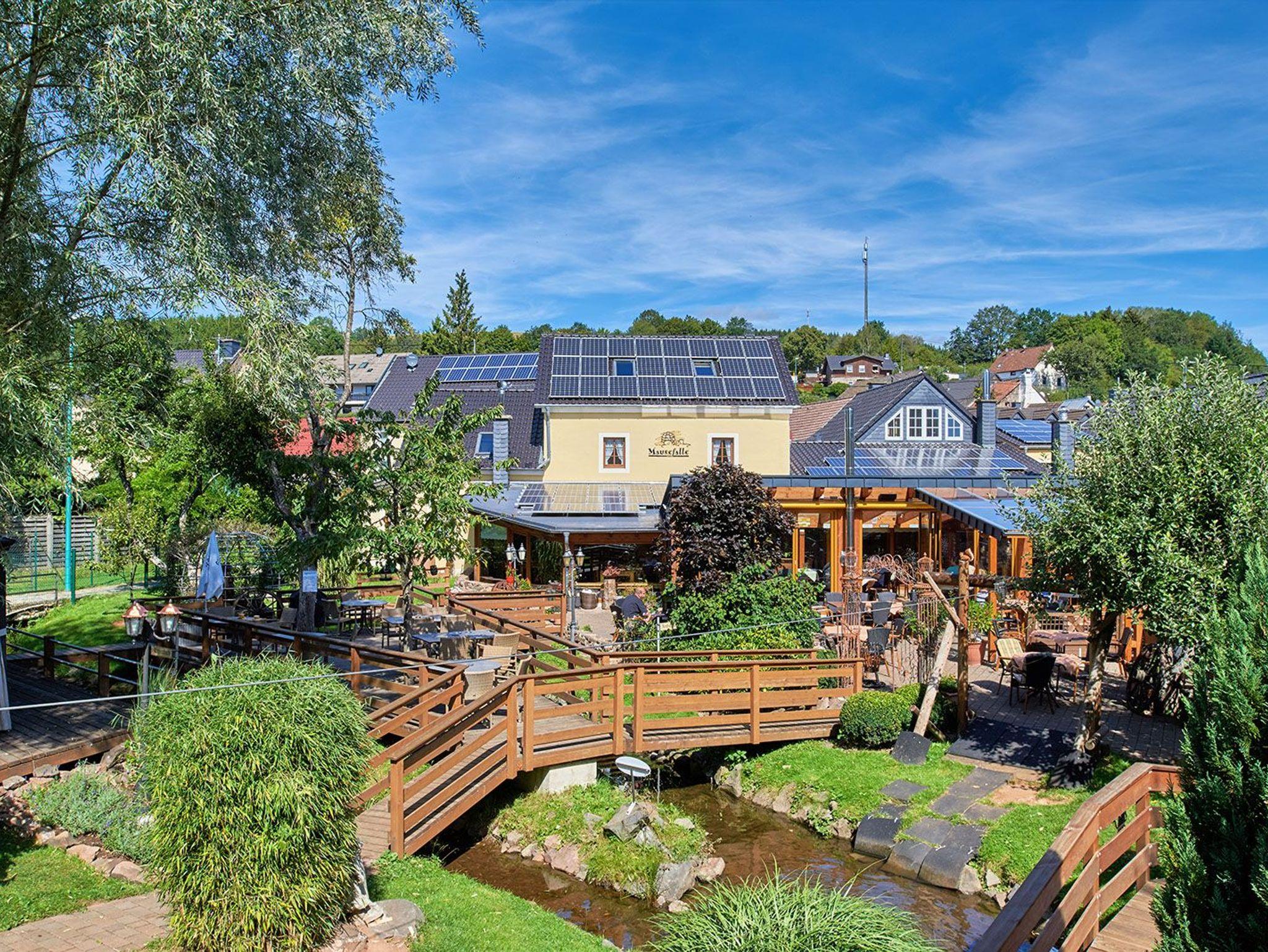 Das zum Hotel gehörende Café Restaurant Mausefalle lädt ein zu gemütlichen Stunden und verwöhnt Sie mit traditioneller Küche sowie Torten, Kuchen oder Waffeln aus eigener Herstellung. In der wärmeren Jahreszeit bietet unsere großzügige Aussenterrasse an zwei Bächen gelegen, zusätzlich Platz zur Entspannung und zur Entschleunigung. Die kleinen Gäste finden zudem in unserer weitläufigen Gartenanlage zahlreich Spielgeräte.