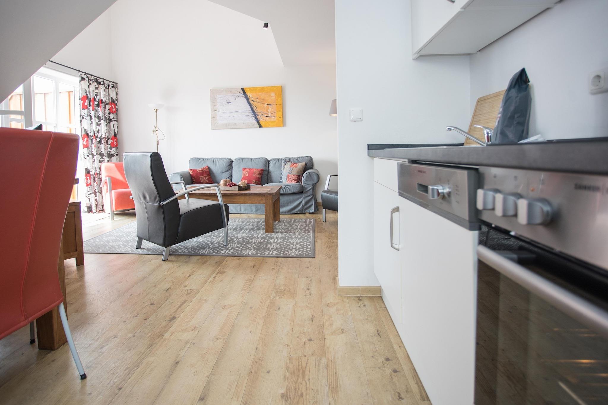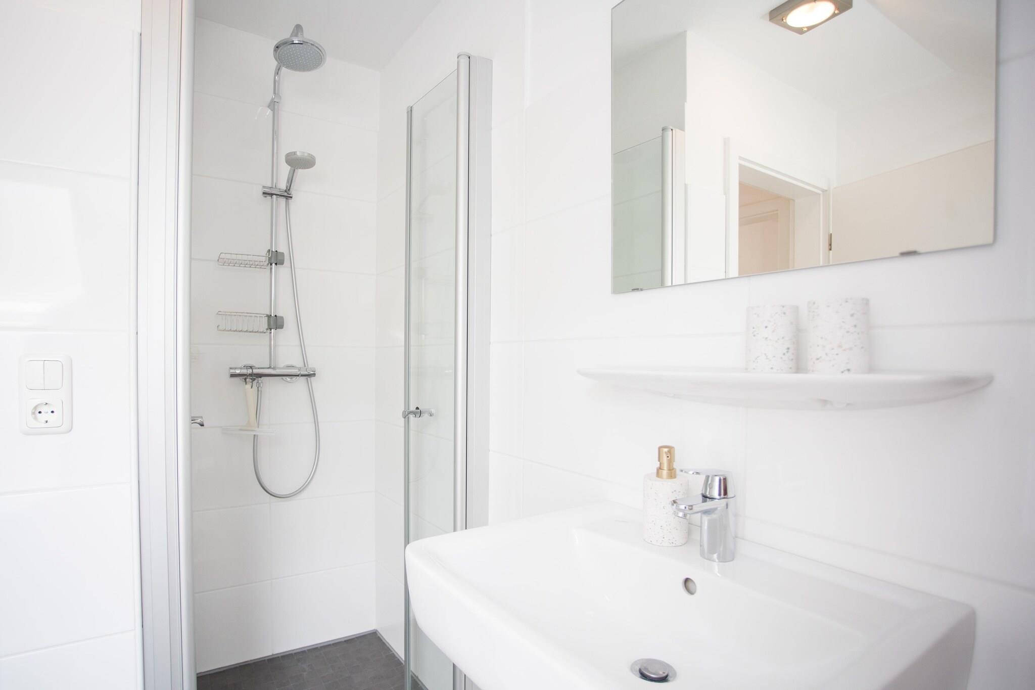 In der 2. Etage: (offene Küche(Wasserkocher, Kochherd(Induktion), Kaffeemaschine, Backofen, Mikrowelle, Spülmaschine, Kühl-/Gefrierkombination), Wohn/Esszimmer(TV, Esstisch, Sitzecke), Schlafzimmer(Doppelbett(Boxspring, 180 x 200 cm)), Schlafzimmer(Einzelbett(Boxspring, 90 x 200 cm), Einzelbett(Boxspring, 90 x 200 cm)), Galerieschlafzimmer(Einzelbett(Boxspring, 90 x 200 cm), Einzelbett(Boxspring, 90 x 200 cm)), Badezimmer(Dusche, Waschbecken, Toilette, Föhn)) Trockner(Gemeinschaftliche Nutzung mit anderen Gästen), Waschmaschine(Gemeinschaftliche Nutzung mit anderen Gästen), Balkon, Garten(Gemeinschaftliche Nutzung mit anderen Gästen), Fahrradabstellraum(Gemeinschaftliche Nutzung mit anderen Gästen), Gartenmöbel, Parkplatz