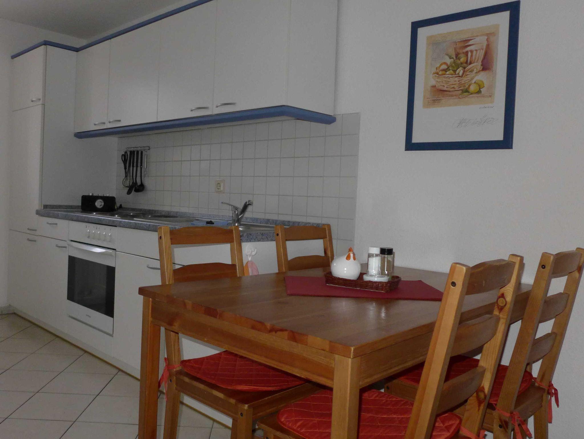 Gemütlicher Wohn-Schlafraum, Küche mit großem Esstisch, Flur und Bad.