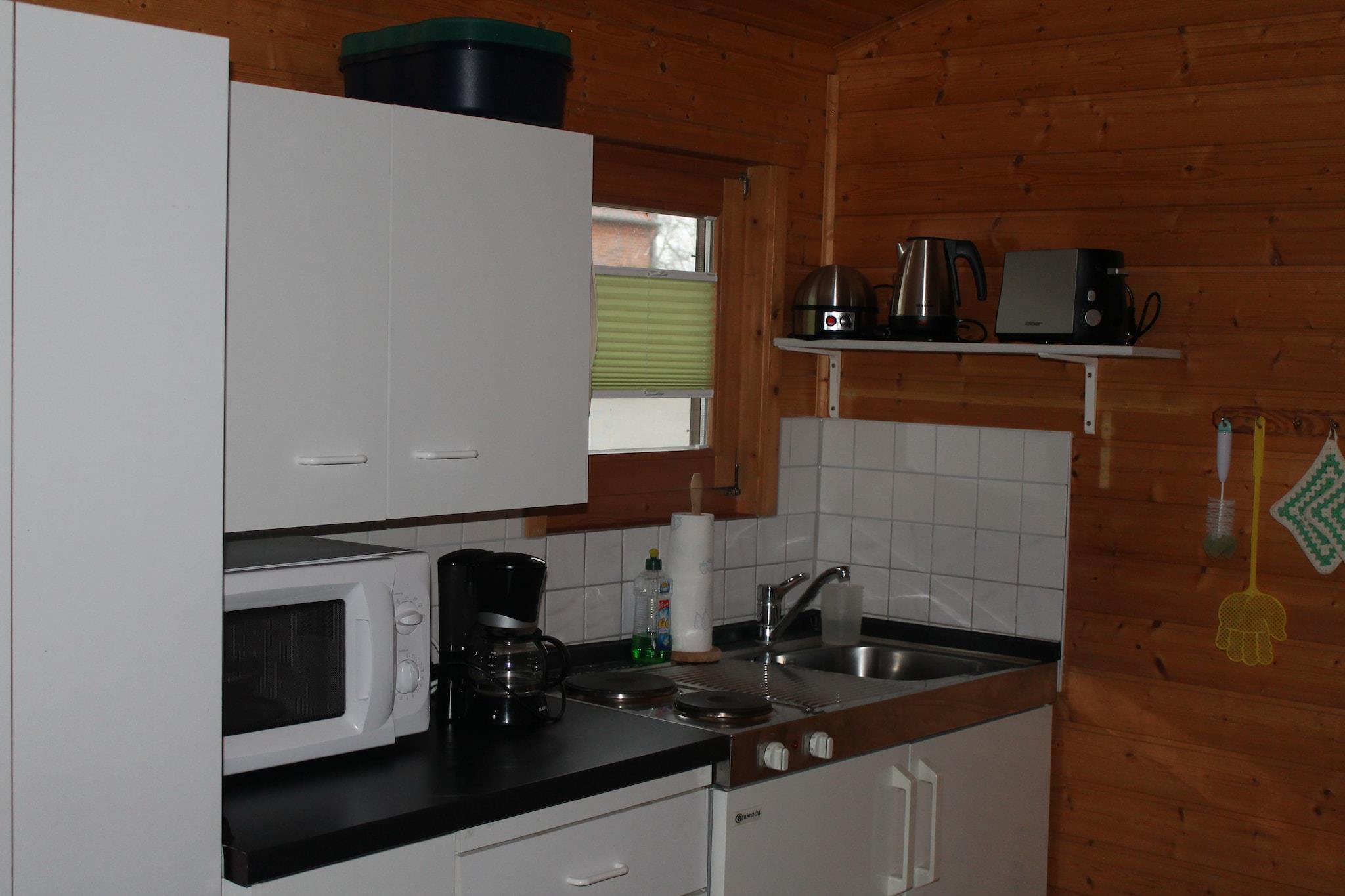 Parterre: (Kochnische(Wasserkocher, Toaster, Kochherd(2 Kochplatten), Kaffeemaschine, Mikrowelle, Kühlschrank), Wohn-/Schlafzimmer(TV(Satellit), Sitzecke), Schlafzimmer(2x Einzelbett), Badezimmer(Dusche, Waschbecken, Toilette), Babybett, Heizung) Terrasse(überdacht), Garten, Gartenmöbel, Grill, Parkplatz, Sandkasten, Spielgeräte