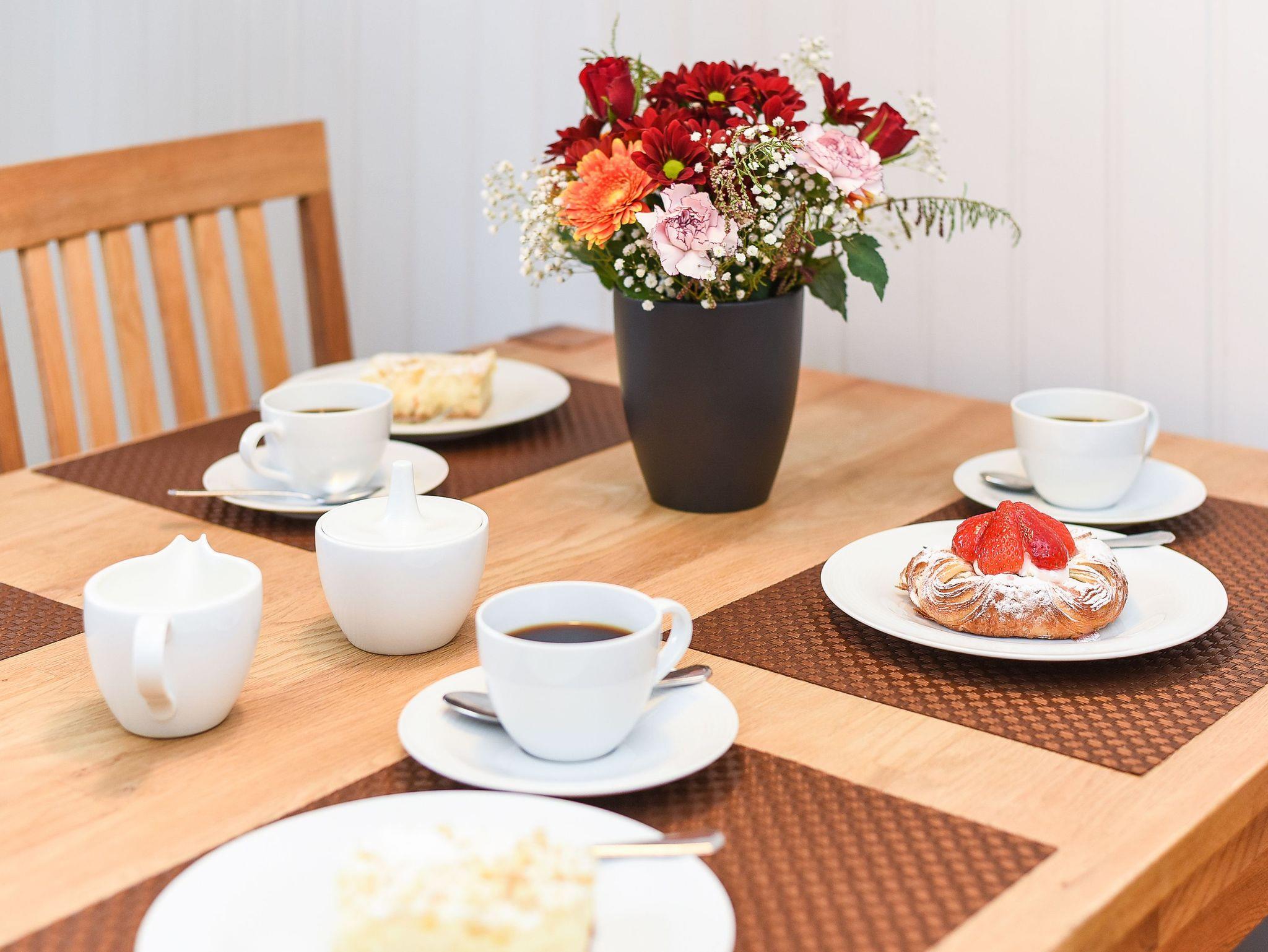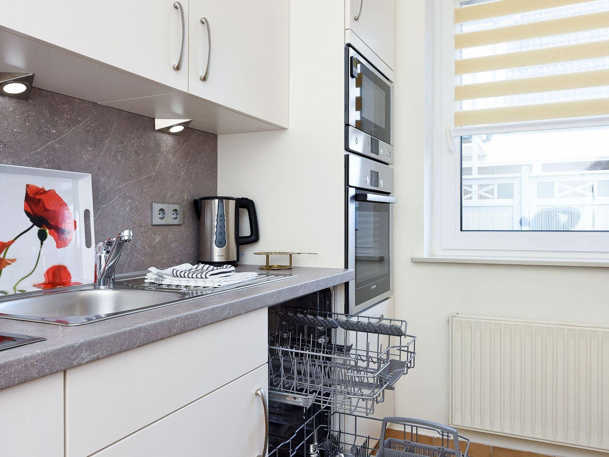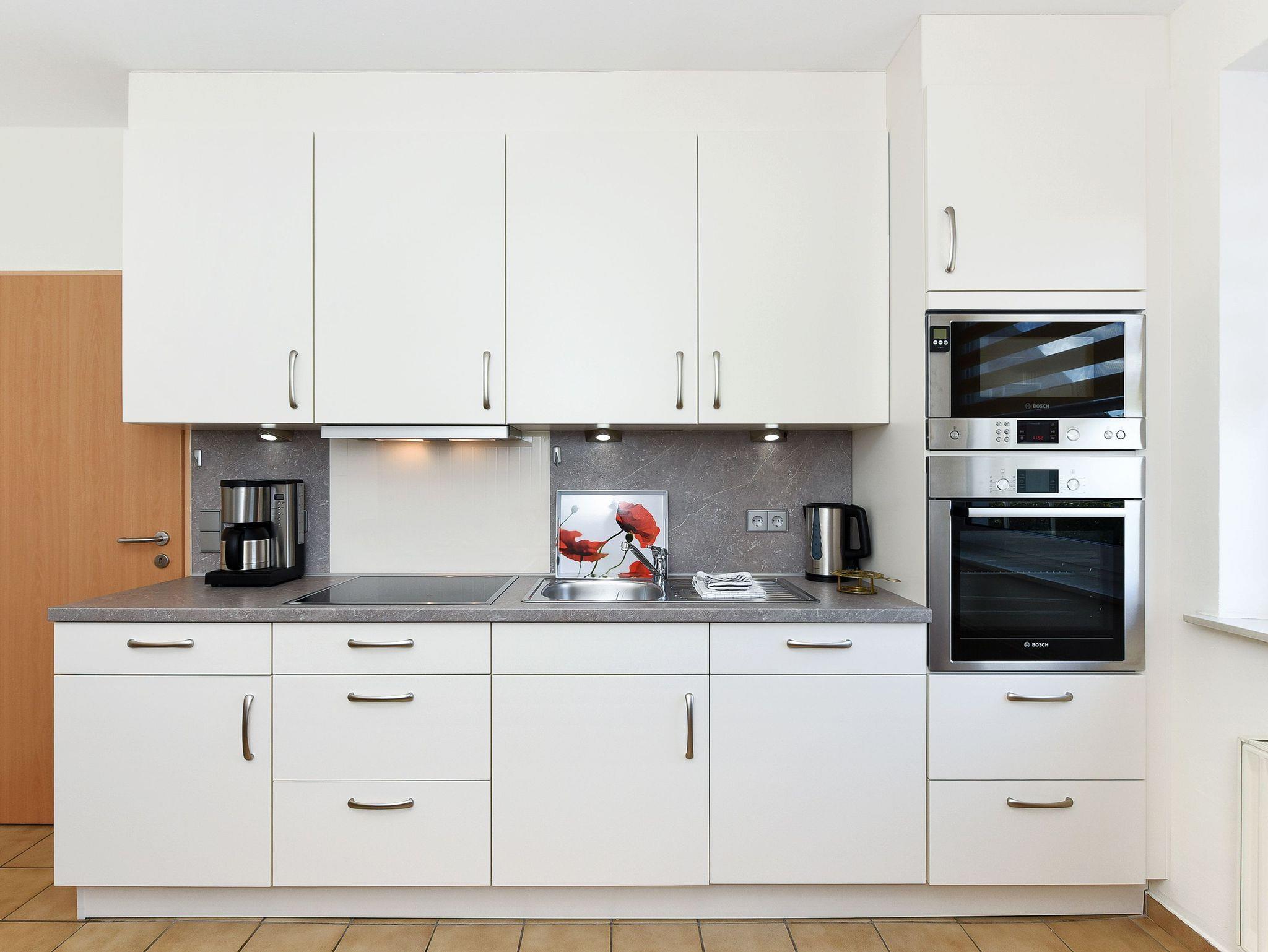 Unsere Wohnung „unten“ hat eine Terrasse. Ein schöner großer Garten steht Ihnen ebenfalls zur Verfügung. Natürlich gibt es in allen Wohnungen voll ausgerüstete moderne Einbauküchen und alles, was man überhaupt im Urlaub benötigen könnte. Jede Wohnung verfügt über eine Mikrowelle, Geschirrspüler ist in der größeren Wohnung vorhanden und Waschmaschine sowie Wäschetrockner stehen für Sie im Waschraum zur Verfügung.