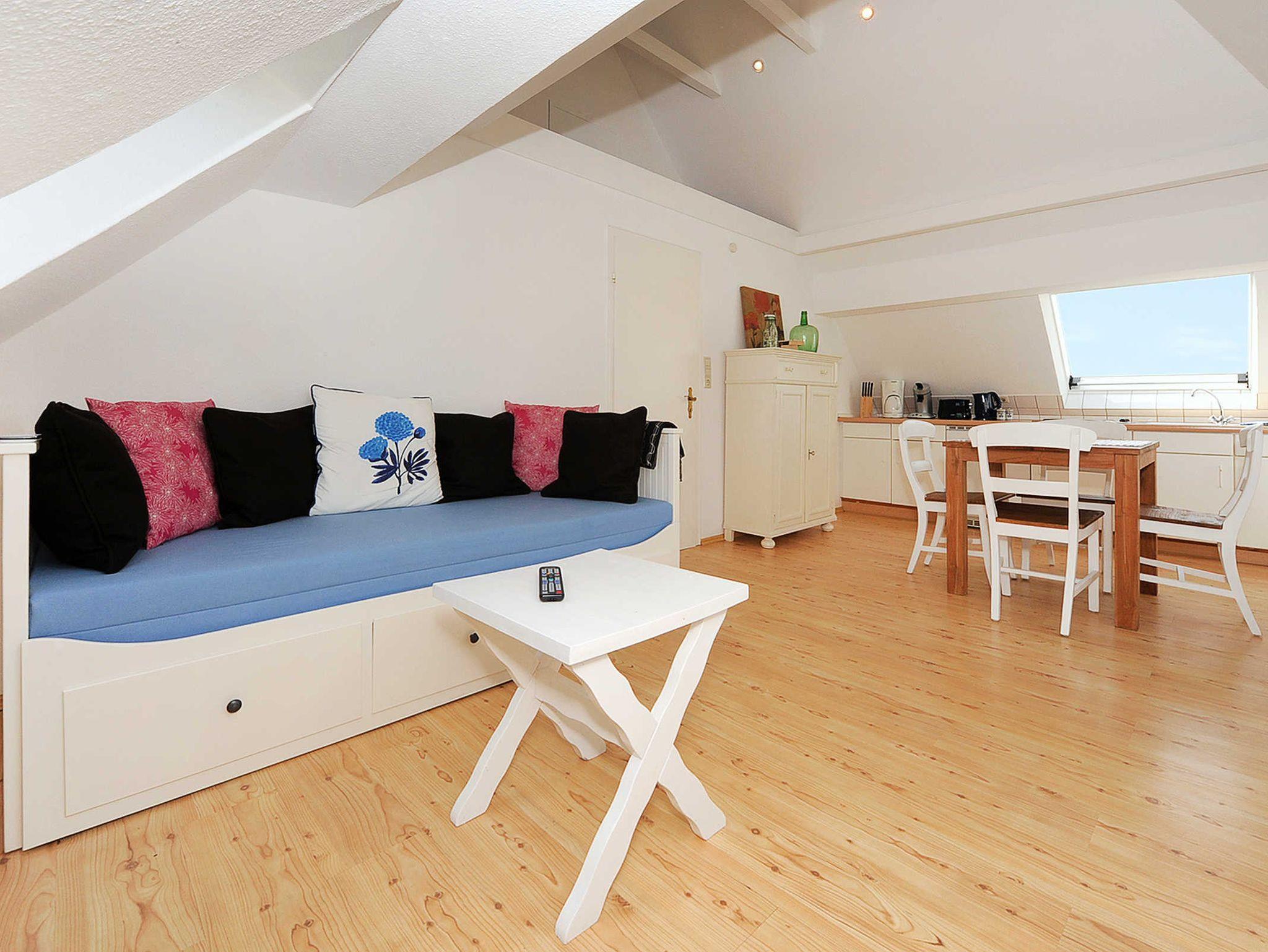 Das Sofa im Wohnzimmer dieser Wohnung kann gegebenenfalls ausgezogen und als Doppelbett genutzt werden. Dadurch steigt die Zahl der Personen, die in dieser Wohnung wohnen können, um zwei erwachsene Personen auf insgesamt bis zu vier Personen an.