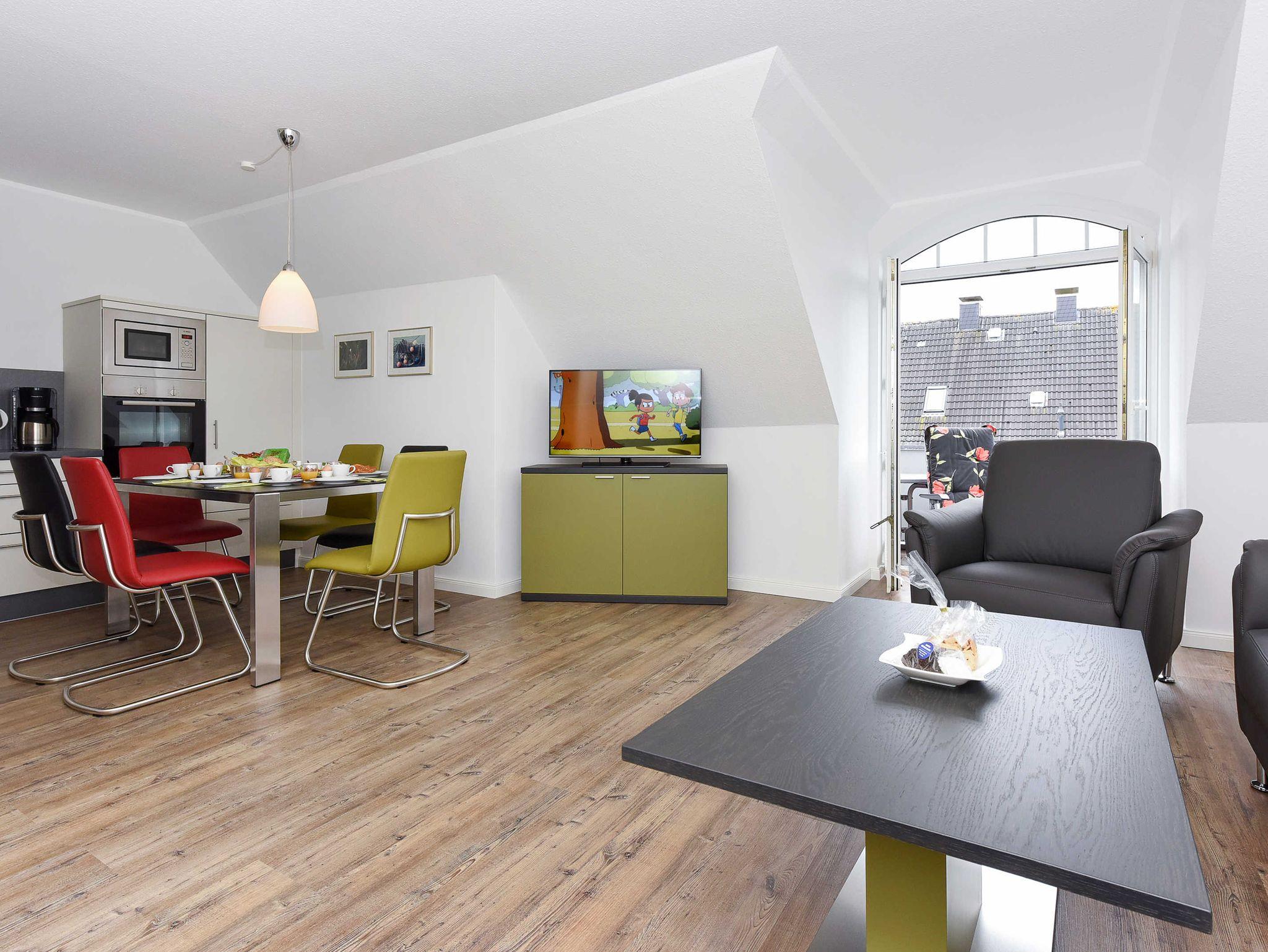 Größe ca. 90 Quadratmeter, Wohnraum mit integrierter Küche und Essgruppe, Schlafzimmer, zweites separates Schlafzimmer/Kinderzimmer, drittes separates Schlafzimmer, Badezimmer mit Dusche, Waschtisch und WC, Obergeschoss, Balkon, optimal für 2 bis 6 Personen und zusätzlich ein Kleinkind.