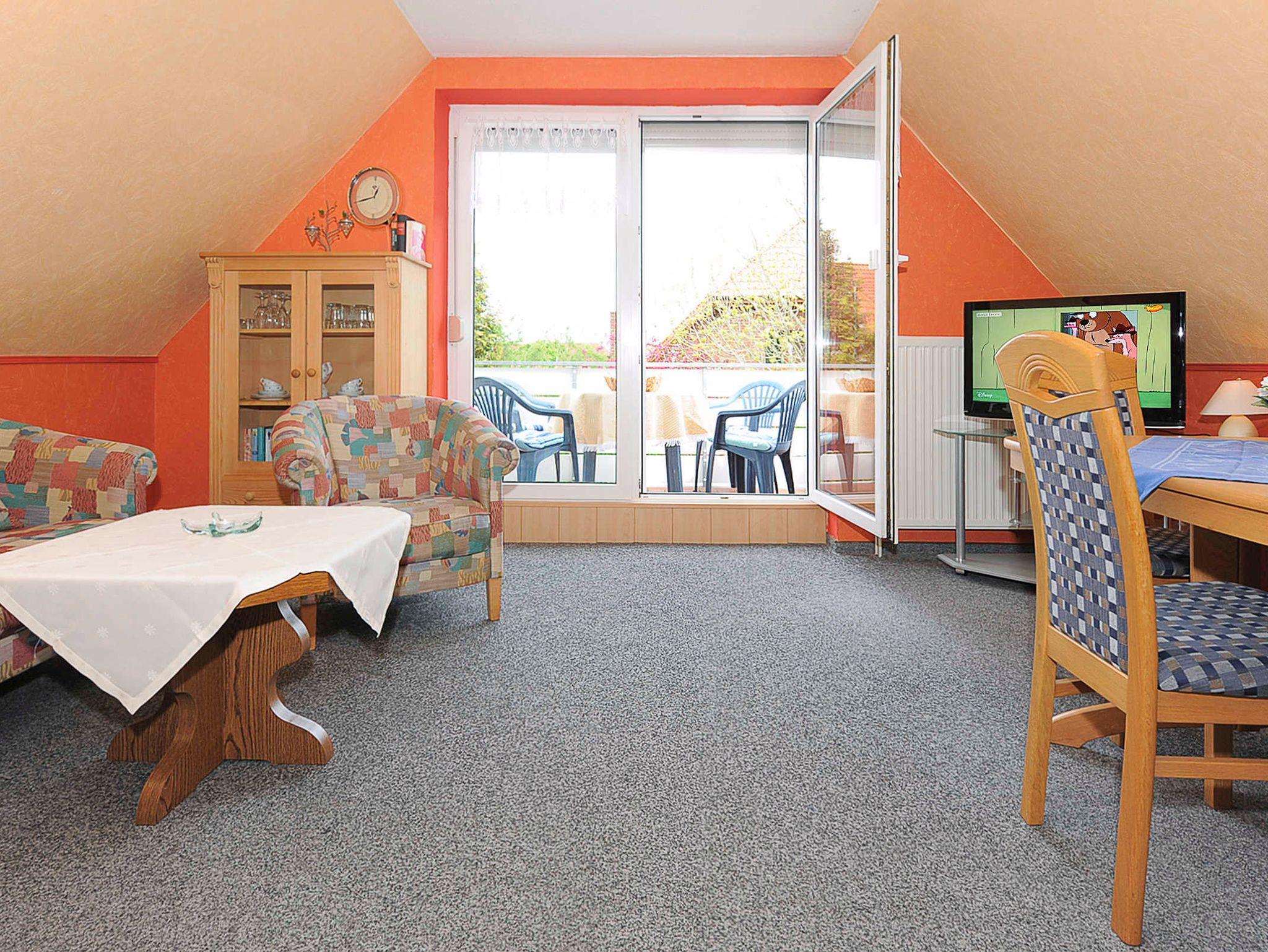 Größe ca. 50 Quadratmeter, Wohnraum mit integrierter Küche, Schlafzimmer, zweites separates Schlafzimmer/Kinderzimmer, Badezimmer mit Dusche, Waschtisch und WC, Obergeschoss, Balkon, optimal für 2 bis 4 Personen.