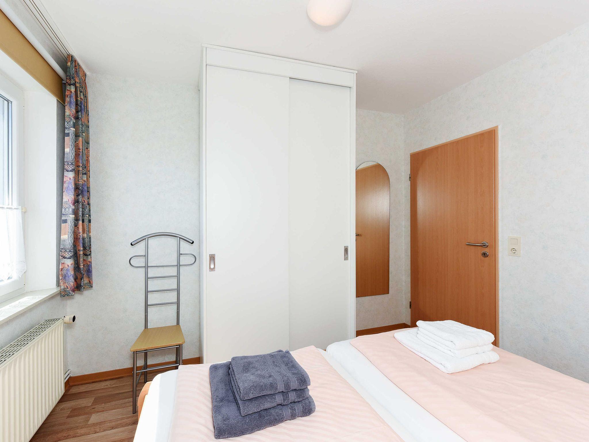Größe ca. 45 Quadratmeter, Wohnraum mit integrierter Küche und Essgruppe, Schlafzimmer, Badezimmer mit Dusche, Waschtisch und WC, Obergeschoss, Balkon, optimal für 2 Personen.