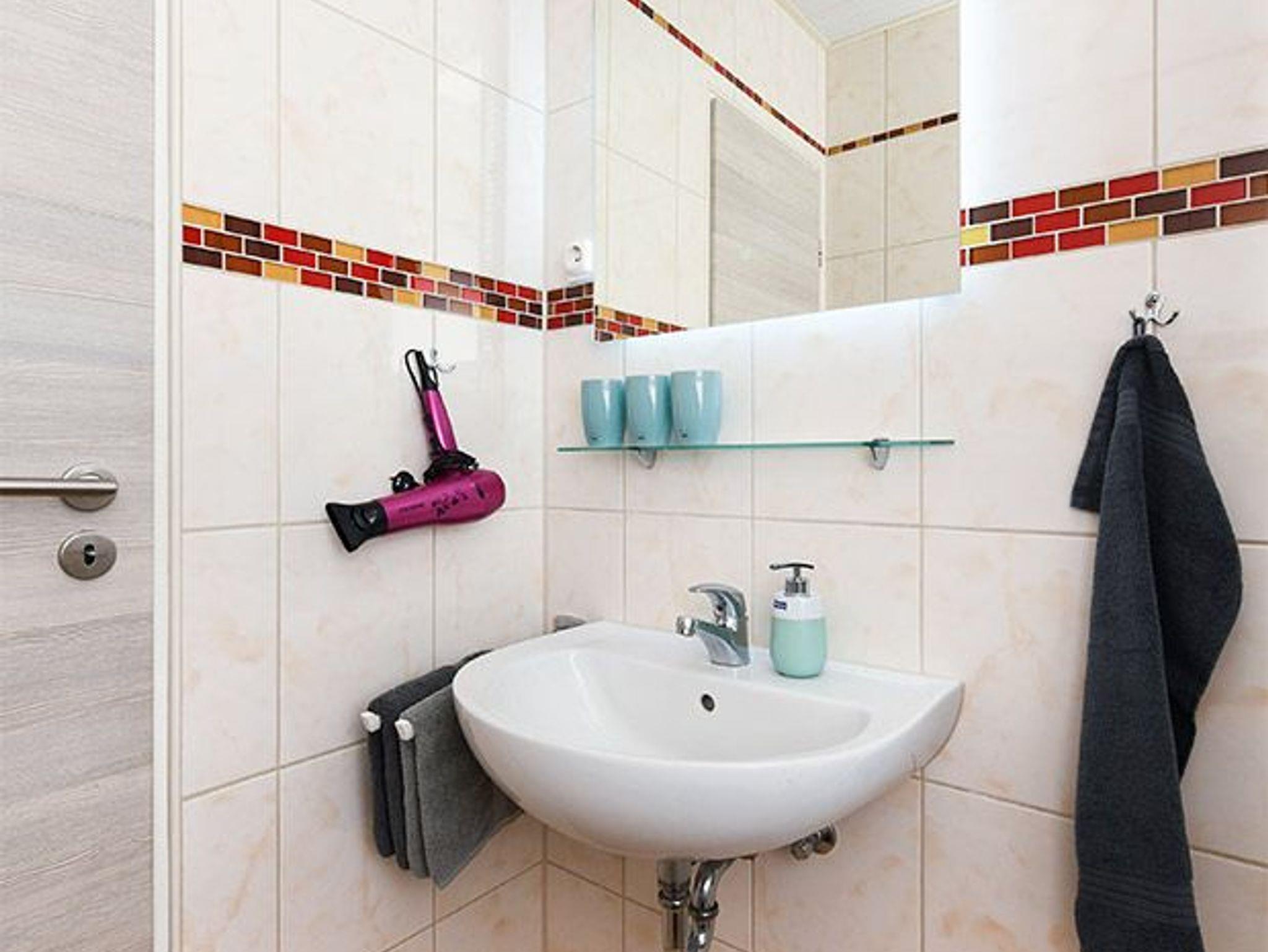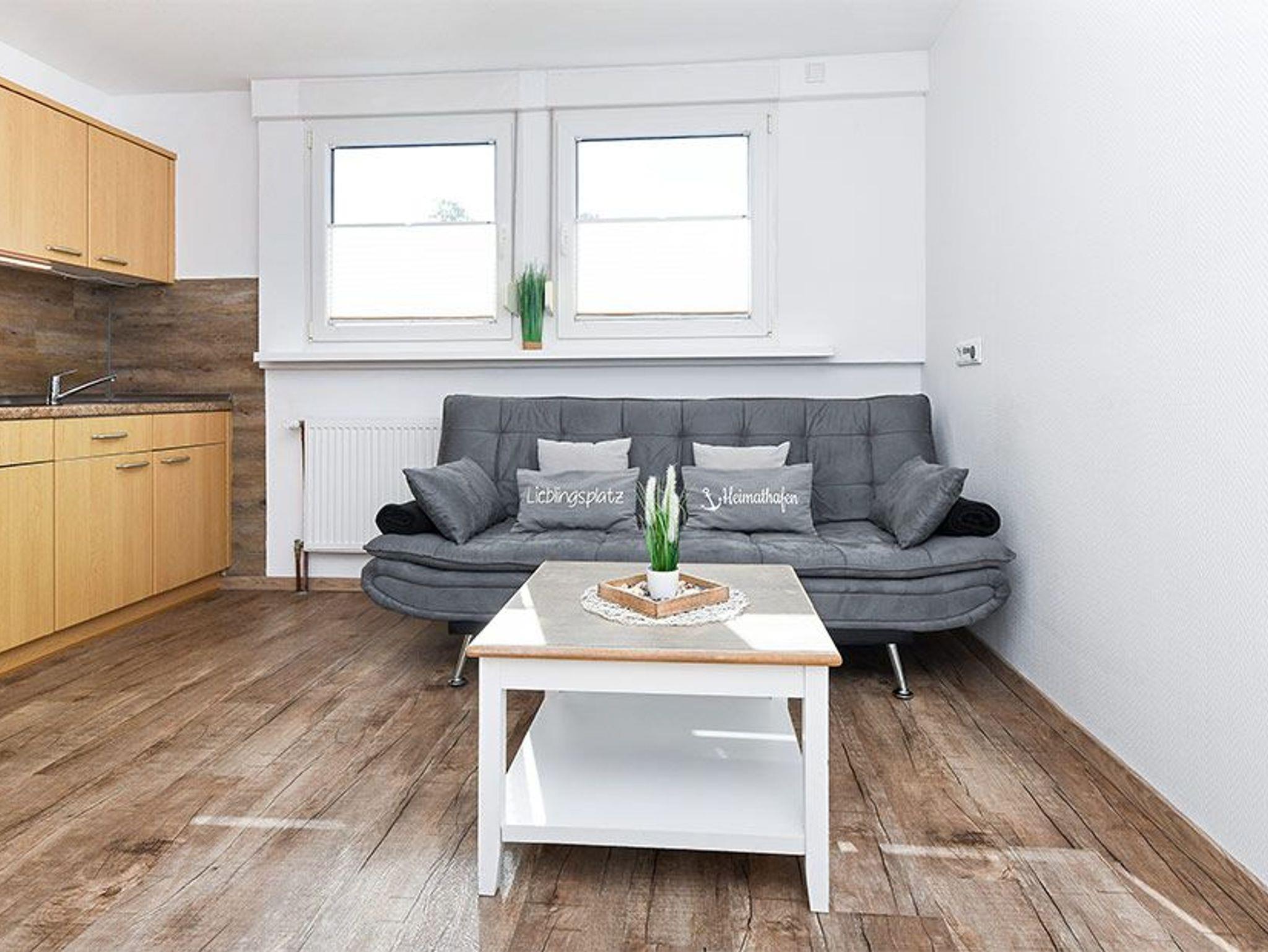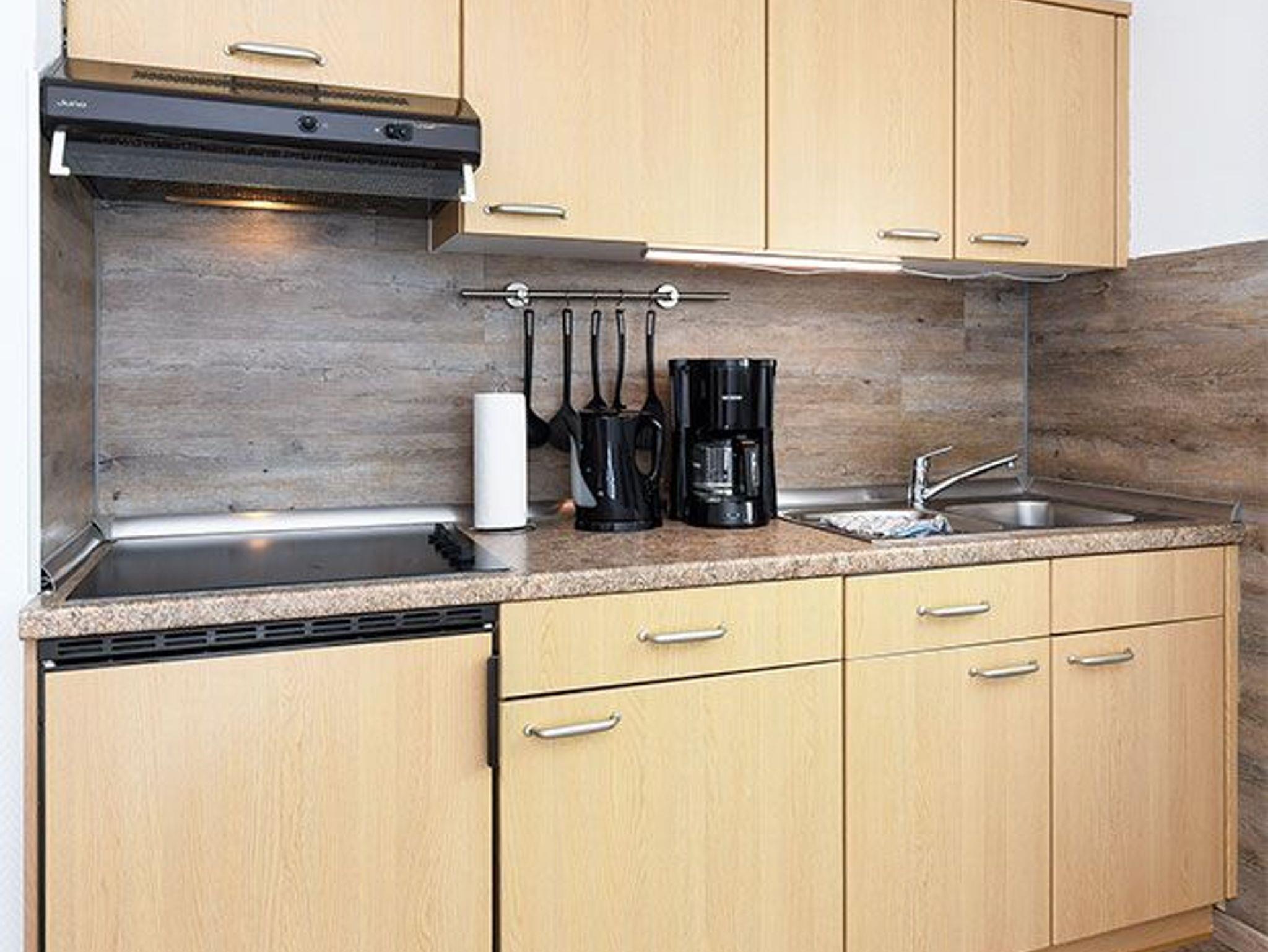 Größe ca. 35 Quadratmeter, Wohnraum mit integrierter Küche, Schlafzimmer, Badezimmer mit Dusche, Waschtisch und WC, Obergeschoss, optimal für 1 bis 4 Personen.
