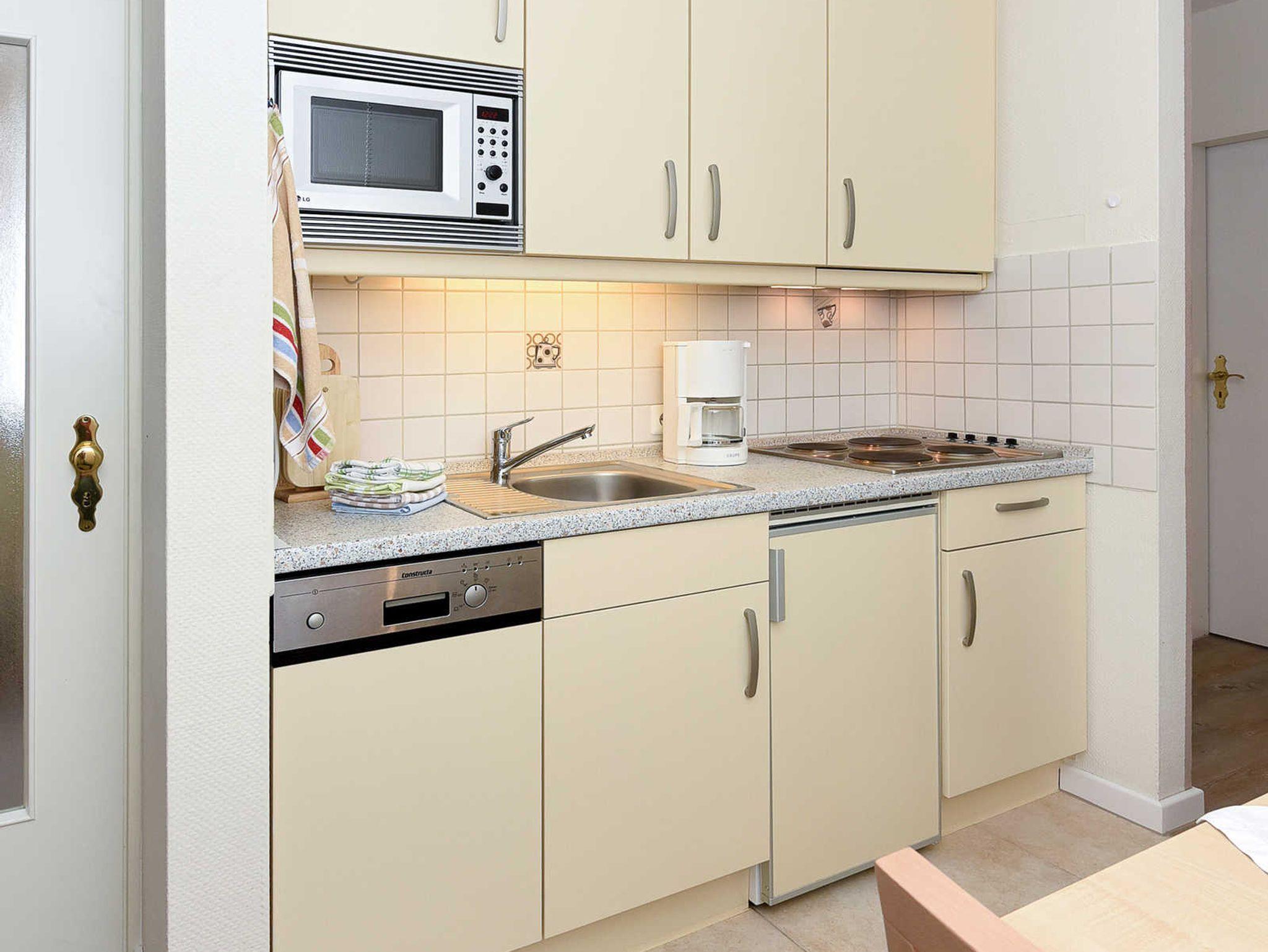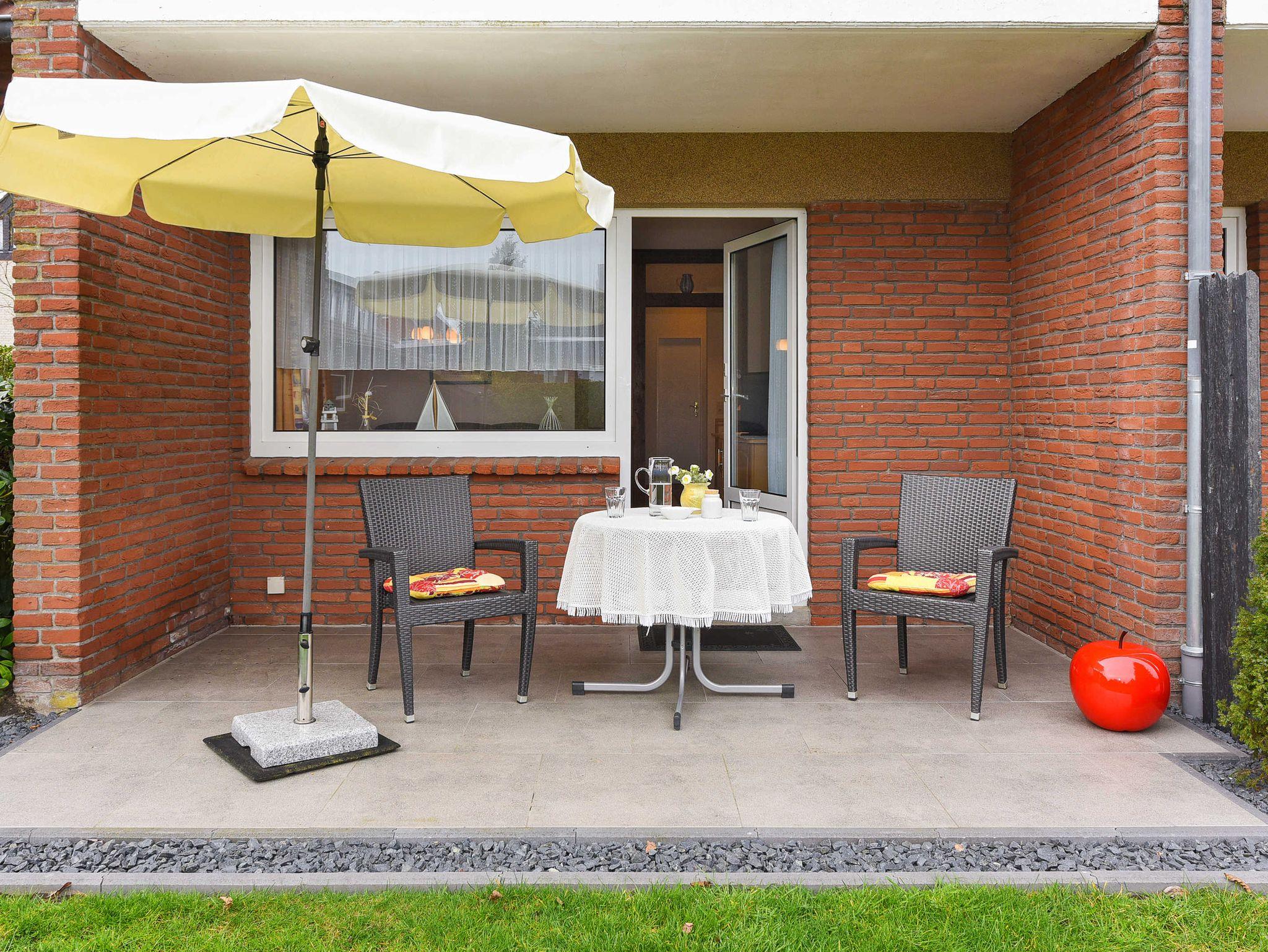 Größe ca. 44 Quadratmeter, Wohnraum mit separatem Küchenteil bei offener Raumgestaltung, Schlafzimmer, zweites separates Schlafzimmer/Kinderzimmer, Badezimmer mit Dusche, Waschtisch und WC, Erdgeschoss, Terrasse, optimal für 2 bis 4 Personen.