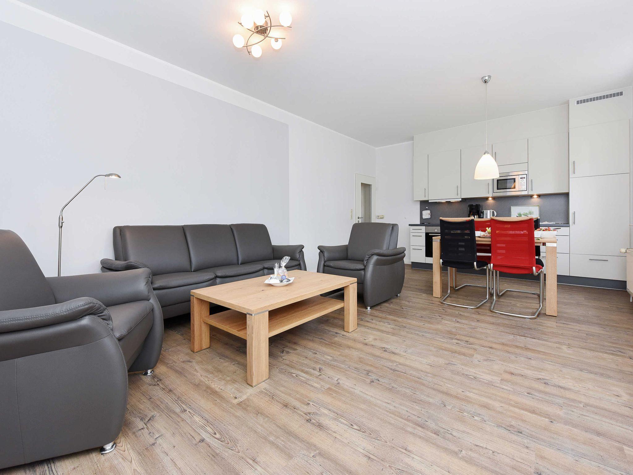 Größe ca. 66 Quadratmeter, Wohnraum mit integrierter Küche und Essgruppe, Schlafzimmer, zweites separates, Schlafzimmer, Badezimmer mit Dusche, Waschtisch und WC, Erdgeschoss, Terrasse, Koffer-/Abstellraum, optimal für 2 bis 4 Personen und zusätzlich ein Kleinkind.