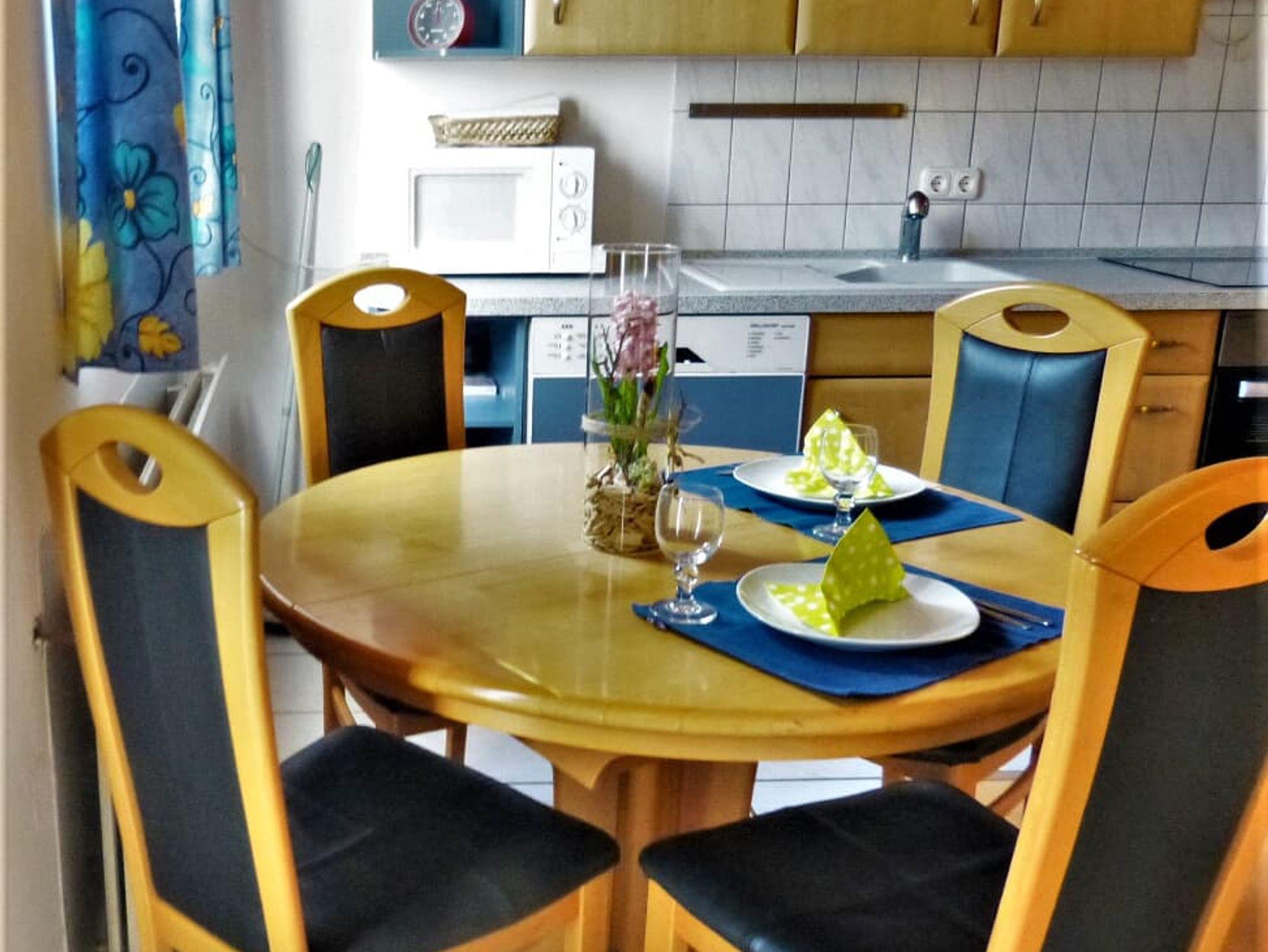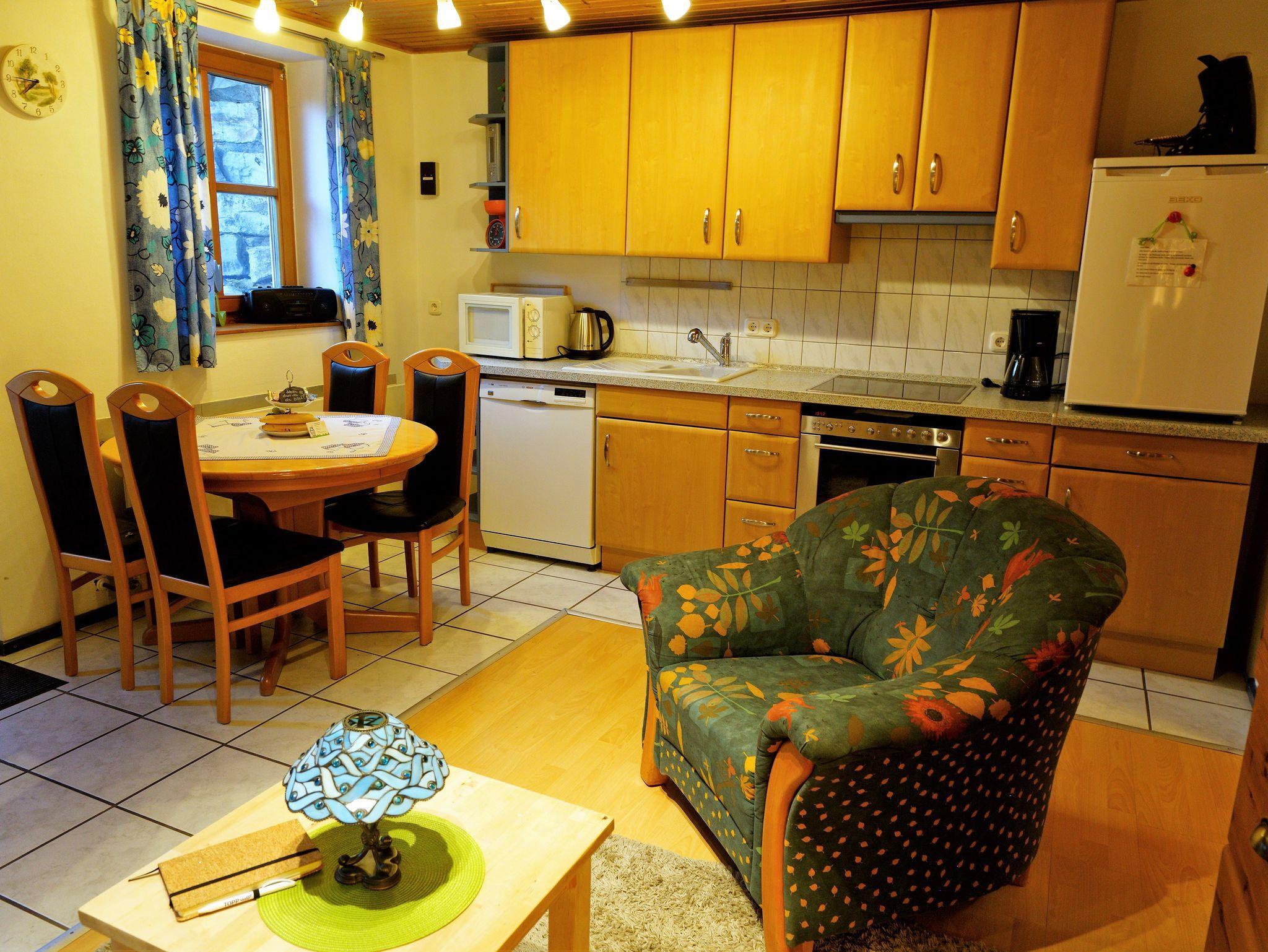 Sie verfügt über eine voll eingerichteten Küchenzeile mit Backofen, Mikrowelle, Toaster, Spülmaschine, Kaffeemschine und Kühlschrank mit 3* Gefirefach,