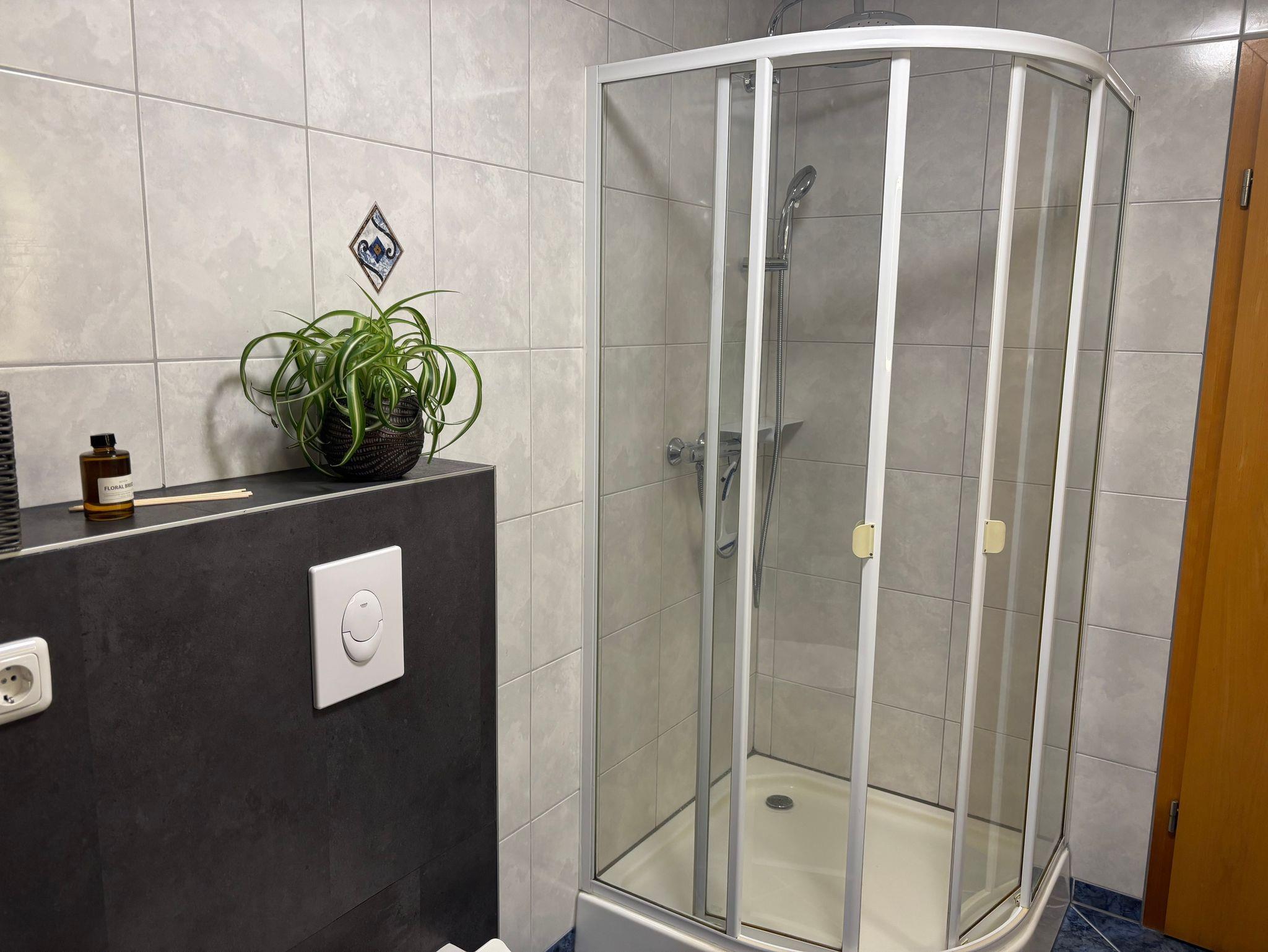 WC mit Dusche,Fußbodenheizung,Spiegel mit Beleuchtung, Handtuchhalter und ausreichend Stauraum für Ihre Utensilien.