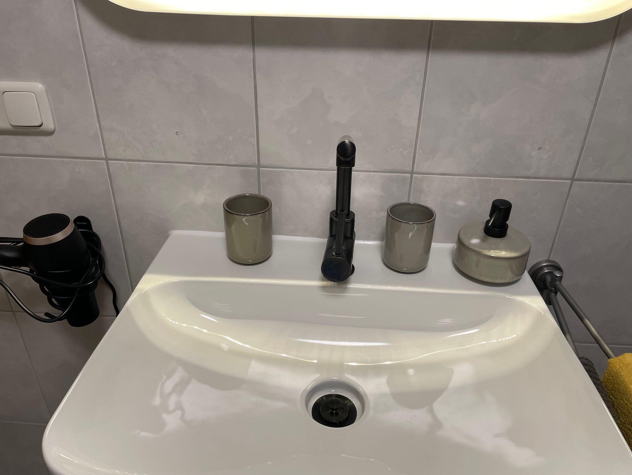 Inklusive sind: Hand und Badetücher, Haartrockner, Seifenspender und Zahnputzbecher
