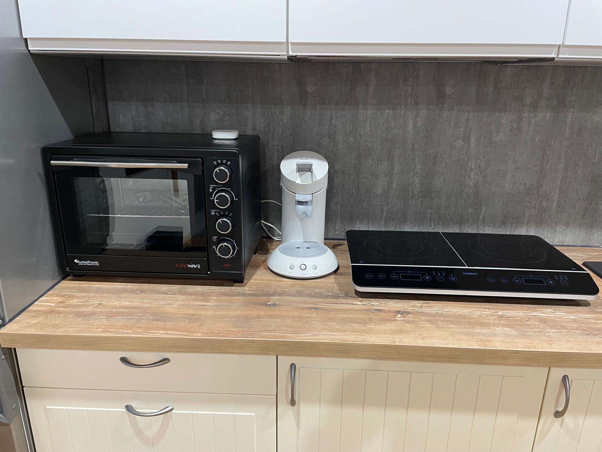 Kühl/Gefrierkombi,Minibackofen (braten,grillen,aufwärmen,toasten Doppelinduktionsplatte, Kaffee Padmaschine, Wasserkocher,Toaster,Eierkocher und Geschirr.