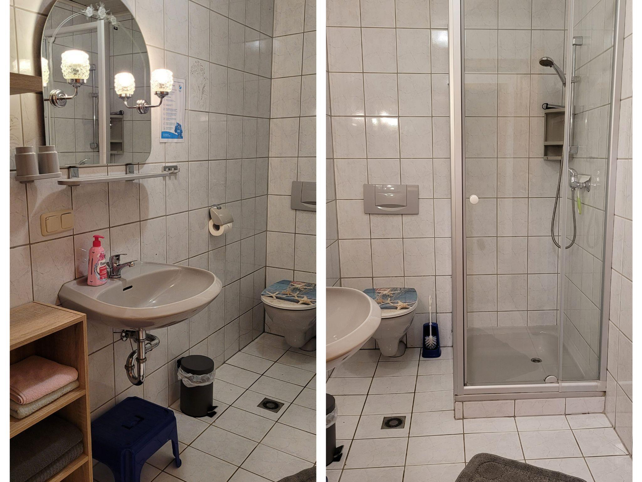 Gemütliche Ferienwohnung mit 2 Schlafzimmern, Wohnküche, Dusche. Verbindungstür zum Kinderzimmer, im Kinderzimmer ein Etagenbett und ein Einzelbett.