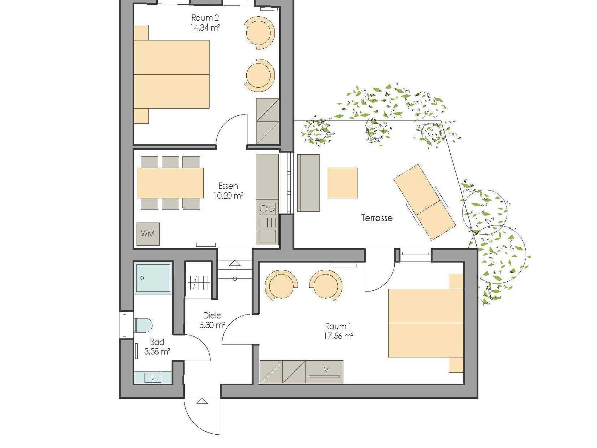 Schlafzimmer, Küche mit Essplatz, Bad und eine gemütliche Südterrasse