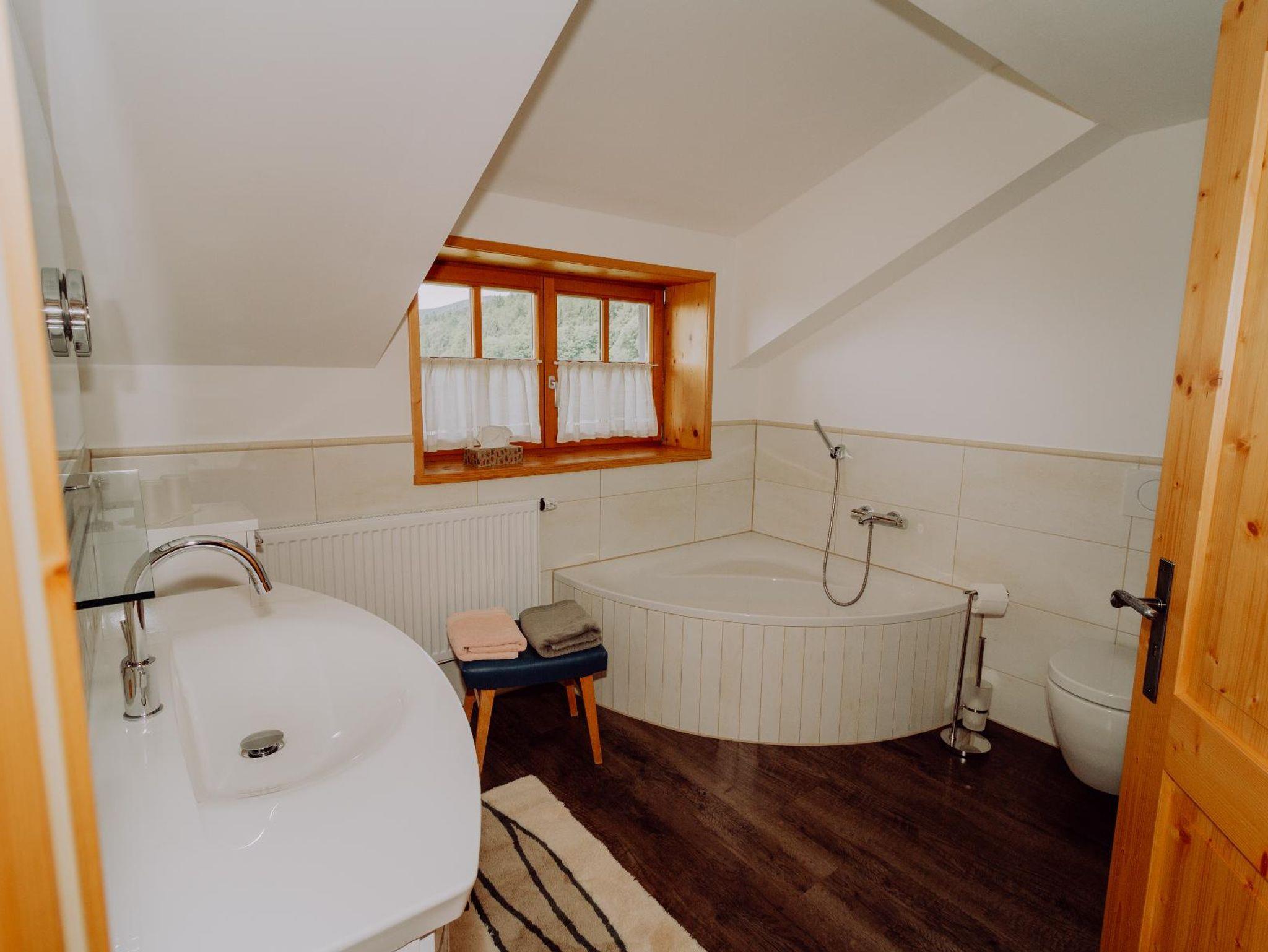 Sogar im Woschhaus, das im 1. Stock liegt, genießt man einen traum-haften Blick auf die Bayerwaldberge. Ob beim Baden in der Eckbade- wanne oder in der Großdusche – die Aussicht ist herrlich. Neben einem großen Waschtisch und WC stehen zudem Handtücher und Badetücher bereit. Im Erdgeschoss befindet sich noch ein extra WC.