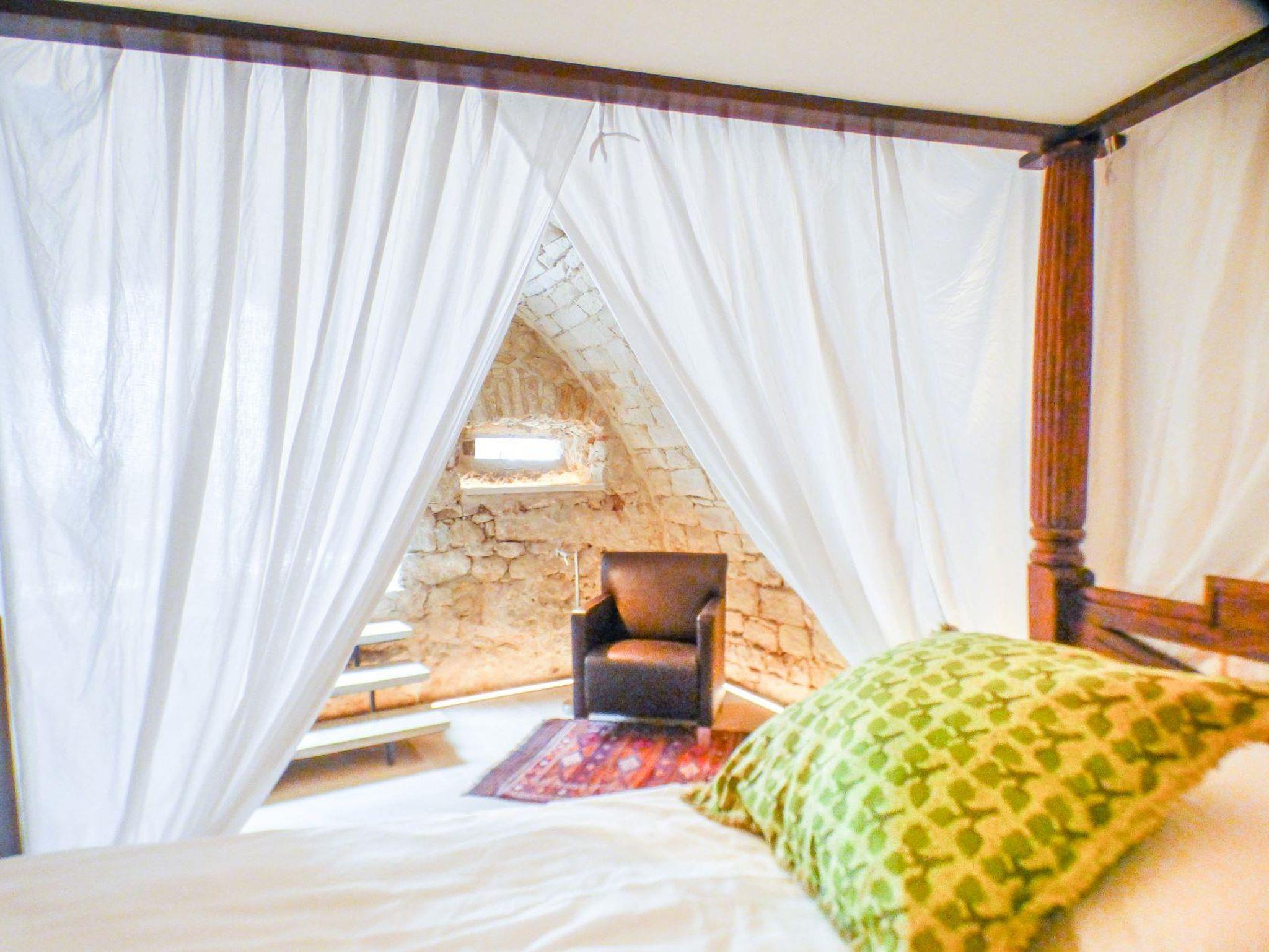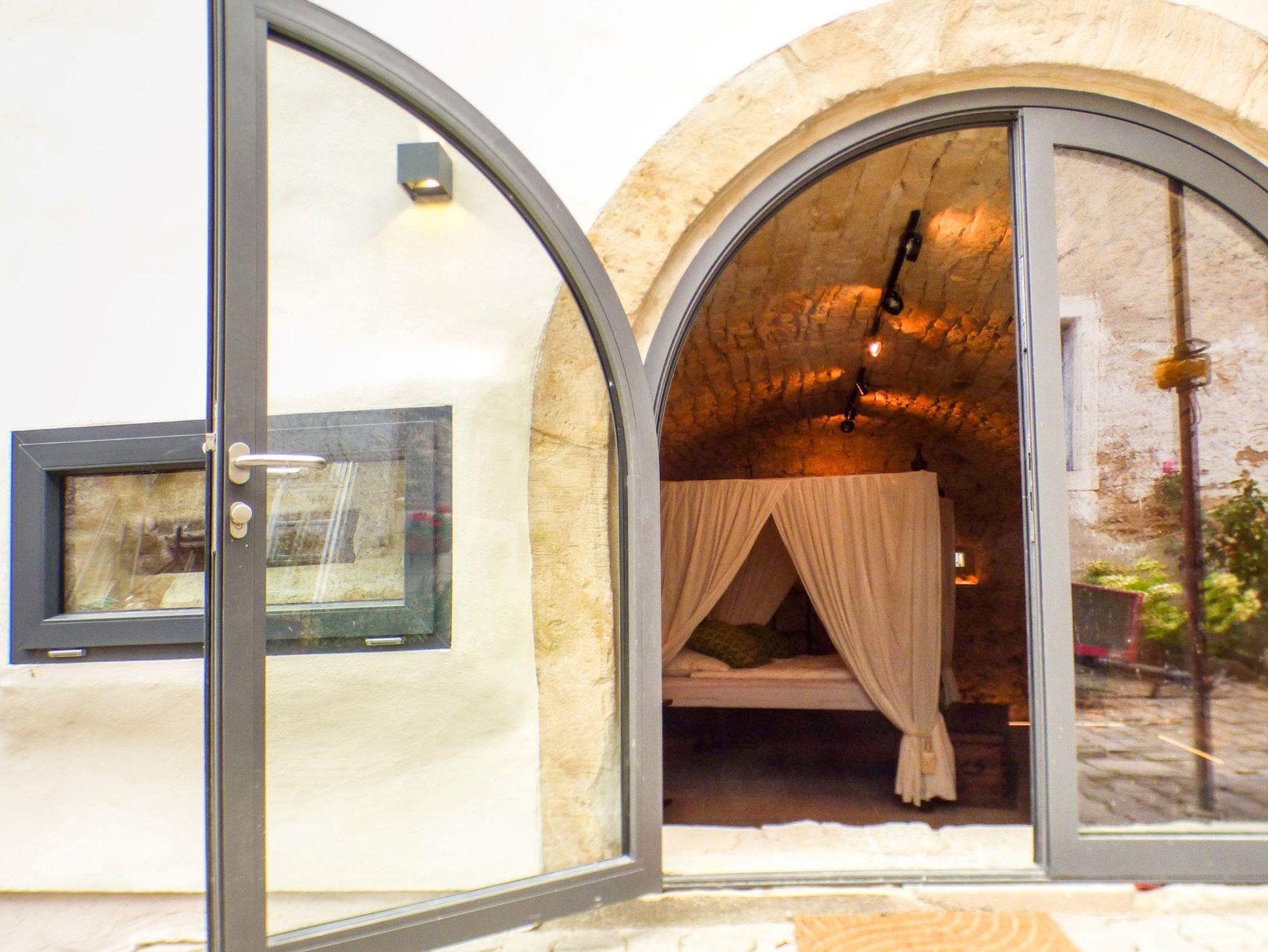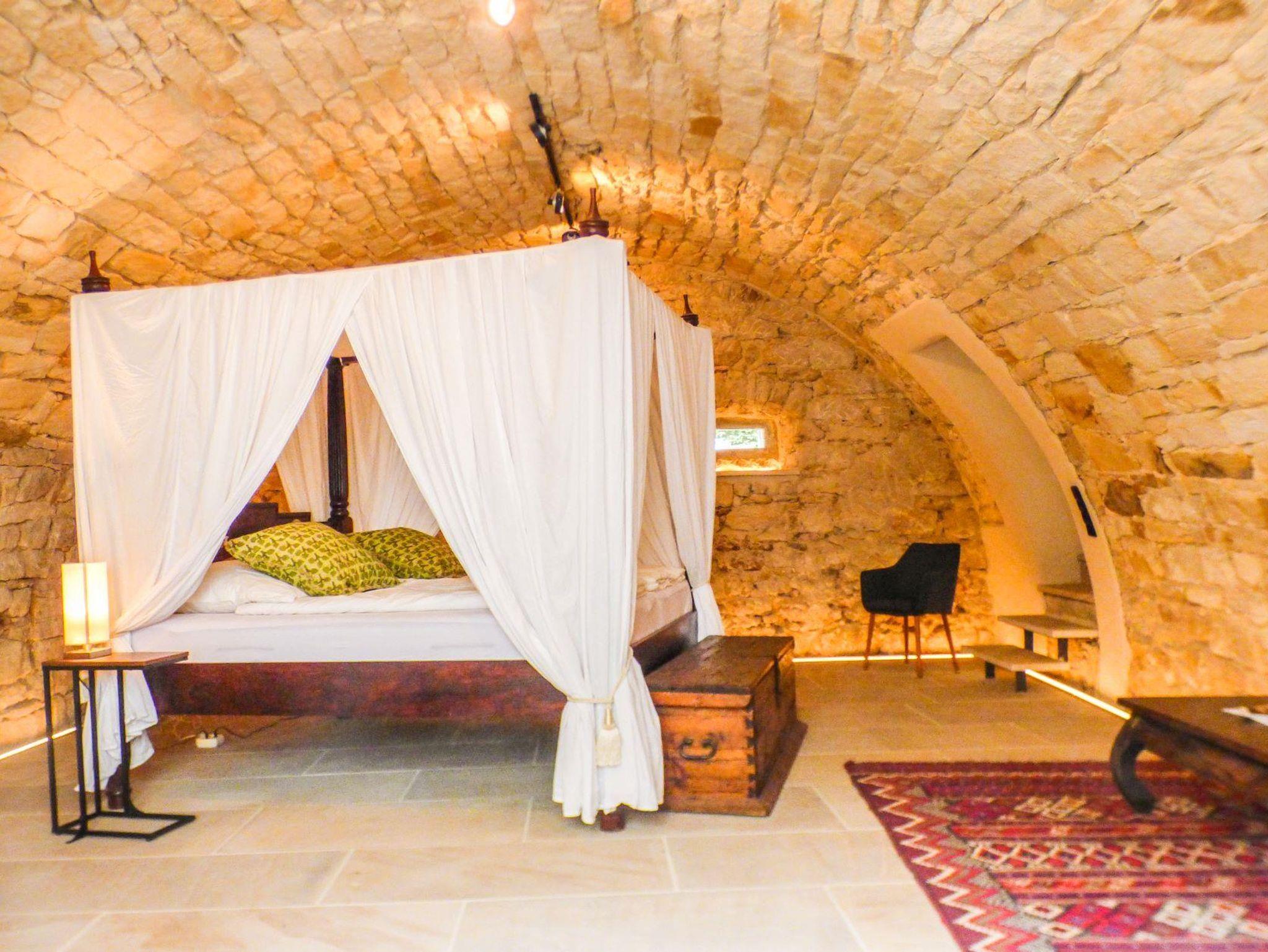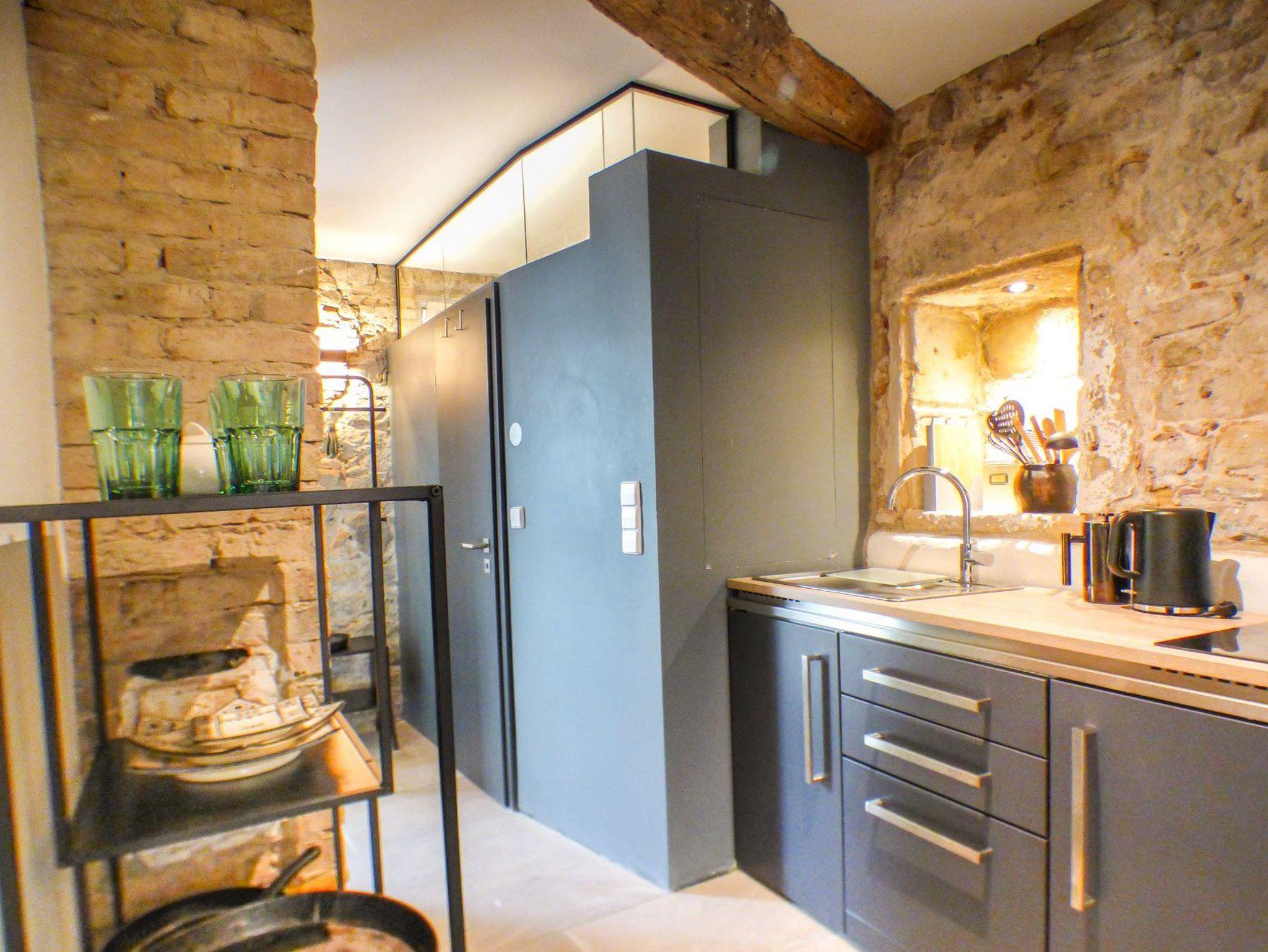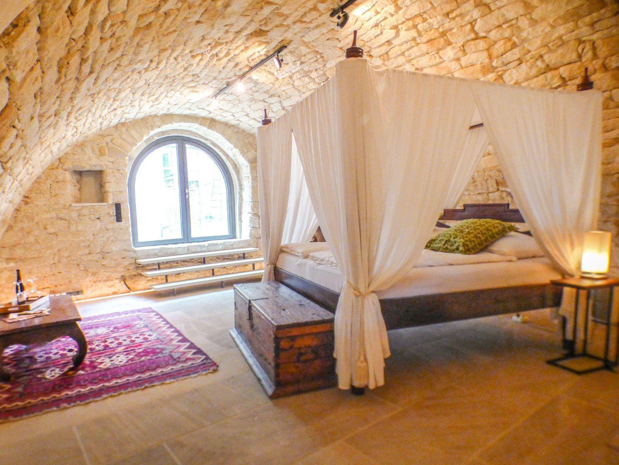 Im August 2022 ist nach aufwendigen Renovierungsarbeiten unsere 4. Ferienwohnung, unser Weinrefugium, fertig geworden. Die Ferienwohnung ist mit rund 70 m² unsere größte Unterkunft. Sie liegt im Erdgeschoss. Das großzügige und ausgefallene Schlafzimmer mit einem 2 auf 2 m großen Himmelbett aus Indien befindet sich in einem wunderschönen Gewölbe mit großer Rundbogentür und drei Nischenfenstern.Das Wohn- und Esszimmer ist geschmackvoll eingerichtet, ein ausziehbares Sofa ergänzt die Ausstattung. Funktional gestaltet sind die kleine kompakte Miniküchenzeile mit Kühlschrank, Geschirrspüler und 2 Kochplatten, als auch die Badzelle. Dem ursprünglichen Planung entsprechend wäre die Wohnung ein moderner Seminarraum geworden. Das Bad ist daher mit einem entsprechend kleinen Handwaschbecken ausgestattet. Mit Dusche und WC zusammen ist diese Ferienwohnung neben Goldberg ein zweites Raumwunder. Schmankerl am Rande: nach oben hin verglast lässt die Badzelle den Blick auf den wunderschönen Sandstein zu.
