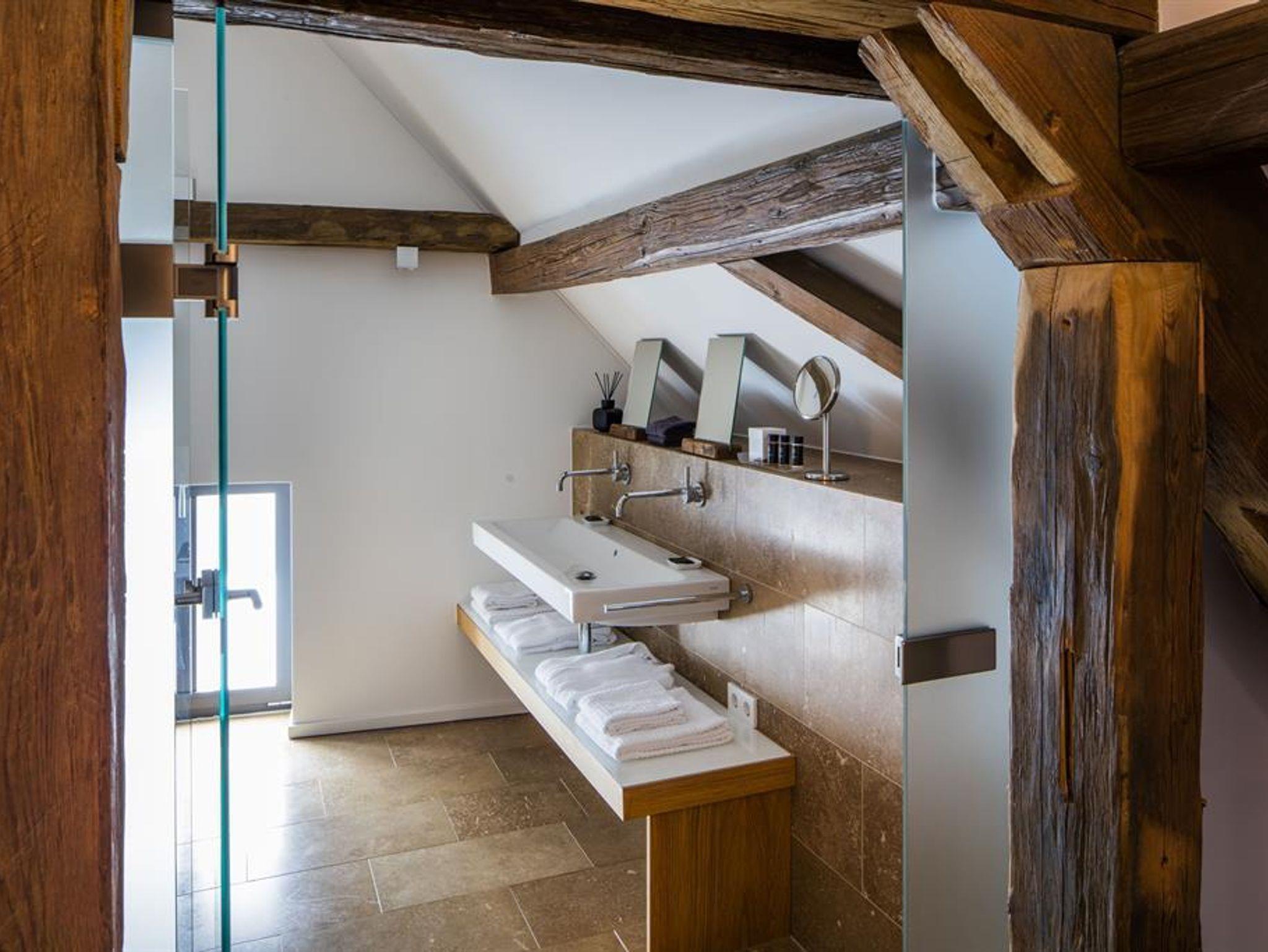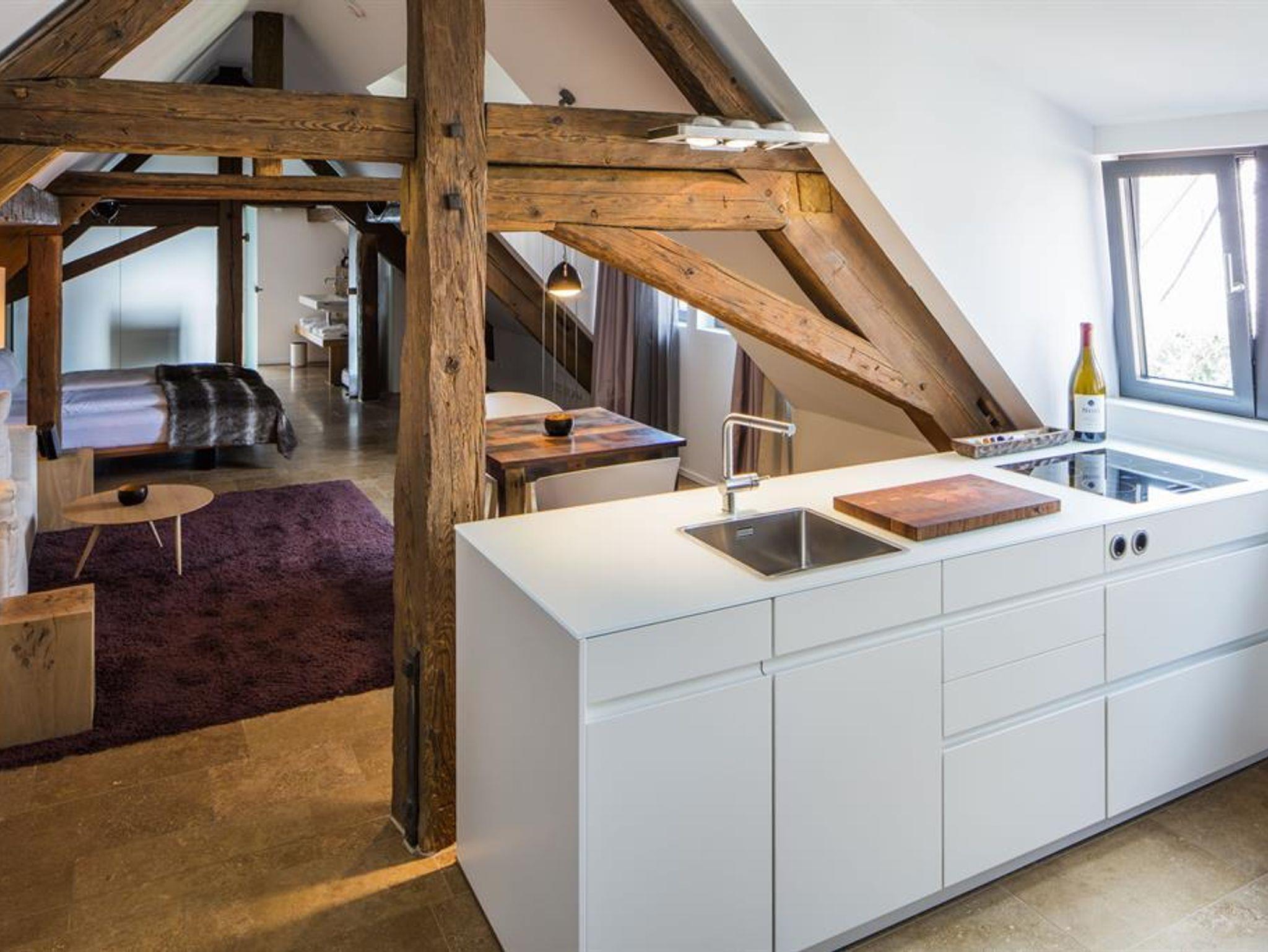 In diesem 55qm großen Studio finden Sie ein großzügiges, vom restlichen Studio getrenntes Bad mit ebenerdiger Dusche, Regenbrause, Bidet, WC und Doppelwaschbecken. Wohn- und Schlafraum sowie die hochwertigst ausgestattete Küche befinden sich in einem offenen Raum. Modernes Möbeldesign wurde hier liebevoll mit dem alten Dachgebälk modernisiert. In unserem herrlichen Innenhof stehen Ihnen Lounge Chairs sowie ein Sitzplatz mit Gartentisch zur Verfügung. Bitte beachten Sie, dass sich diese Wohnung auf Grund der baulichen Gegebenheit nicht 100%-ig verdunkeln läßt. Für Personen mit Gehbehinderung ist diese Wohnung nicht geeignet, da diese nur über einen Treppenaufgang erreicht werden kann.