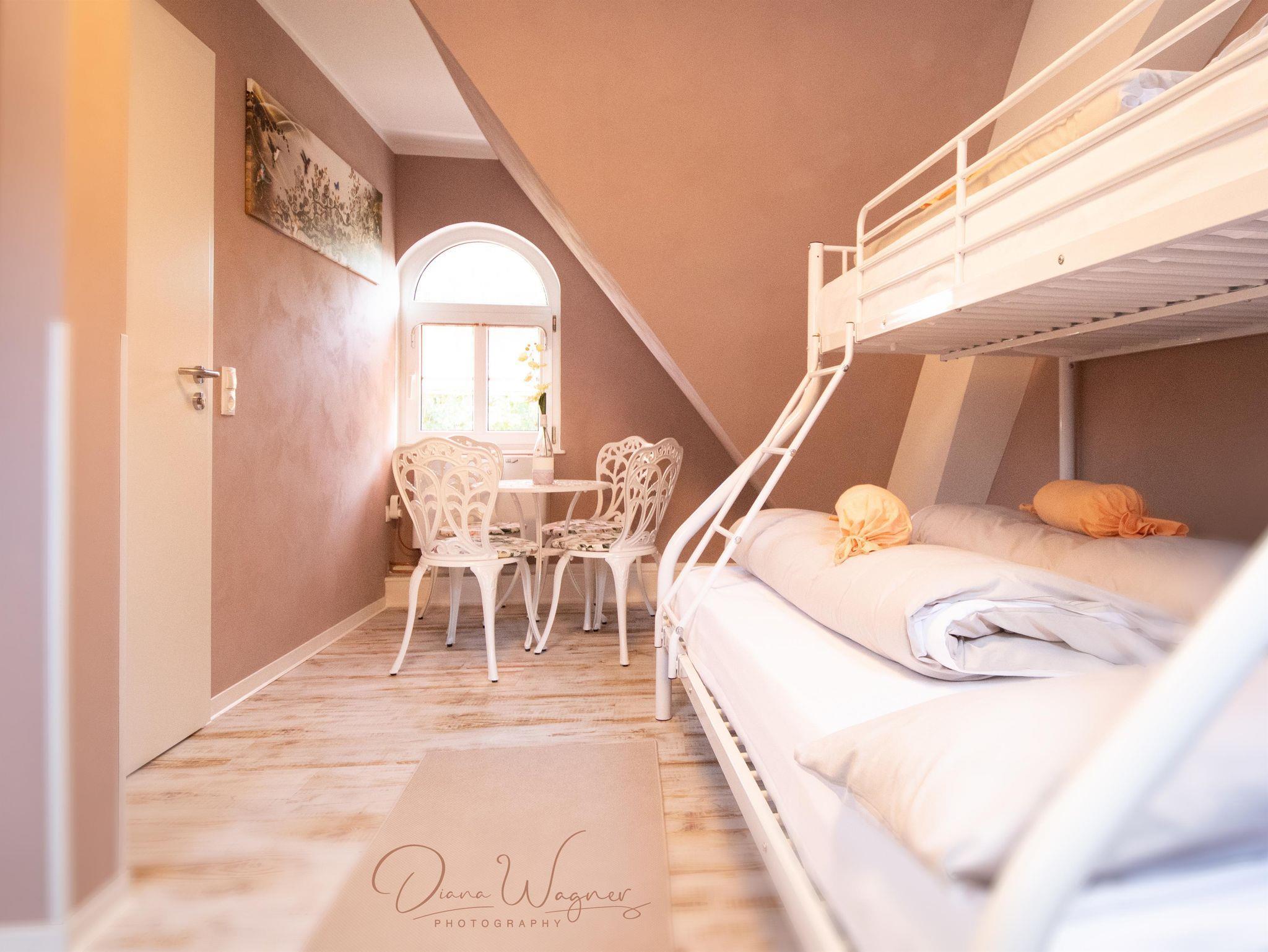 Die Bettenaufteilung ist wie folgt: ein Etagenbett (Ein Doppelbett mit einem darüberliegendem Einzelbett) und zwei Einzelbetten.